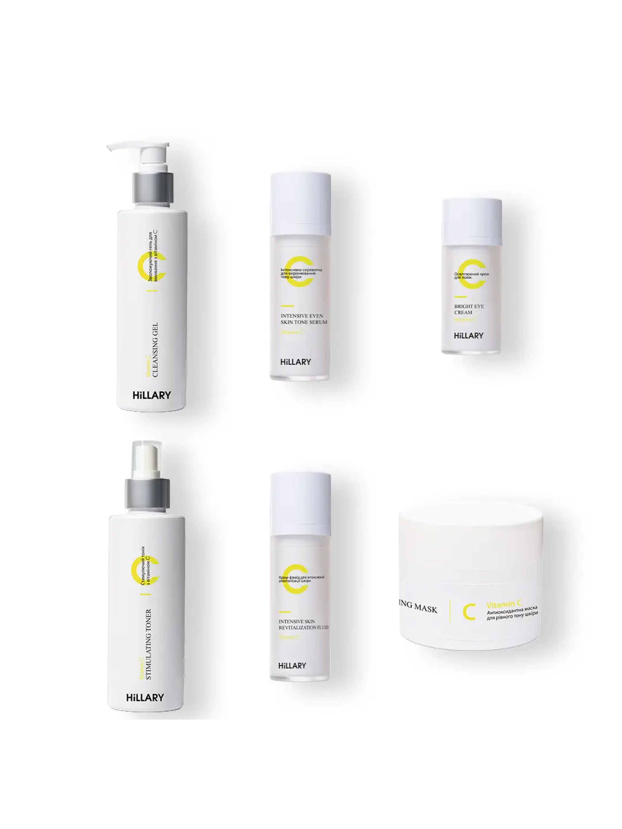 6 кроків до ідеальної шкір з потужним антиоксидантом вітаміном С, що ефективно доглядає за шкірою, усуває постакне та гіперпігментацію та сприяє вирівнюванню тону шкіри за рахунок вироблення колагену. Інтенсивна сироватка зі стабілізованою формою вітаміну С вирівнює тон, відновлює та надає шкірі здорового сяйва. Активно зволожує шкіру завдяки вмісту трегалози. Має антиоксидантну дію та захищає від руйнівної дії навколишнього середовища. Легкий крем-флюїд для обличчя з вітаміном С захищає від руйнівних факторів зовнішнього середовища, які призводять до старіння, втоми та зморшок. Крем для повік з вітаміном С захищає від перших ознак старіння, запобігаючи їхній появі або усуваючи вже наявні недосконалості. Тонік миттєво зволожує, освіжає шкіру та наповнює її сяйвом. Допомагає активним компонентам доглядових косметичних засобів легко проникати в глибокі шари шкіри. Гель для м'якого очищення повністю позбавляє шкіру обличчя від косметики та забруднень, а також стежить за здоров’ям клітин епідермісу. Усуває сухість та лущення на шкірі, залишаючи відчуття шовковистості та гладкості. Має легкий освітлюючий ефект та антиоксидантну дію завдяки вмісту стабілізованого вітаміну С. Маска з вітаміном С, що покращує стан тьмяної, пігментованої та в'янучої шкіри, омолоджує і підтягує. Має антиоксидантну дію, нейтралізує вільні радикали, зменшує прояви гіперпігментації, висвітлюючи та вирівнюючи колір шкіри. Розгладжує і зволожує шкіру, активуючи природний синтез колагену. Після застосування маски шкіра виглядає оновленою, набуває здорового кольору та тонусу. Підходить для шкіри різних типів. До набору входять: Зволожуючий гель для умивання з вітаміном С Hillary Vitamin С Мoisturizing Cleansing Gel, 150 мл; Інтенсивна сироватка для вирівнювання тону шкіри з вітаміном С Hillary Vitamin C Іntensive Еven Skin Tone Serum, 30 мл; Антиоксидантна маска для рівного тону шкіри з вітаміном С Hillary Vitamin C Antioxidant Healthy Brightening Mask, 50 мл; Освітлюючий крем для повік з вітаміном С Hillary Vitamin С Bright Eye Cream, 15 мл; Крем-флюїд для інтенсивної ревіталізації шкіри з вітаміном С Hillary Vitamin C Intensive Skin Revitalization Fluid, 30 мл; Стимулюючий тонік з вітаміном С Hillary Vitamin C Stimulating Toner, 200 мл. Спосіб застосування: Спіньте гель в долонях і нанести на шкіру масажними рухами. Змити великою кількістю води. При потраплянні в очі, негайно промити їх водою. ; Просочіть косметичний диск тоніком і протріть шкіру обличчя, шиї та зони декольте. Може використовуватися вранці та ввечері після процедури очищення шкіри. Підходить для щоденного використання. Нанесіть інтенсивну сироватку на очищену шкіру тонким шаром, дати увібратися 10-15 хвилин. Нанесіть освітлюючий крем під очі легкими рухами на очищену шкіру навколо очей. Рекомендовано використовувати вранці та ввечері. Нанесіть крем-флюїд на очищену шкіру обличчя та шиї легкими масажними рухами. В якості додаткового догляду 2 рази на тиждень використовуйте маску: рівномірно нанесіть щільний шар маски на шкіру обличчя, уникаючи області навколо очей. Залиште на 10-15 хвилин. Потім вологими руками злегка помасажуйте шкіру круговими рухами, після чого ретельно змийте залишки маски прохолодною водою.