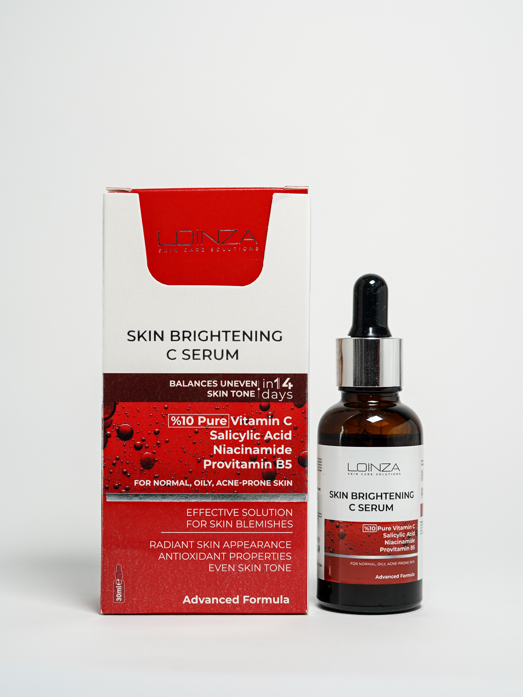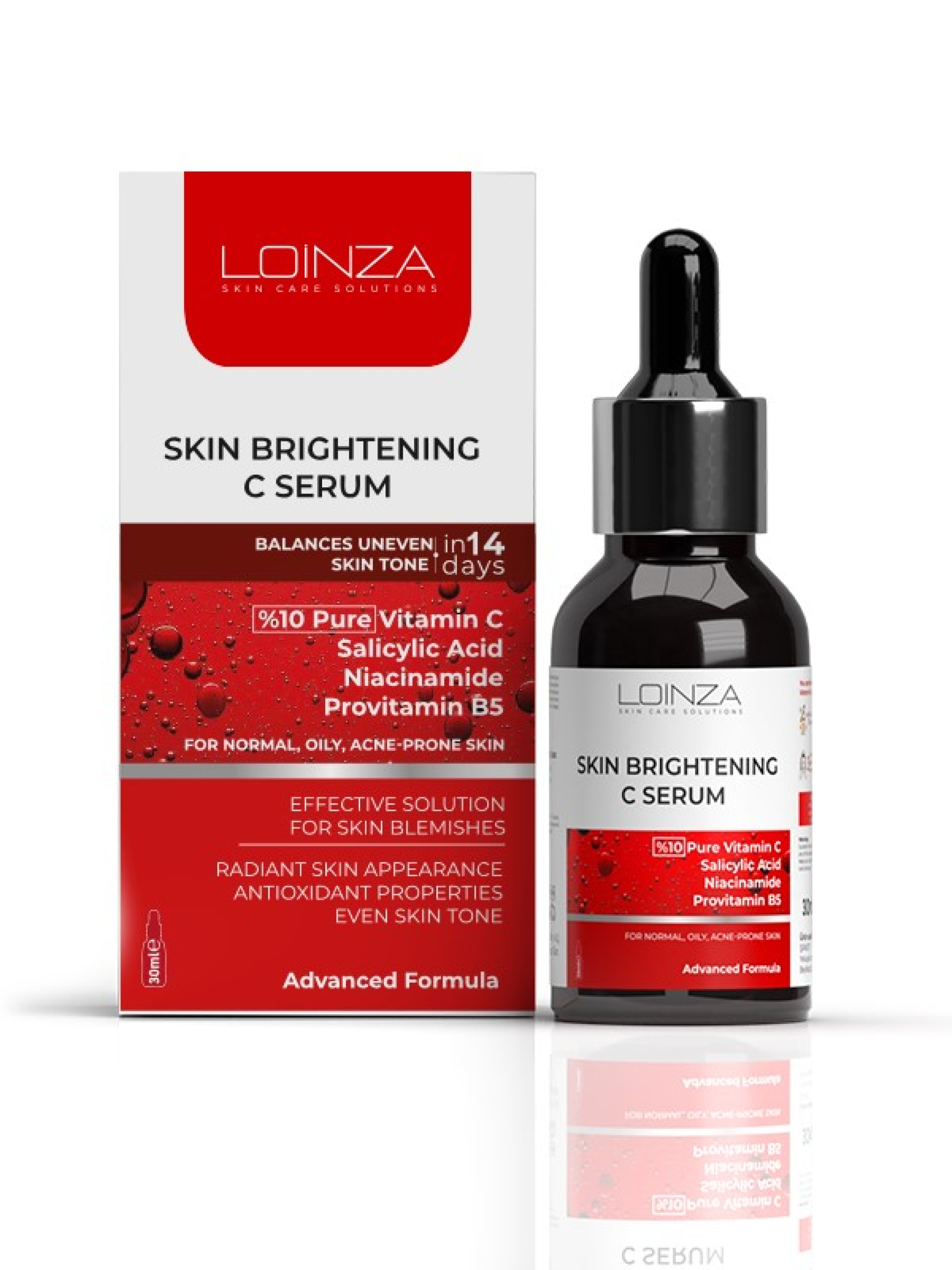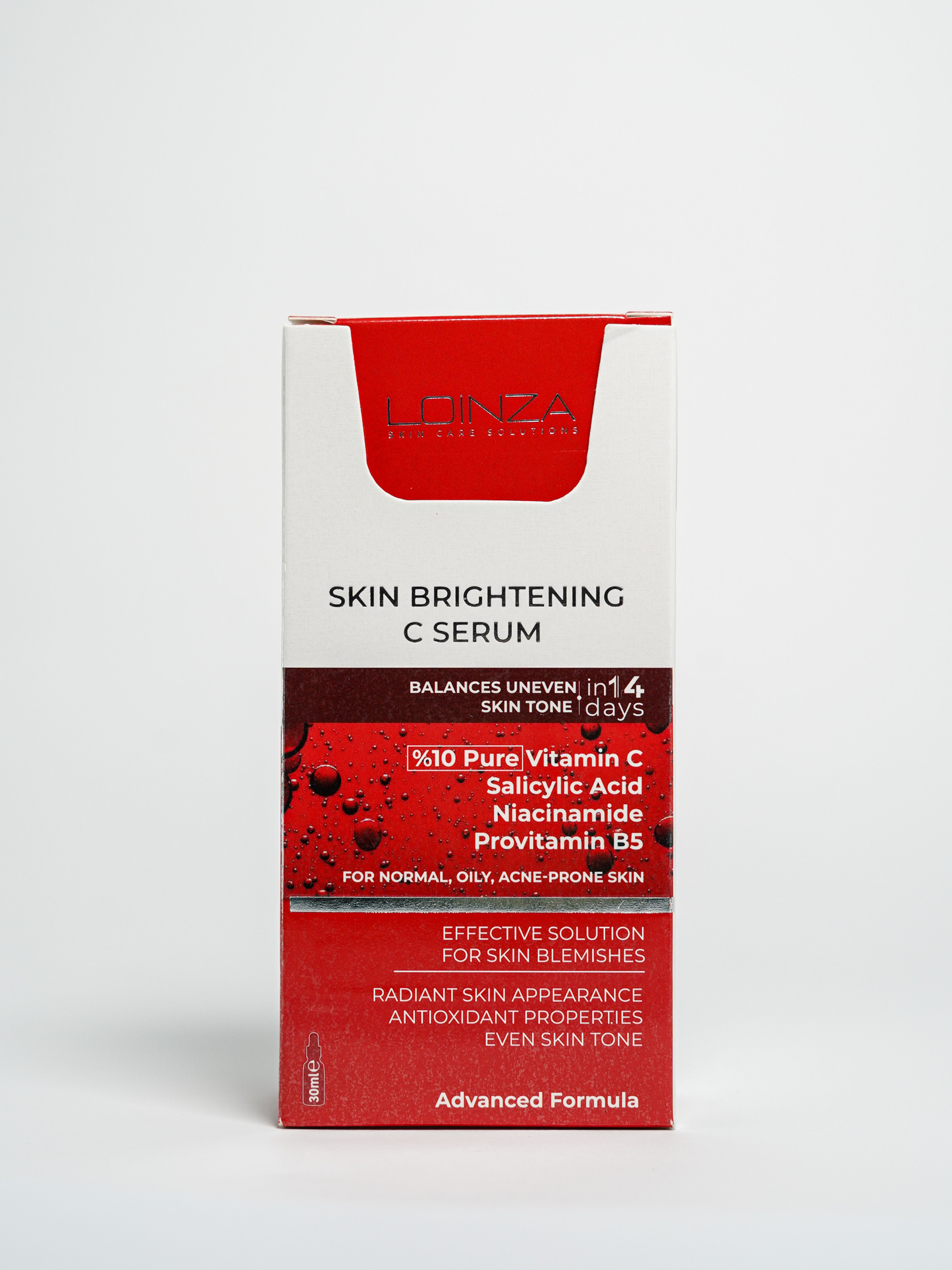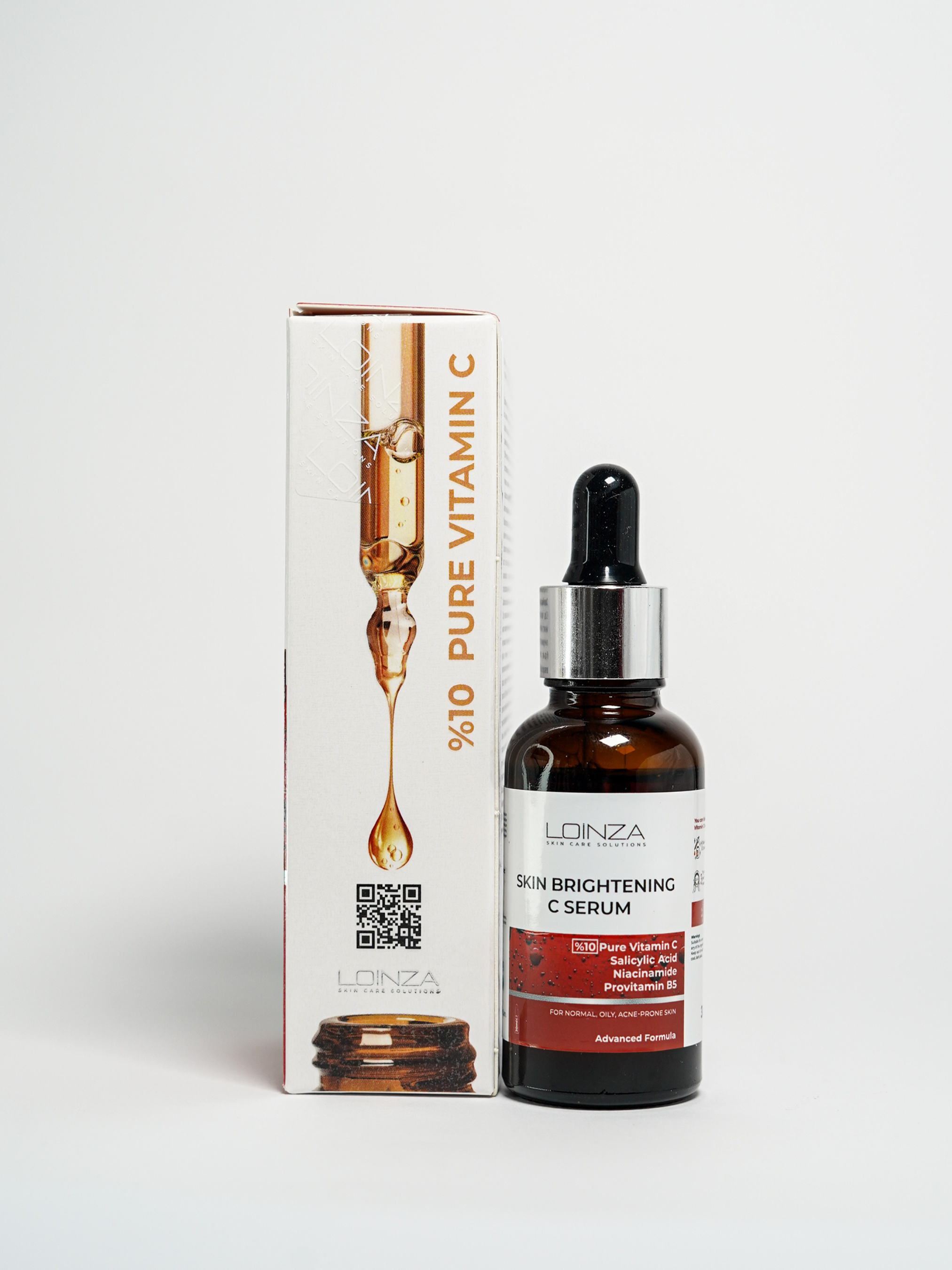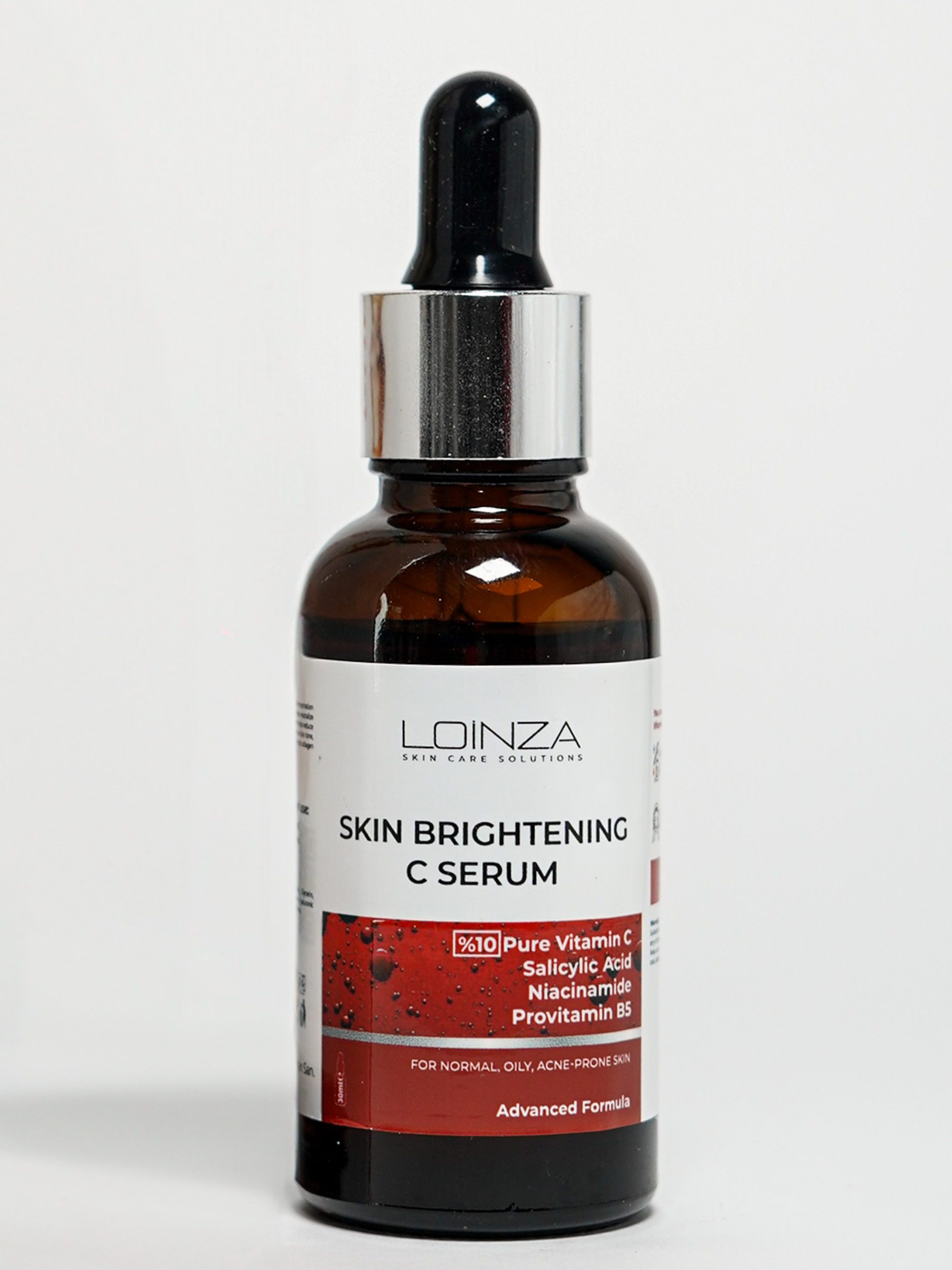 Збагачена вітаміном С 10%, сироватка Loinza має помітний освітлюючий ефект. Вітамін С має антиоксидантні властивості, які допомагають зміцнити природний захисний бар’єр шкіри, підтримує водний баланс шкіри, допомагає зменшити дефекти шкіри та ознаки старіння. При регулярному використанні сироватка істотно поліпшує тон шкіри і зменшує пігментні плями. Підходить для всіх типів шкіри, включаючи чутливу. Використання: Нанесіть 4-5 крапель на чисту шкіру обличчя та шиї і промасажуйте круговими рухами та завершіть догляд зволожуючим кремом. У разі використання вранці, обов’язково користуйтеся сонцезахисним кремом з SPF не нижче 30. Запобіжні заходи: Тільки для зовнішнього використання. Слід уникати контакту з очима. Під час використання можуть виникнути такі побічні ефекти, як легке печіння, почервоніння та подразнення. При наявності алергії на будь-яку речовину у складі продукту, перед використанням потрібно зробити тест: нанести декілька крапель продукту на внутрішню поверхню ліктя і зачекати 10-20 хвилин. Має сенсибілізуючу реакцію на сонячне світло, збільшуючи чутливість шкіри до сонця, тому найкраще підходить для використання ввечері. Умови зберігання: Зберігайте продукт в оригінальній упаковці подалі від світла. Тримайте в недоступному для дітей місці. Склад: Aqua, Ascorbic Acid, Propylene Glycol, Ethyl Alcohol, Glycerin, Panthenol, Niacinamide, Phenoxyethanol, Polysorbate 20, Fragrance, Hyaluronic Acid, Allantoin, Salicylic Acid, Alpfa-Tocopherol Acetate, Ethyl hexylglycerin.