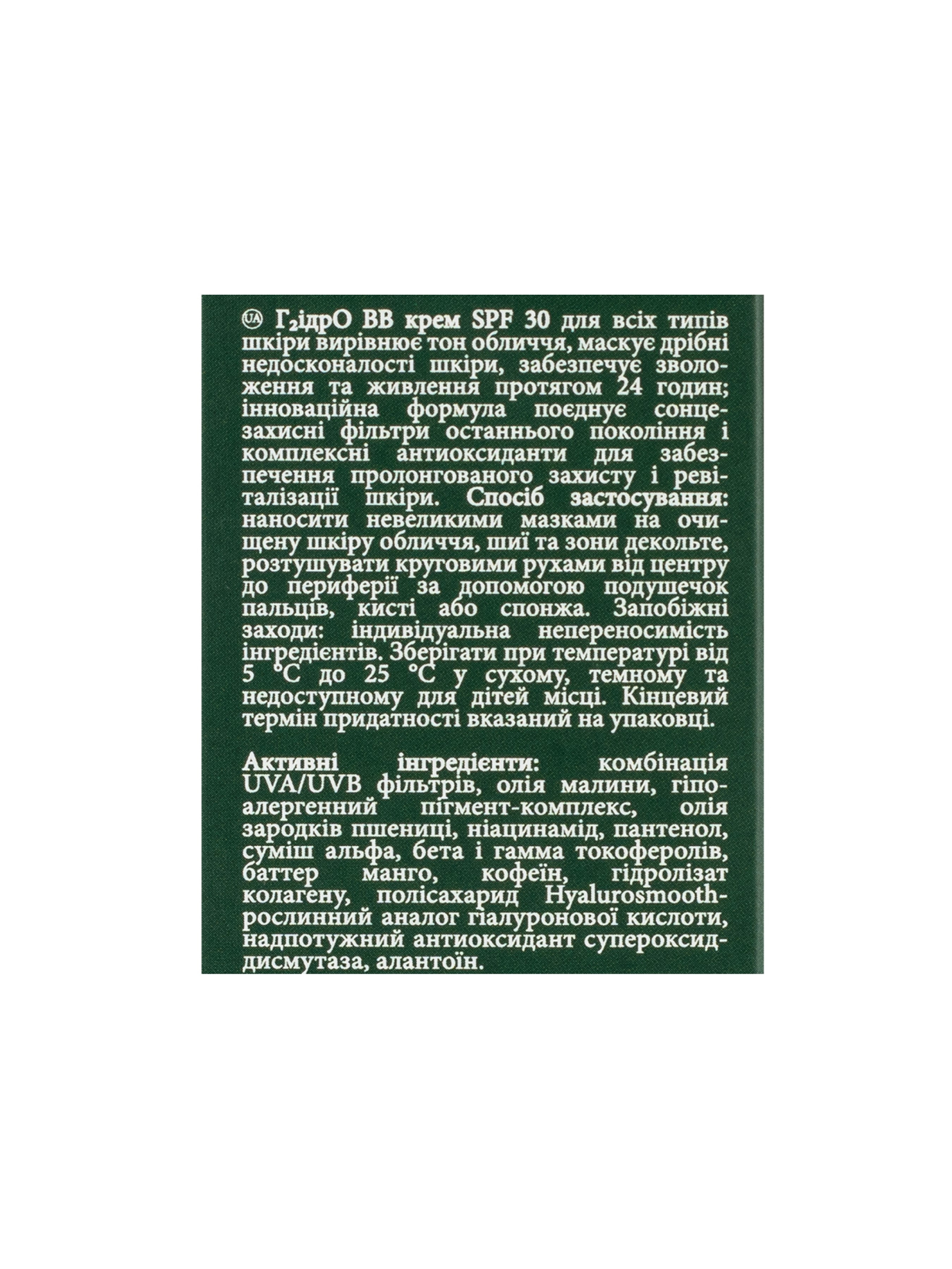Зволожуючий ВВ крем SPF 30 (темний беж) вирівнює тон і приховує дрібні недоліки шкіри. У складі ВВ крему міститься Hyalurosmooth - рослинний аналог гіалуронової кислоти, він інтенсивно зволожує шкіру і покращує колір обличчя, додає шкірі ефект сяйва. Комплекс цінних олій оливи, зародків пшениці, малини і баттер манго гарантують живлення вашій шкірі протягом 24 годин. Інноваційна формула H2ydrO BB cream SPF 30 поєднує в собі сонцезахисні фільтри останнього покоління UVA / UVB і комплекс потужних антиоксидантів токоферолів, супероксиддисмутази і ніацинаміда, які захистять вашу шкіру від фотостаріння, допоможуть боротися з вільними радикалами і агресивними проявами навколишнього середовища. Крім цього ВВ крем містить аллатоїн, що забезпечить додатковий anti-age ефект прискорює регенерацію тканин і сповільнить процеси старіння.