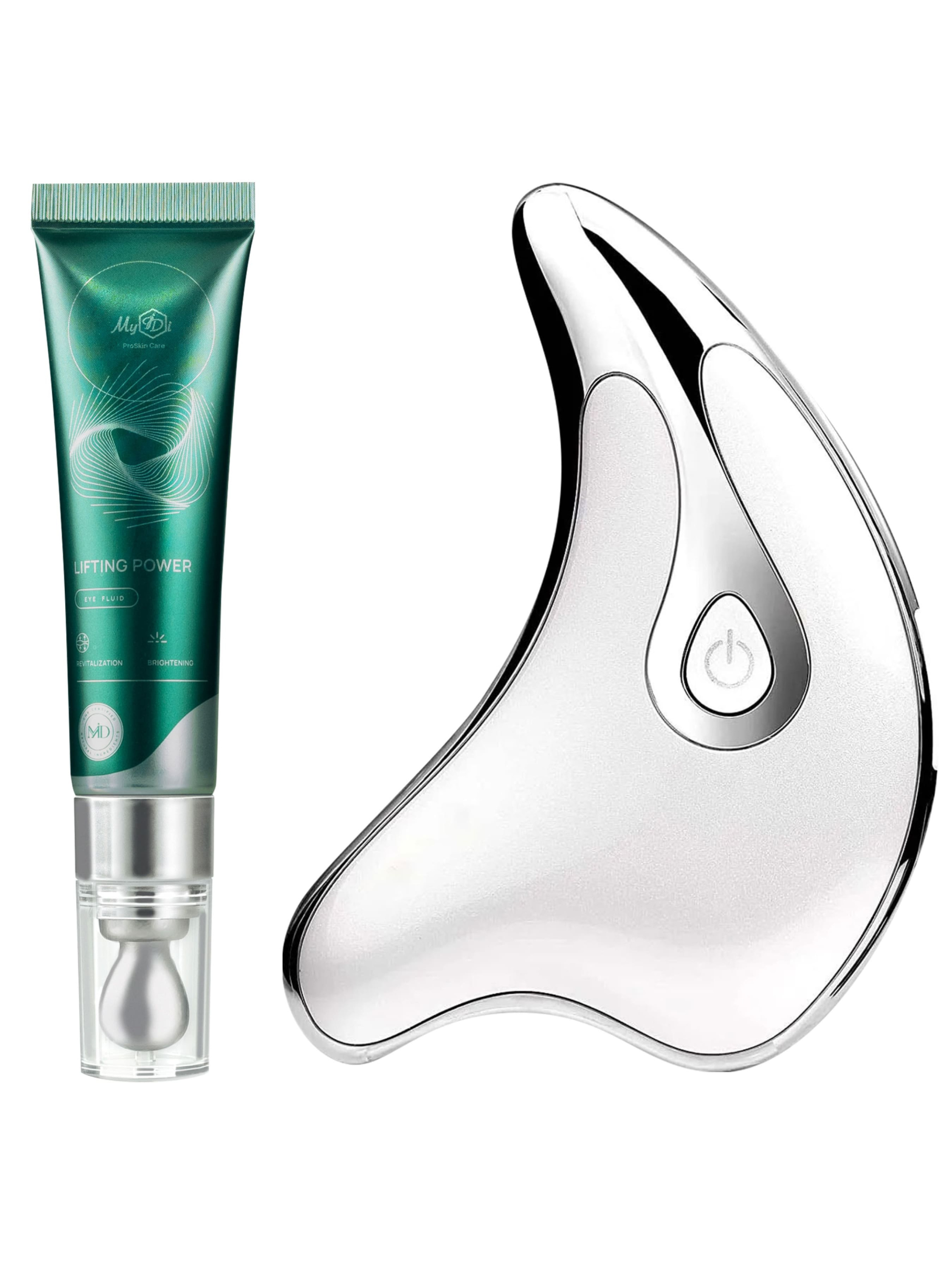 Набір омолоджуючий для догляду та масажу навколо очей «Lifting power» з флюїдом та ліфтинг масажером Гуаша MyIDi SET LIFTING POWER with Lifting Power eye fluid/15ml + Vibro Massager Gua Sha Цей сет спеціально призначений для тих, хто бажає розгладити зморшки, омолодити та зволожити шкіру навколо очей. Інноваційна розкішна формула омолоджуючого флюїду включає 5 пептидів, стовбурові клітини, аденозин, ніацинамід, омега 3, 6, 9 та вітамін С. Дія пептидів в засобі: •Пальмітоїлтетрапептид-7 відновлює шкіру та відчуття пружності, відомий своєю заспокійливою дією, зменшує зморшки. •Palmitoyl tripeptide-1 розгладжує дрібні зморшки та збільшує вироблення колагену. Деякі дослідження показали, що цей пептид має подібні переваги проти старіння, ніж ретинол. •Аргірелін призначений для зменшення зморшок навколо очей. Він працює аналогічно ботоксу. Він підтягує шкіру і зменшує зморшки, викликані посмішкою, щуренням й іншими твердими рухами. Це запобігає утворенню нових зморшок на шкірі, а також відновлює та розгладжує будь-які попередні зморшки. •Пальмітоїлгексапептид-12 зміцнює шкірний бар’єр, покращує утримання вологи, роблячи шкіру еластичною. Як сигнальний пептид, він може «сказати» шкірі виглядати молодшою. Також у складі є популярний зараз інгредієнт – ніацинамід. Його основна властивість – підвищення пружності та еластичності шкіри, зменшення видимості дрібних зморшок. А вітамін С у складі освітлює пігментацію і стимулює синтез колагену. Він має протизапальну та захисну дію на UVA і UVB-випромінювання. INCI: Aqua, Isoamyl Laurate, Isoamyl Cocoate, Caprylyl-Caprylate/Caprate, Jojoba Seed Oil, Hydrolyzed Rice Protein, Tribehenin, Ethylhexyl Palmitate, Trihydroxystearin, Sodium Hyaluronate, Hesperidin Chlorhexidine Digluconate, Palmitoyl Tetrapeptide-7, Sorbic Acid, Palmitoyl Tripeptide-1, Acetyl Hexapeptide-8, C12-15 Alkyl Benzoate, Tribehenin, Ceramide NG, PEG 10 Phytosterol, Palmitoyl Hexapeptide-12, Palmitoyl Tetrapeptide-3, Caesalpinia Spinosa Gum, Glucomannan, Xanthan Gum, Potassium Sorbate, Sodium Benzoate, N-Hydroxysuccinimide, Benzoic Acid, Sodium Dextran Sulfate, Chrysin, Tocopherol. А масажер Гуаша допомагає досятнути більш швидкого та видимого результату. Протипоказання до використання ліфтинг масажера Гуаша: •гострі запалення на шкірі (купероз, екзема, герпес, гіподермія і т. п.); •велика кількість родимок і папілом; •подряпини і садна на шкірі; •алергічні реакції шкіри; •сонячні опіки; •вагітність; •онкологічні захворювання; •нервово-психічні захворювання; •не рекомендується використовувати в період гострих захворювань організму.