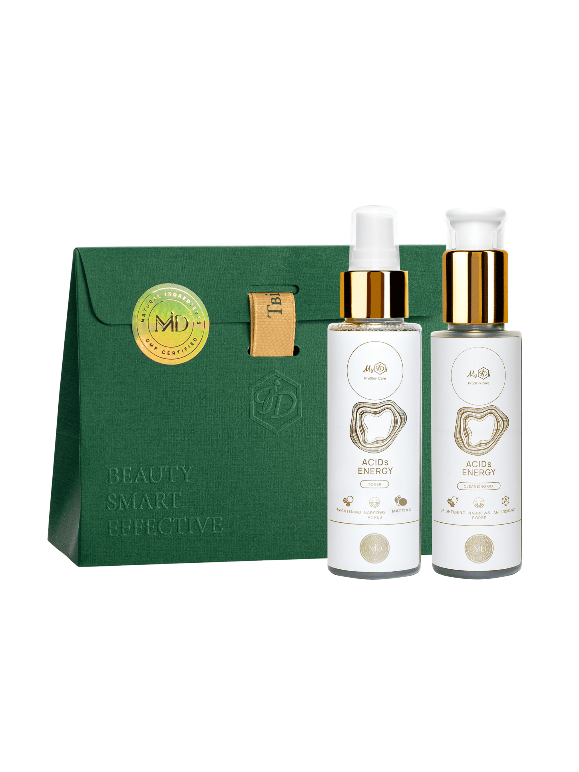 Подарунковий набір щоденного очищення з AHA+BHA+PHA кислотами MyIDi Everyday cleansing SET ACIDs ENERGY (Acids Energy сleansing gel/100 ml + Acids Energy toner/100 ml) Цей набір ідеально підходить для глибокого і в той же час щадного очищення всіх типів шкіри, а особливо схильної до жирності та висипань. Очищувальний гель з AHA/BHA/PHA кислотами «Енергія кислот» забезпечує м'яке очищення та ексфоліацію, ефективно видаляє всі види забруднень, звужує пори та нормалізує себорегуляцію, освітлює, забезпечує антиоксидантний захист, дарує неймовірне відчуття свіжості, відновлення та сяйва. А тонер «Енергія кислот» з комплексом AHA+BHA+PHA кислот м'яко відлущує ороговілі клітини та розчиняє сальні пробки, зменшує запалення та попереджає появу висипів. Заспокоює подразнену шкіру, усуває сухість та лущення, відновлює та підтримує оптимальний рівень зволоженості після вмивання. Використання тонеру з комплексом AHA+BHA+PHA кислот покращує текстуру шкіри, перешкоджає забиванню пор та появі чорних цяток, регулює роботу сальних залоз, перешкоджає появі жирного блиску, прискорює процеси загоєння. Використання гелю та тонеру з комплексом AHA+BHA+PHA кислот допоможе позбутися таких проблем, як запалення на шкірі, прищі та вугрі, забиті пори, постакне та посилене вироблення себуму, а також жирна шкіра. Склад: 1. Очищувальний гель «Енергія кислот» з комплексом AHA+BHA+PHA кислот MyIDi ACIDs ENERGY сleansing gel, 100 мл INCI: Aqua (Water), Sodium Cocoamphoacetate, Cocamidopropyl Betaine, Glycerin, Mandelic Acid, Salicylic Acid, Glycolic Acid, Vitis Vinifera Extract, Niacinamide, Citrus Aurantium Dulcis (Orange) Peel Oil, Citric Acid, Gluconolactone, Sodium Hydroxide, Lactobionic Acid, Hydroxyethylcellulose, Lactic Acid, Glyceryl Glucoside, Dipropylene Glycol, Ethylhexylglycerin, Caprylhydroxamic Acid, Pseudozyma Antarctica Ferment Extract, Pseudoalteromonas Ferment Extract, 1,2-Hexanediol. 2.. Тонер «Енергія кислот» з комплексом AHA+BHA+PHA MyIDi ACIDs ENERGY toner, 100 мл INCI: Aqua (Water), Mandelic Acid, Glycerin, Azelaic Acid, Lactic Acid, Vitis Vinifera Extract, Inonotus obliquus Extract, Niacinamide, Citrus Aurantium Dulcis (Orange) Peel Oil, Citric Acid, Gluconolactone, Foeniculum vulgare Extract, Sodium Hydroxide, Lactobionic Acid, Hydroxyethylcellulose, Ferulic Acid, Glyceryl Glucoside, Dipropylene Glycol, Ethylhexylglycerin, Caprylhydroxamic Acid, Pseudozyma Antarctica Ferment Extract, Pseudoalteromonas Ferment Extract, 1,2-Hexanediol.