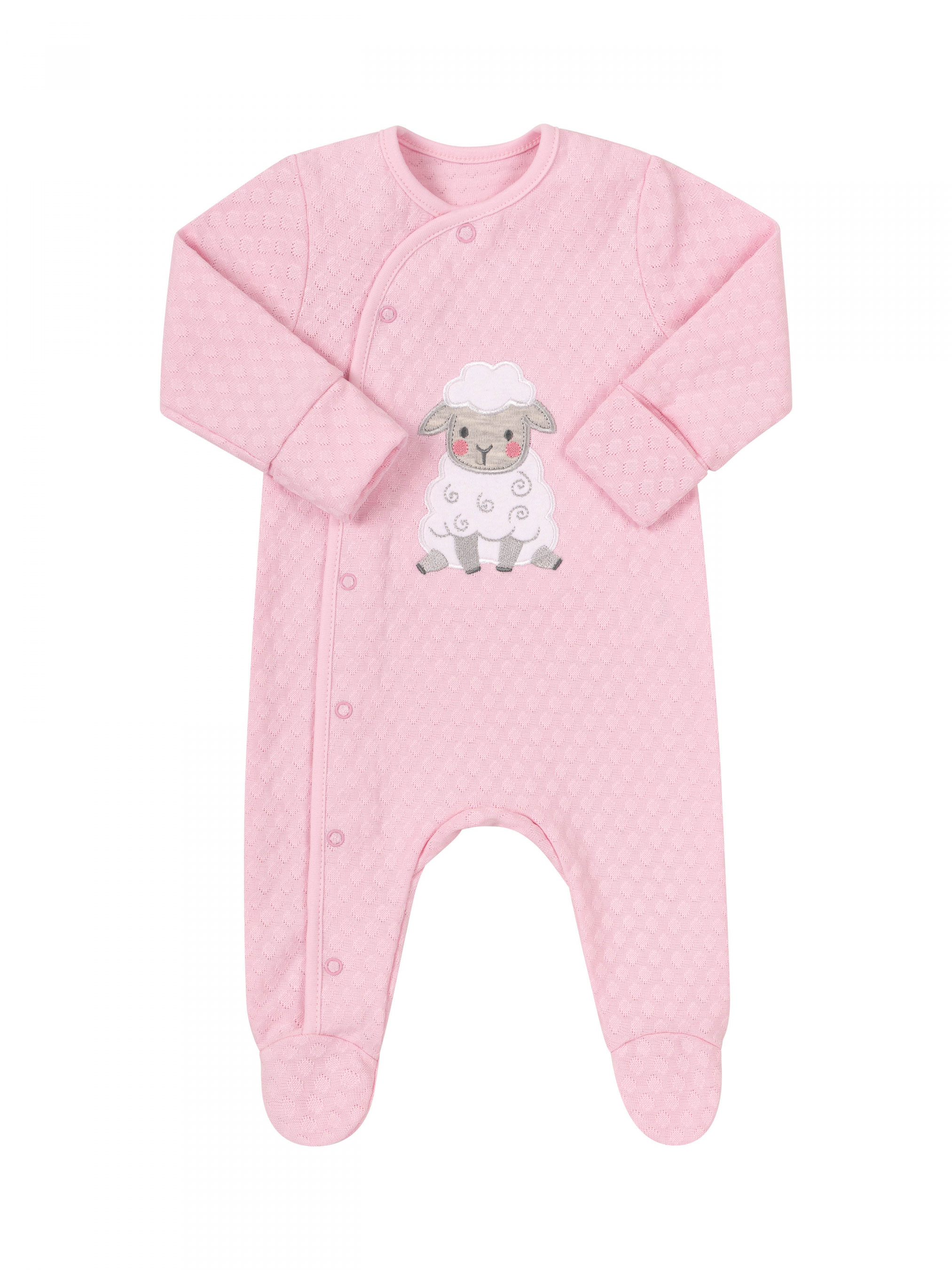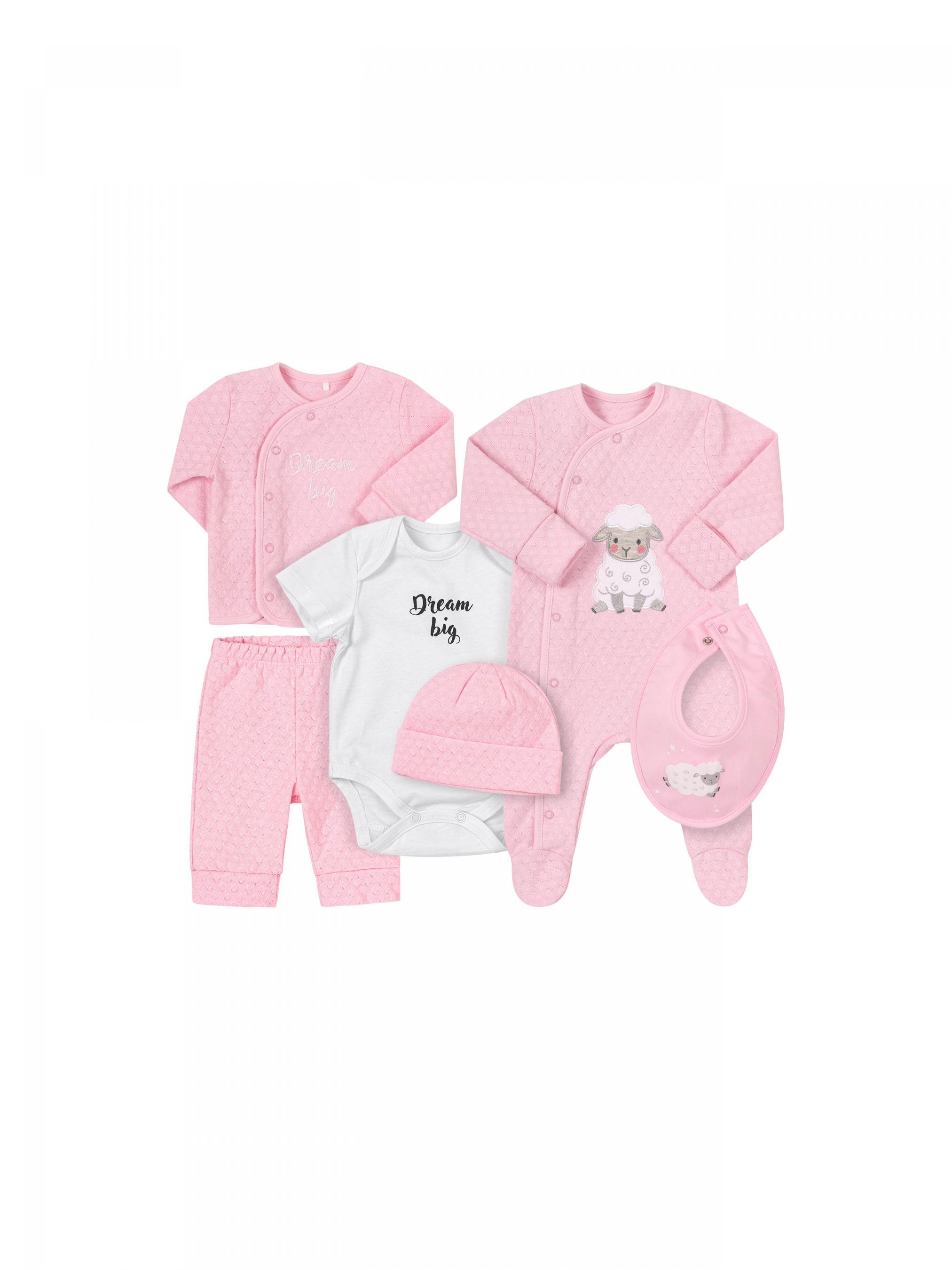 Комплект для новонародженого. Складається з - кофти, яка застібається на кнопки по всій довжині, штанів на резинці, боді з довгим рукавом, комбінезона з закритими ніжками, який застібається по всій довжині на кнопки збоку. Шапка знизу підвернута. Нагрудний фартух застібається на кнопки. Всі речі крім боді та фартуха з ажурного матеріалу. Комплект йде в подарунковому пакуванні.
