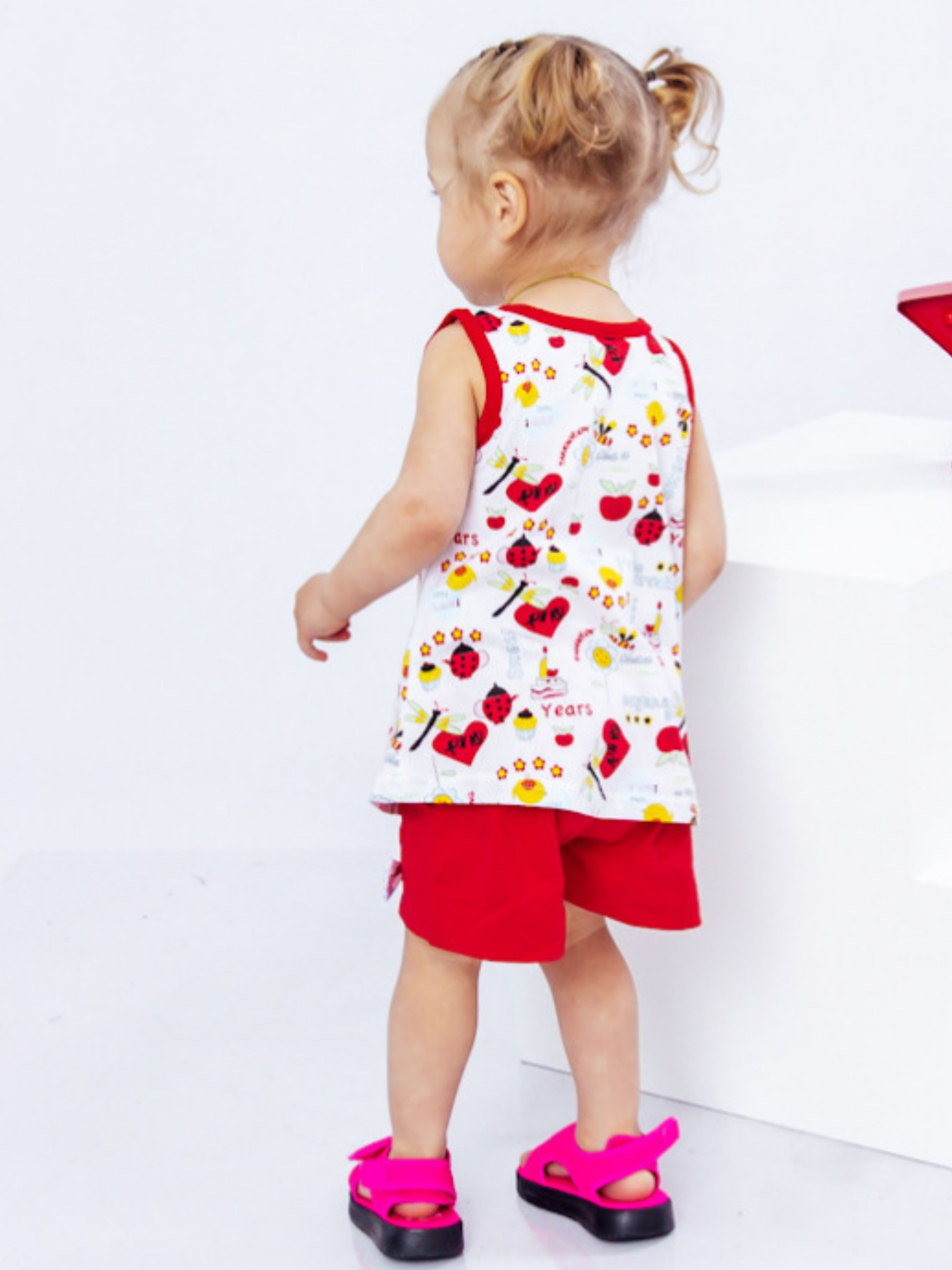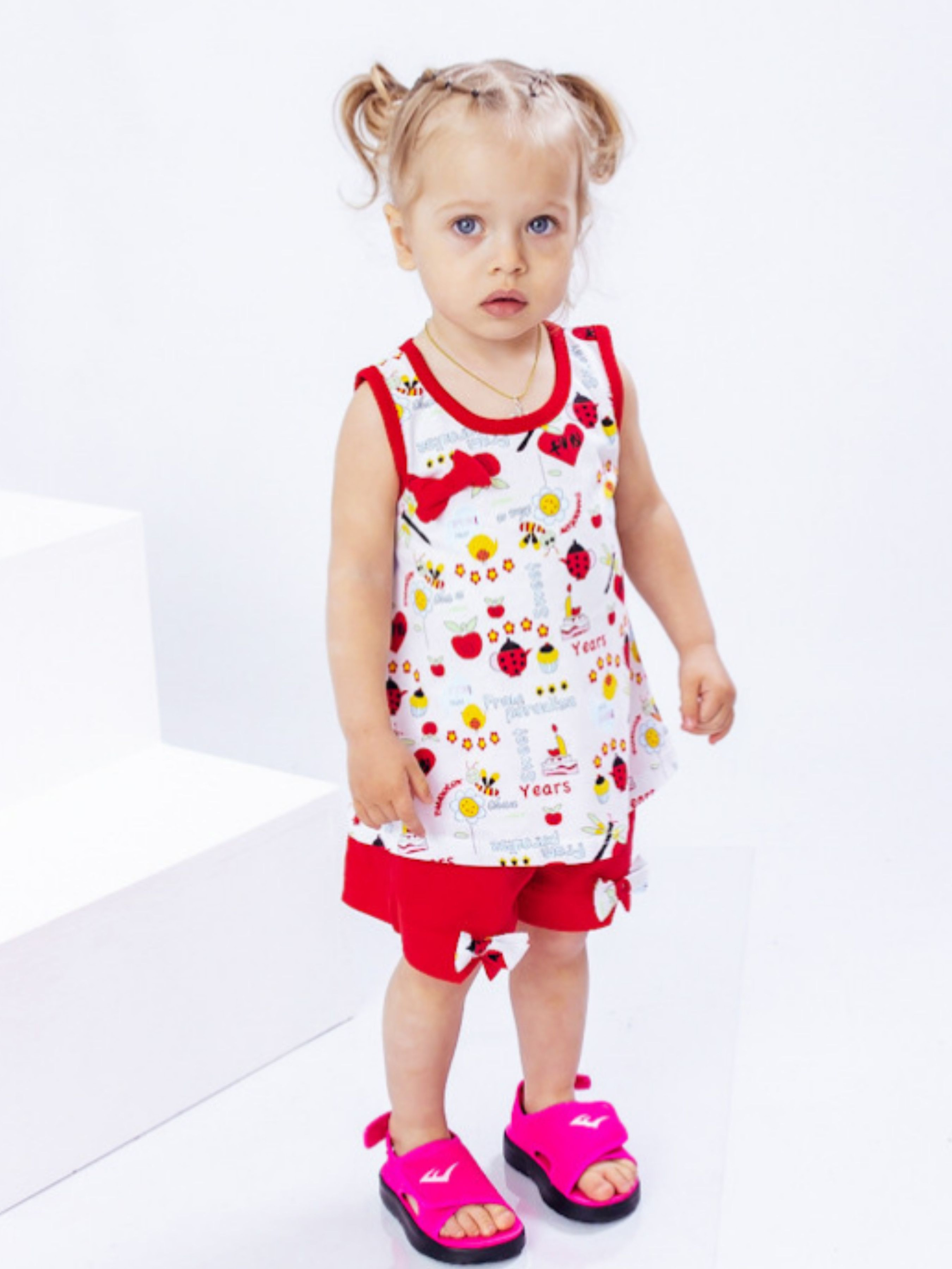 Полотно: кулір однотонний кулір принтований Склад полотна: 100% бавовна Зріст: 86-104 Літо - час для активних ігор і яскравих фарб в гардеробі дівчинки. Саме тому для милих маленьких принцес потрібно вибирати барвисті практичні набори в яких буде зручно грати і знайомитися з величезним і неймовірно цікавим оточуючим світом. Для цих цілей дизайнери бренду Носи Своє створили комплект для дівчинки що складається з сукні-маєчки та шортів. Поєднання червоного і прінтованого полотна виглядає яскраво і красиво. Вкорочене плаття-маєчка з круглою горловиною подарує дитині комфорт завдяки вільному крою. Шорти прикрашені милими бантиками надійно фіксуються на талії за допомогою широкої еластичної резинки. Важливо що вона не тисне і не залишає слідів на ніжній шкірі. Для пошиття виробу використано м'яке і легке полотно в складі якого містяться волокна бавовни. Натуральні нитки «відповідають» за проникнення повітря та гігроскопічність. Догляд: допускається машинне або ручне прання ПОПЕРЕДНЬО вивернувши навиворіт при Т не вище 30 ° С з використанням неагресивних засобів для прання. При полосканні краще використовувати кондиціонер. Верх прати окремо від шортів. Сушка в розправленому вигляді. Прасувати виріб з виворітного боку.