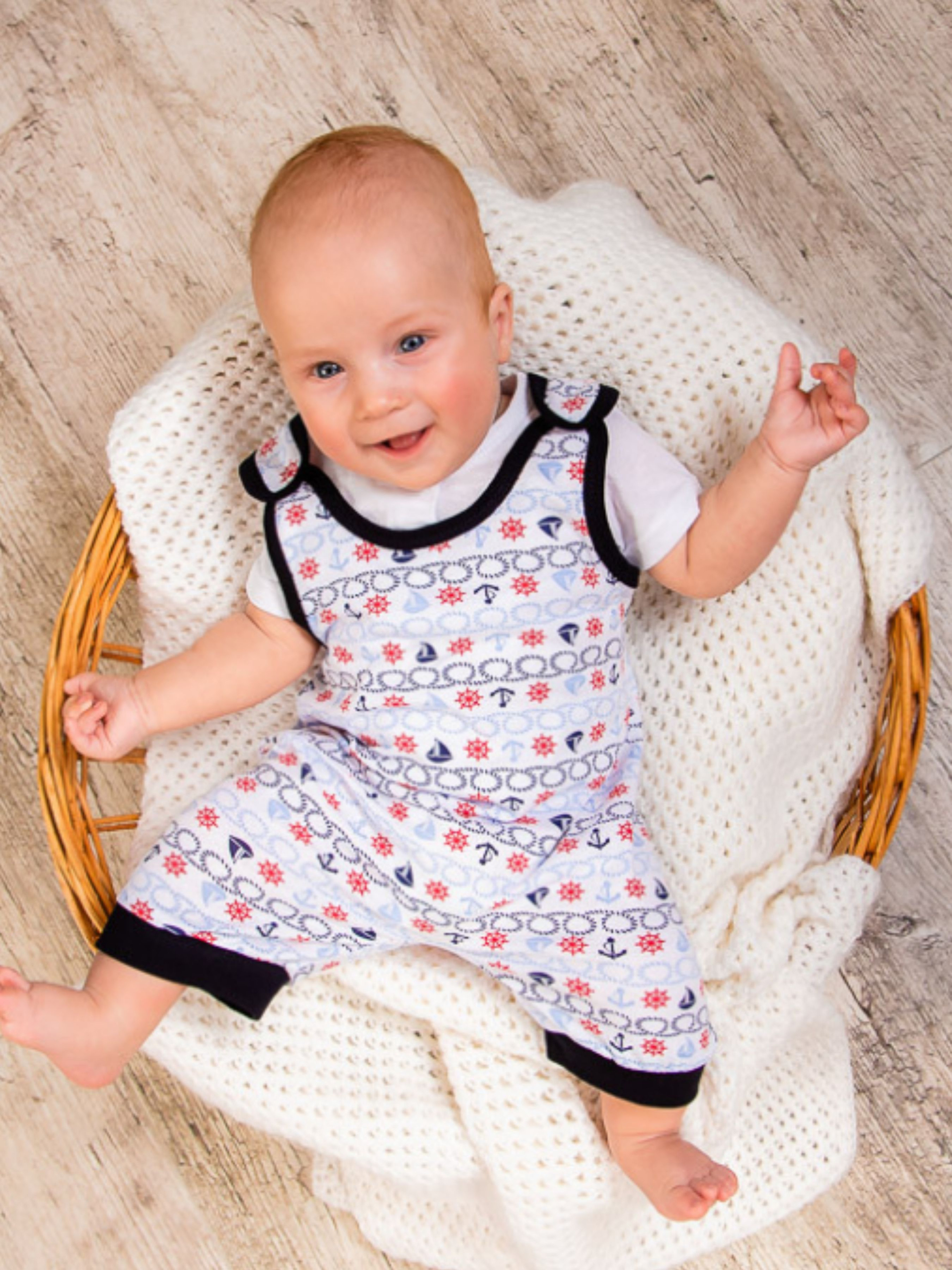 Полотно: кулір набивний Склад полотна: 100% бавовна Зріст: 56-68 Літній ясельний комплект для хлопчика (футболка + комбінезон) виконаний з набивного куліра. Головна перевага полотна - одяг з нього дозволяє тілу дихати і провітрюватися. Футболка білого кольору на планці застібається на кнопки для більш зручного одягання. Комбінезон на плечах і між ніжок застібається на кнопки. Виріб з укороченими ніжками вище колін. Комбінезон легко і швидко надягати також зручно міняти підгузник розстебнувши тільки нижню частину виробу. Модель призначена для носіння на свіжому повітрі в літню пору. Якість матеріалів бездоганна бавовна відрізняється своїми натуральністю приємлимістью для шкіри і хорошою стійкістю до зносу. Догляд: прання при температурі 30 градусів без попереднього замочування. Барабанна сушка заборонена; прасувати при t не більше 110С; з вивороту; при пранні не змішувати з іншими типами тканин.
