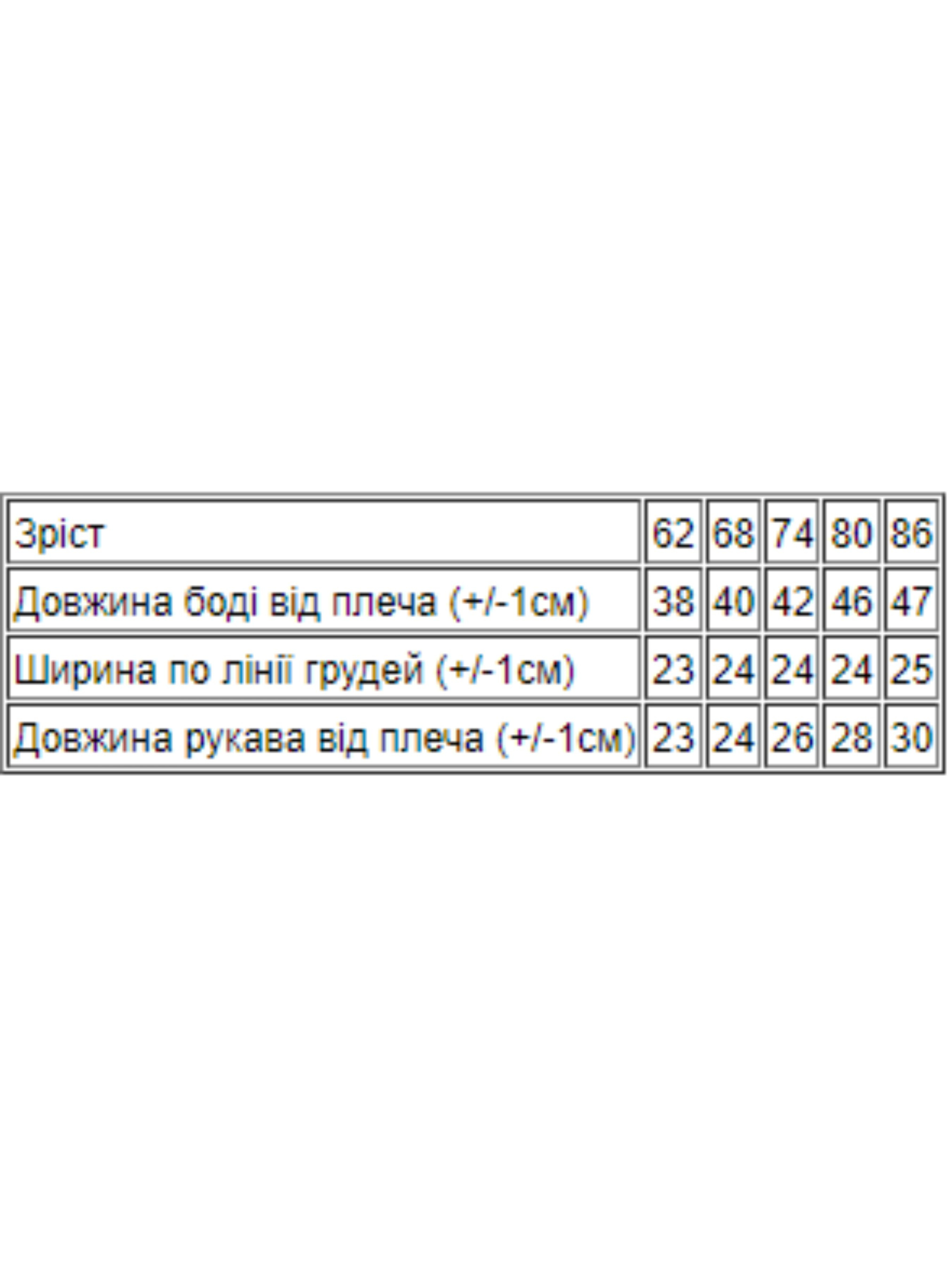 Полотно: інтерлок однотонний Склад полотна: 100% бавовна Зріст: 62-86 Комфортні боді від української торгової марки Носи Своє - практичне доповнення гардероба вашого малюка. Завдяки цілісному крою наші моделі оберігають спину і живіт немовляти від протягів і вітру а затишні матеріали з яких вони виготовлені не заподіють ніяких незручностей і дискомфорту. Боді фіксуються на тілі дитини за допомогою кнопочок внизу і на плечі виріб оснащено довгими рукавами. Стильний дизайн - відмінне доповнення до інших переваг. Полотно з якого виготовлена модель - інтерлок складається з гіпоалергенної натуральної безпечної для дитячої шкіри бавовни. Полотно добре вбирає вологу не викликає роздратування і пропускає до тіла повітря. Догляд: прання при температурі 30 градусів без попереднього замочування. Вироби з печаткою перед пранням необхідно вивернути на виворітну сторону барабанна сушка заборонена; прасувати при t не більше 110С; з вивороту; при пранні не змішувати з іншими типами тканин. Весь одяг вироблений фабрикою строго відповідає розмірній сітці. На бірочці вказано орієнтовний ріс дитини а в таблиці - реальні виміри які зробили наші менеджери. Приємних Вам покупок!