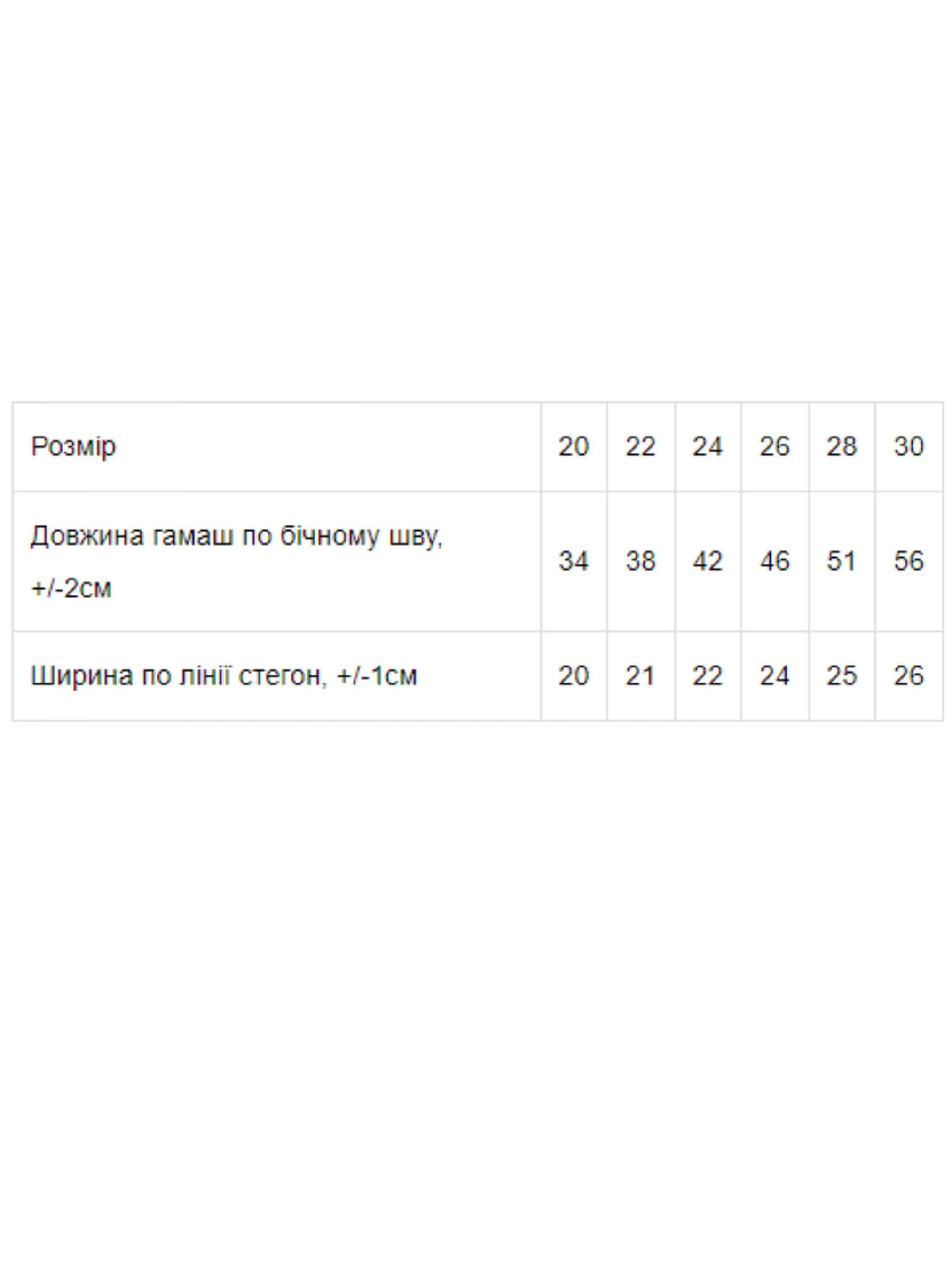 Полотно: стрейч-начос Склад полотна: 95% бавовна 5% лайкра Розмір: 20 24-30 Зручні гамаші з стрейч - начос з набиванням. Виріб на гумці з манжетами з основного полотна прикрашене красивими набивками. Модель не сковує рухи в ній зручно грати і бігати. Відмінний вибір для повсякденного носіння.