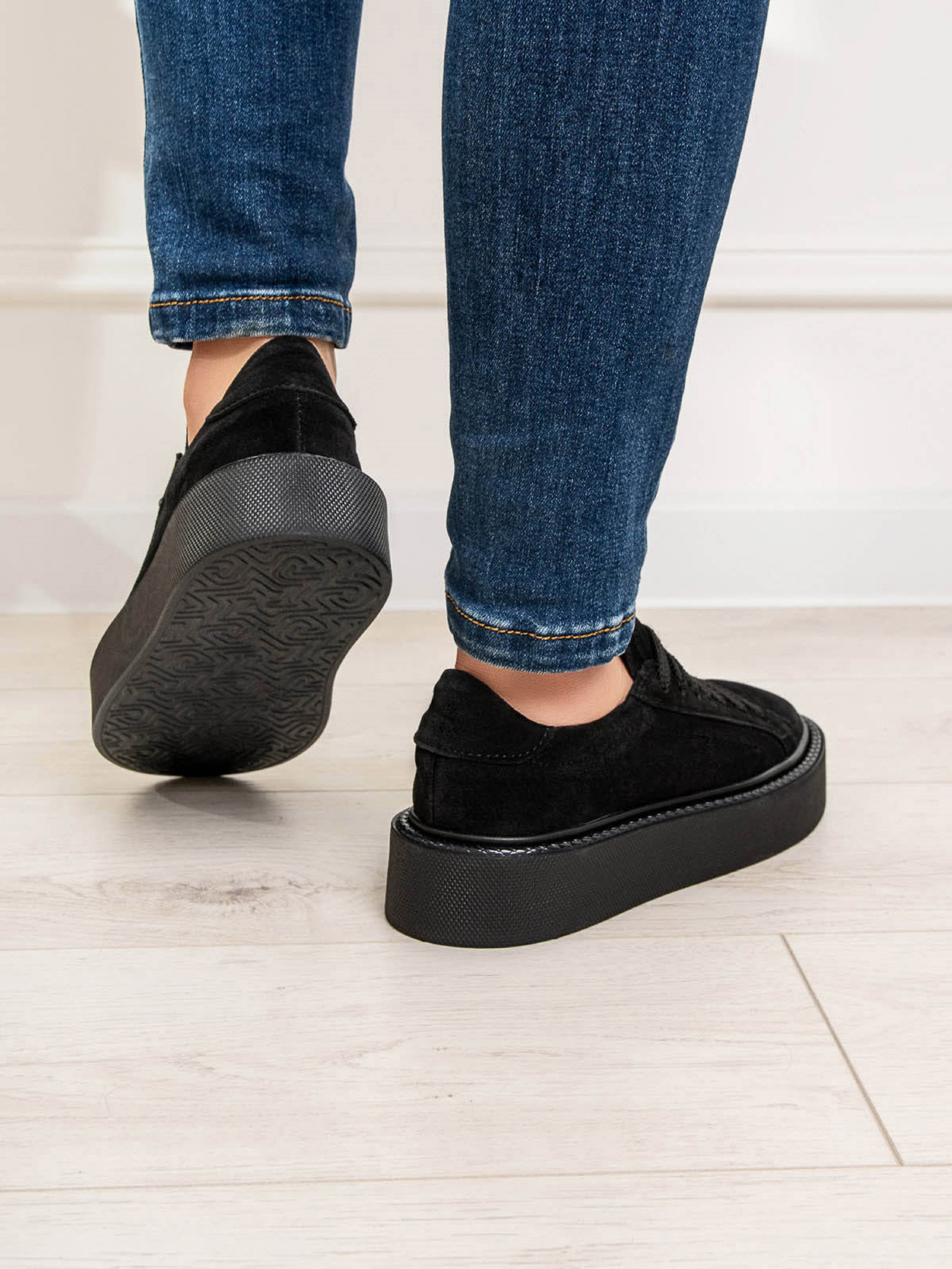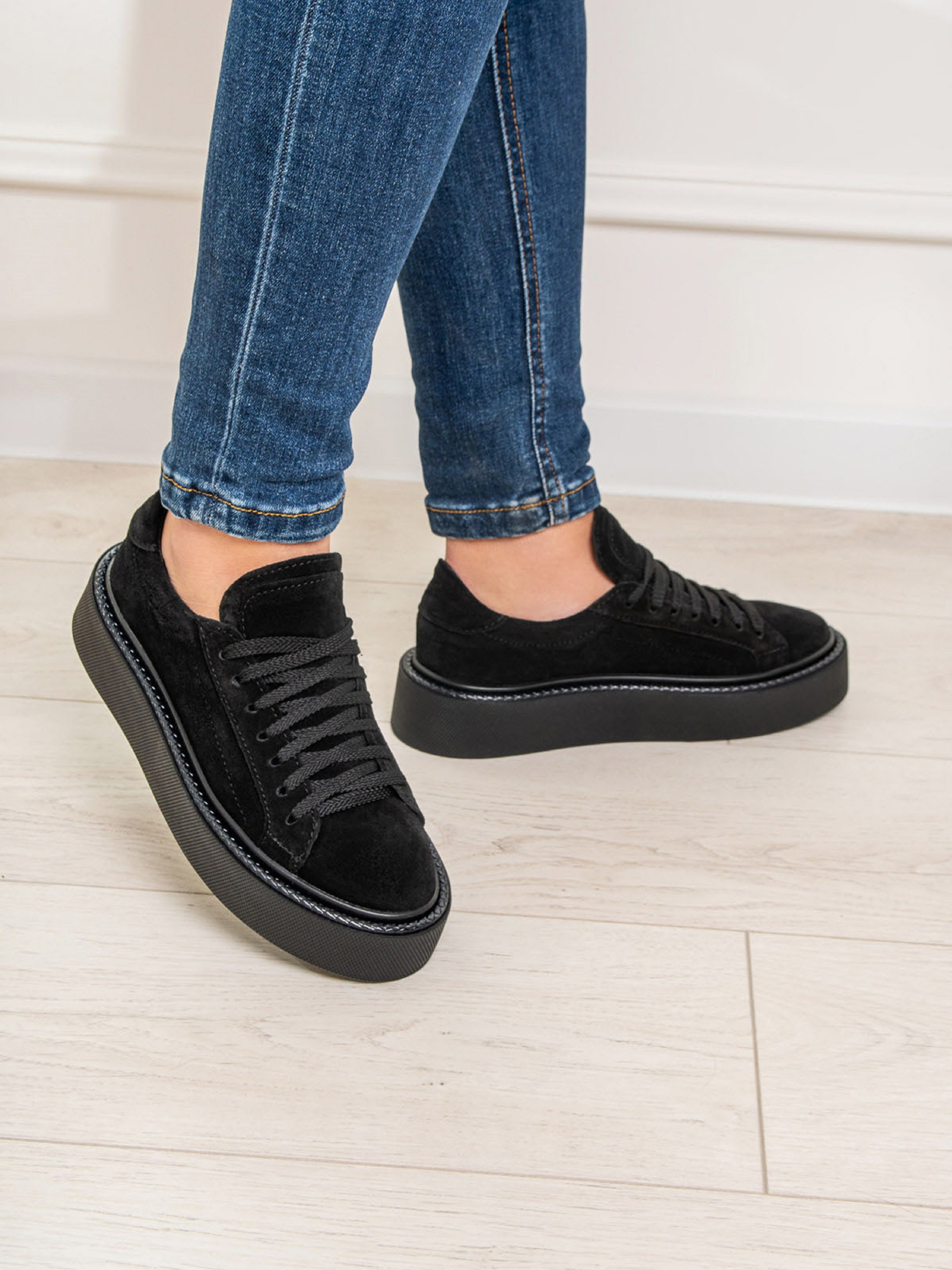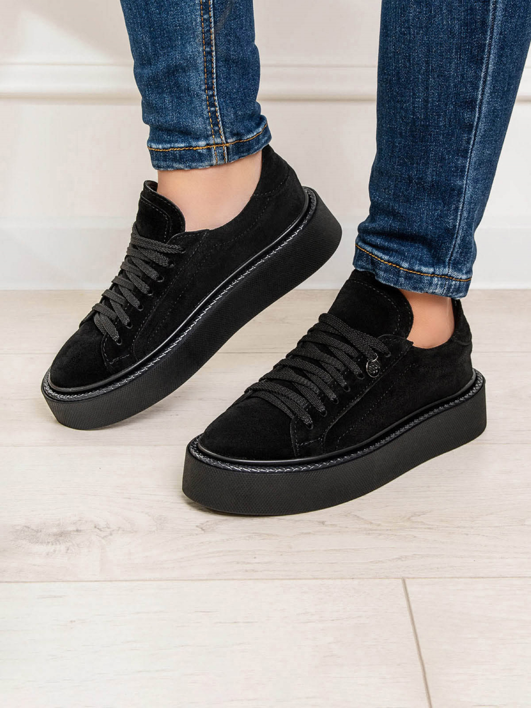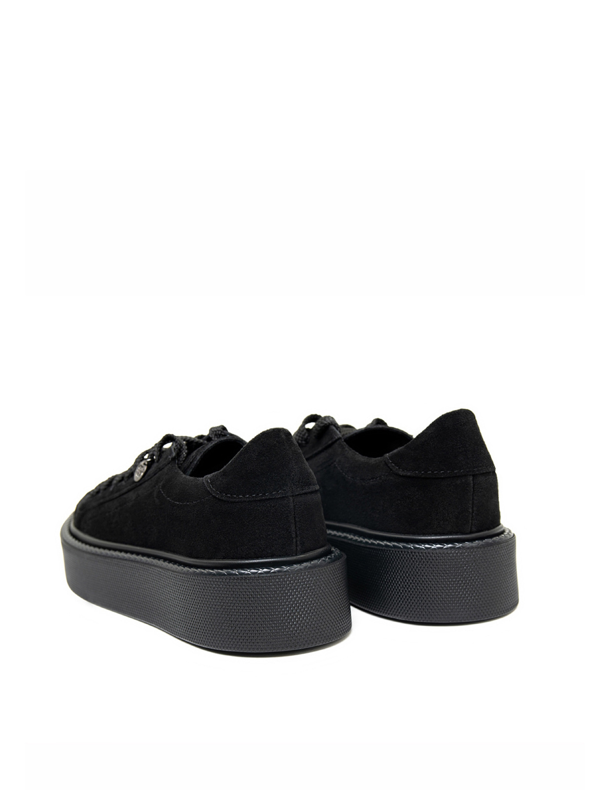 Чорні низькі кеди на плоскій високій підошві, виконані з натуральної замші. Модель на шнурівці із внутрішнім шкіряним підкладом.Матеріал верху: натуральна замша. Підклад: натуральна шкіра. Підошва: EVA (Ева). Висота підошви: 4,5 см та 3,5 см. Заміри:36 (23), 37 (23,5), 38 (24), 39 (24,5), 40 (25), 41 (25,5).
