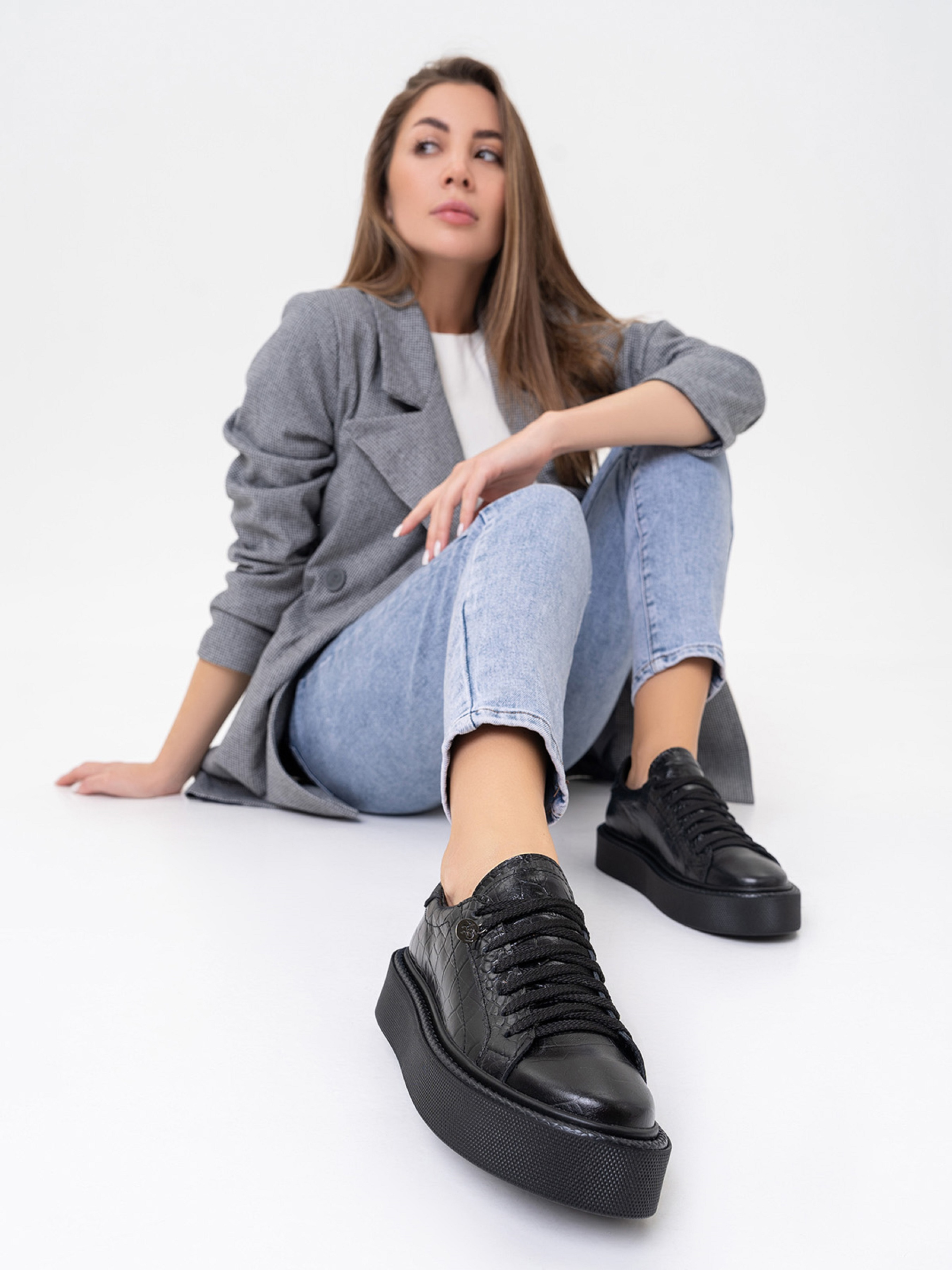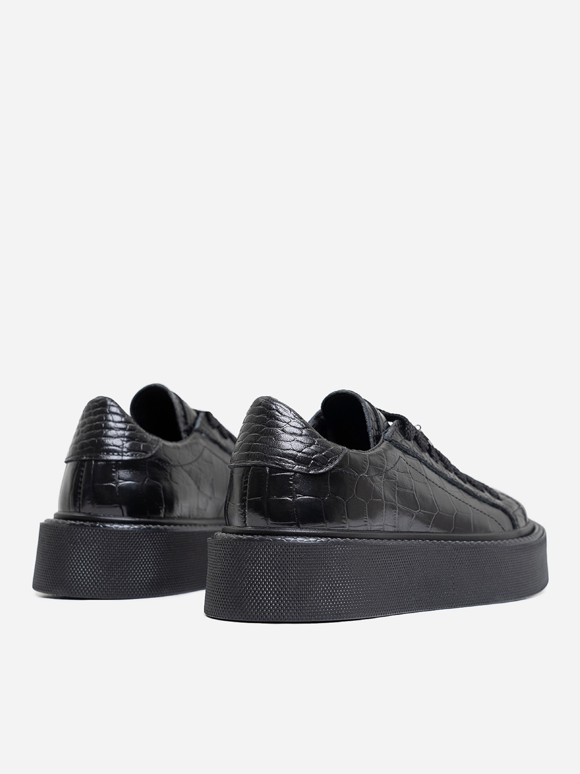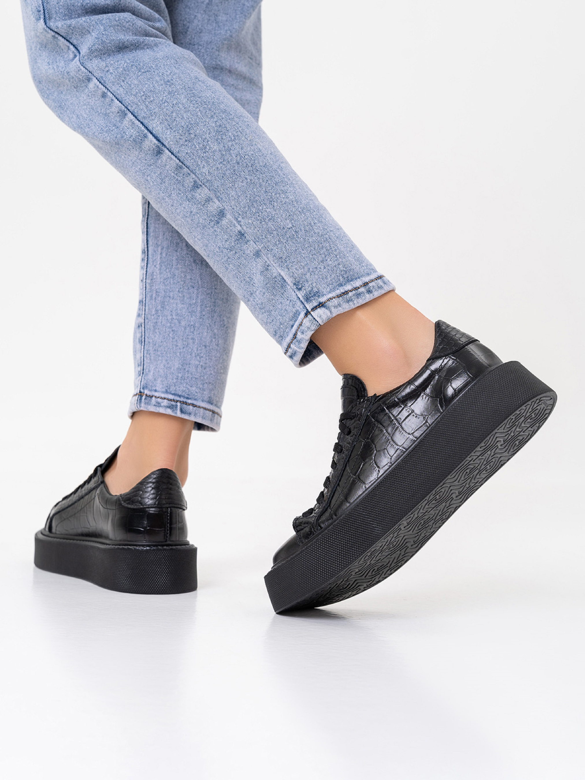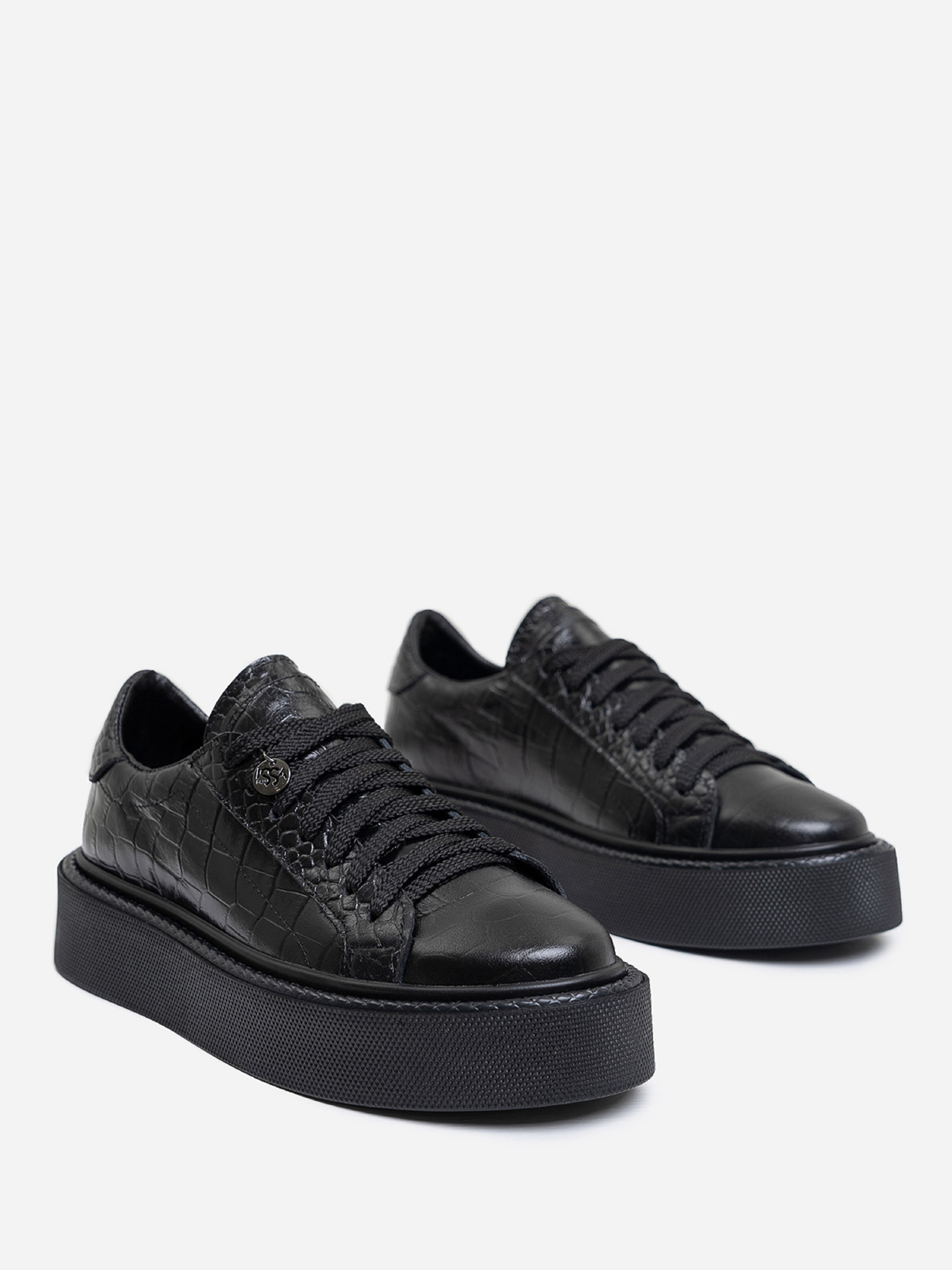 Чорні низькі кеди на шнурівці, виконані з натуральної тисненої шкіри. Кеди із високою підошвою.Матеріал верху: натуральна шкіра. Підклад: натуральна шкіра. Підошва: EVA (Ева). Висота підошви: 4,5 см та 3,5 см. Заміри:36 (23), 37 (23,5), 38 (24), 39 (24,5), 40 (25), 41 (25,5).