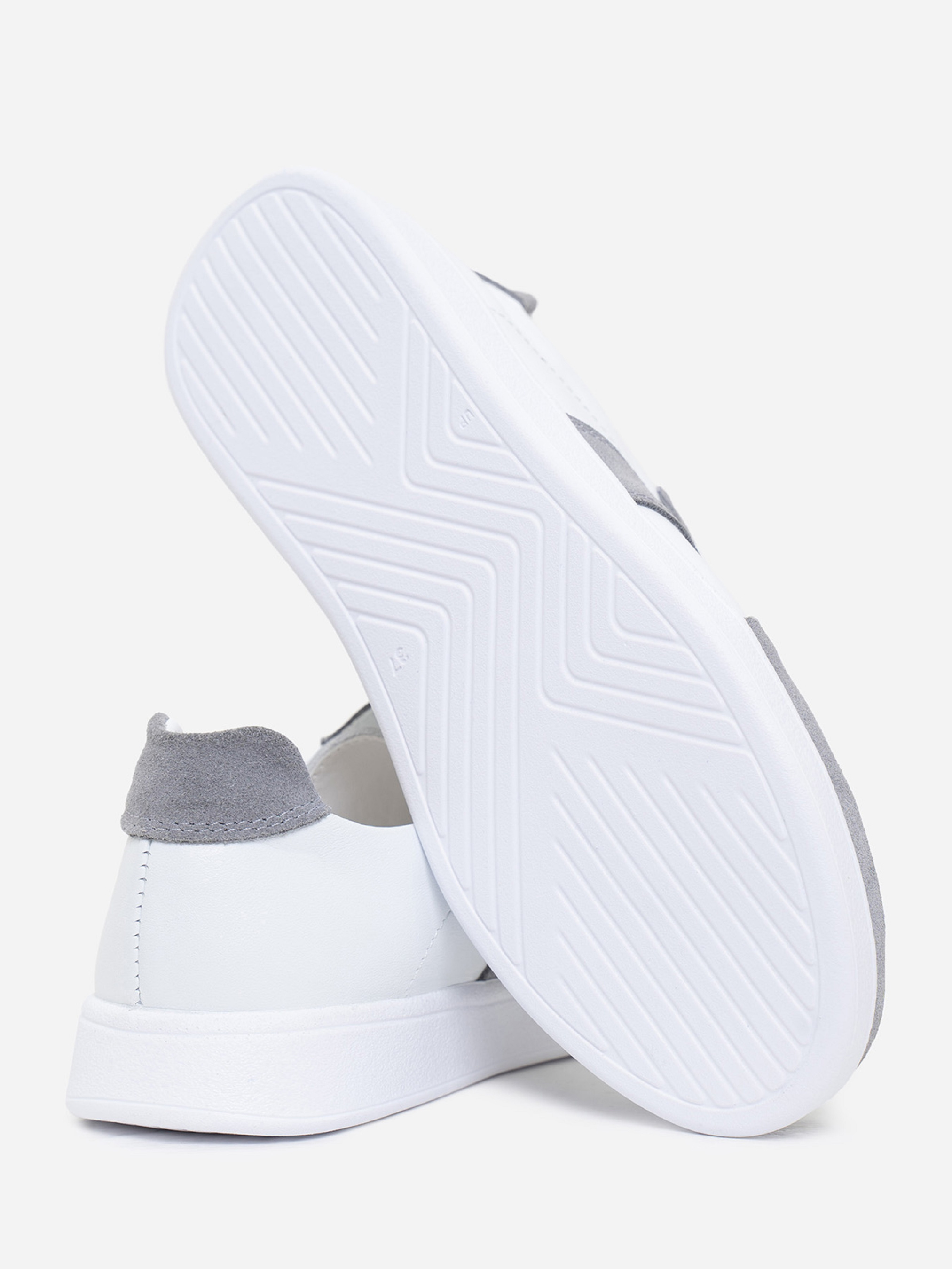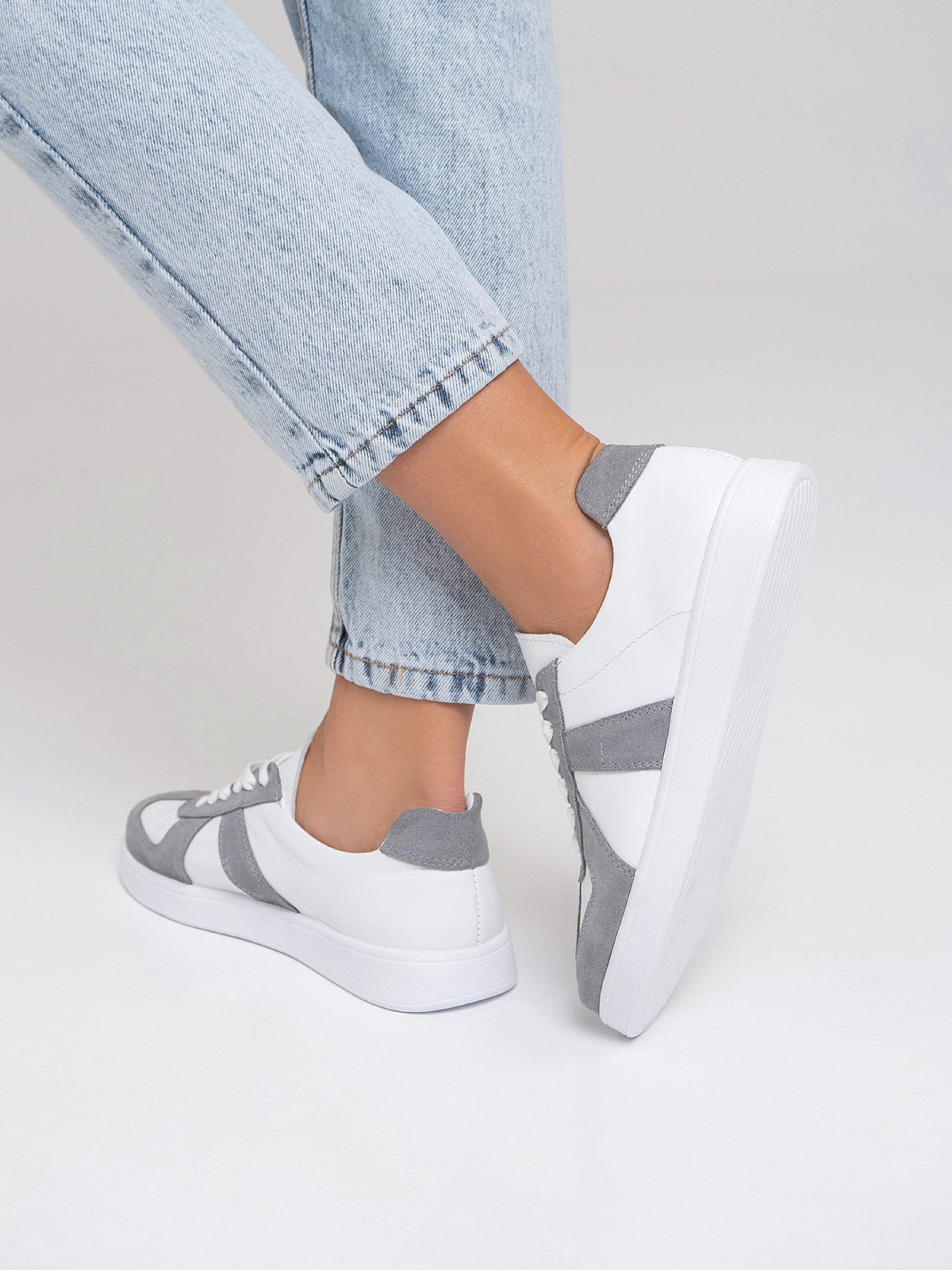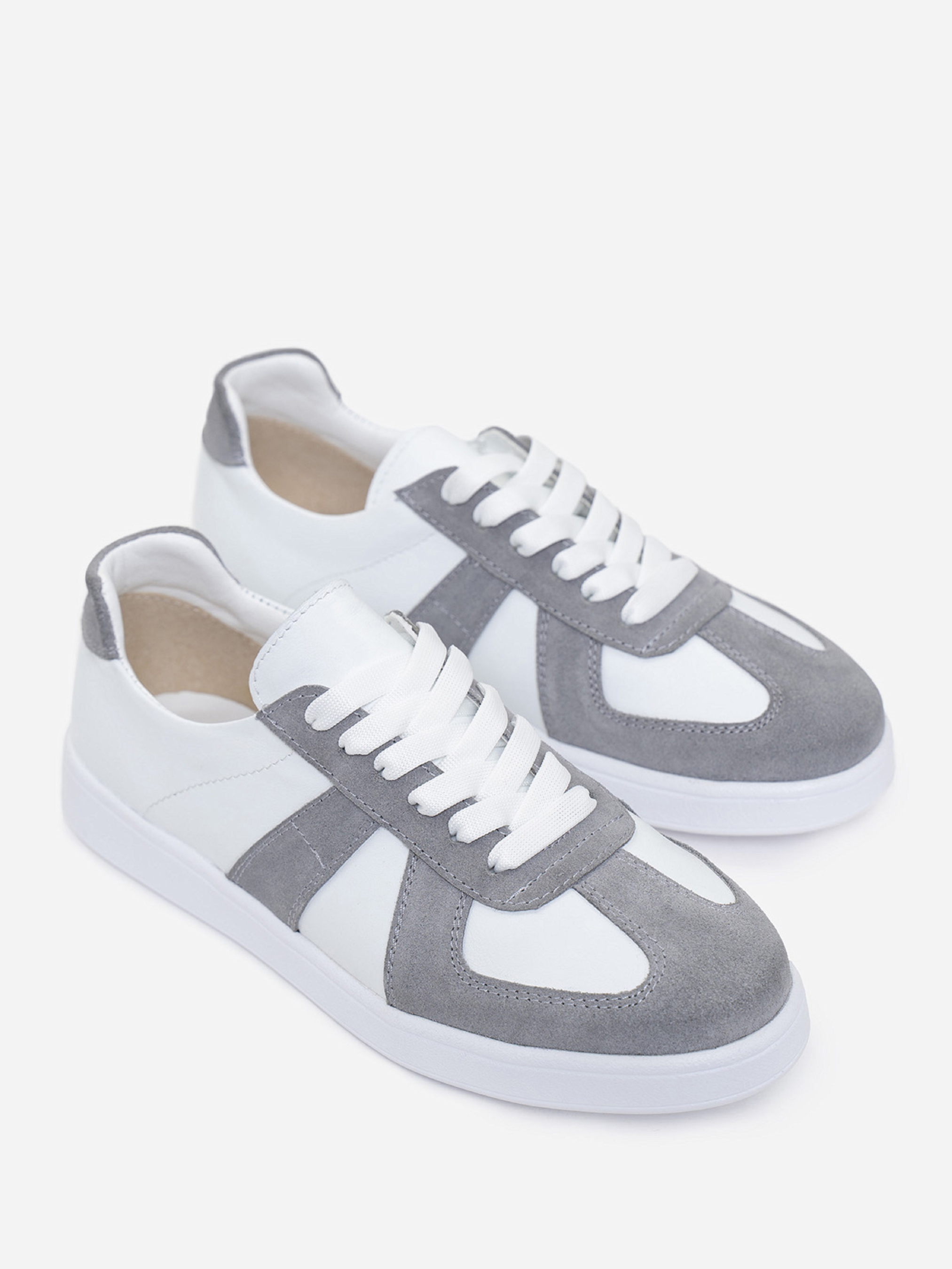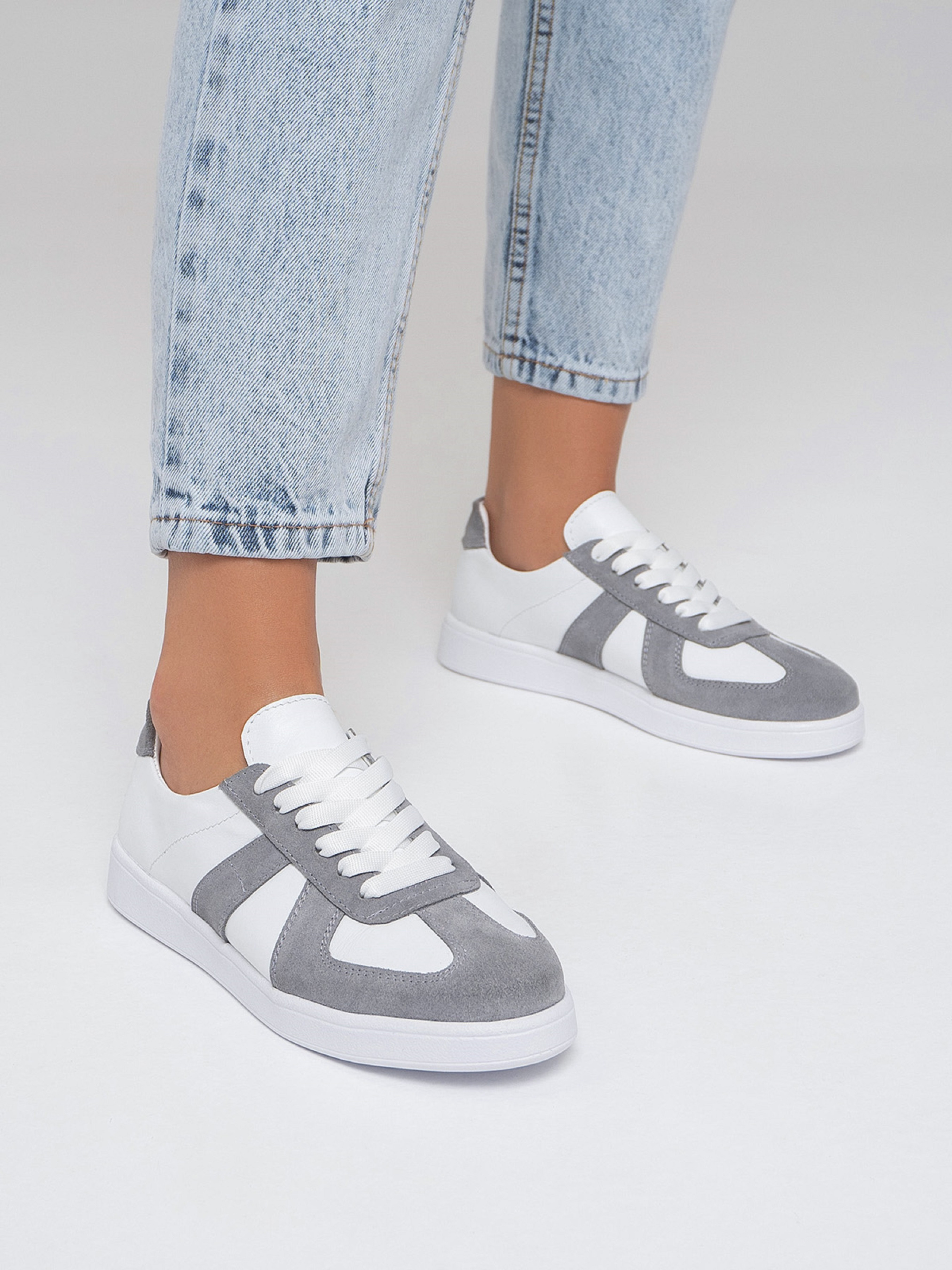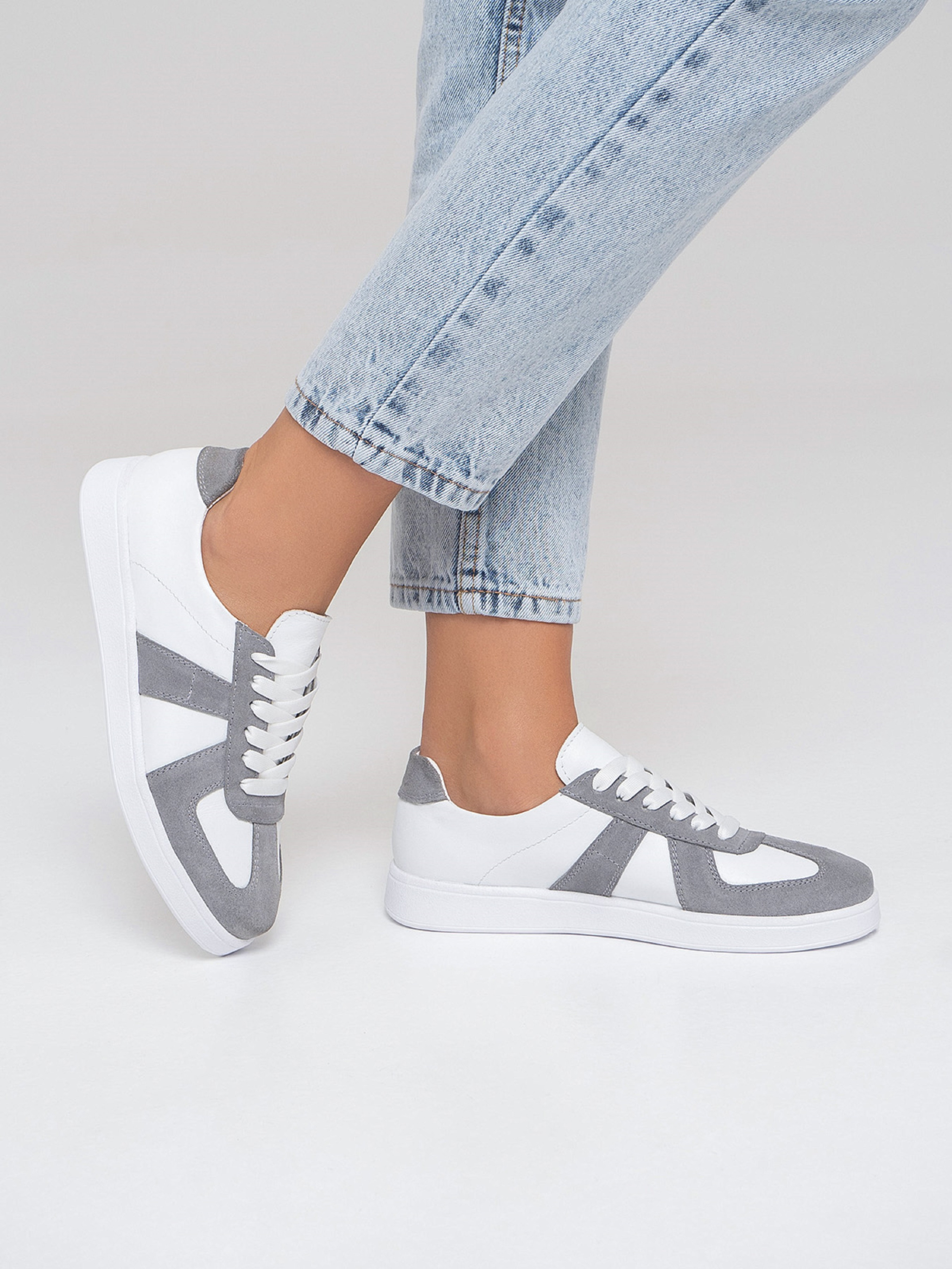 Білі низькі кеди на плоскій підошві зі зручною шнурівкою. Модель з натуральної замші та шкіри із сірими вставками.Матеріал верху: натуральна шкіра/замша. Підклад: натуральна шкіра. Підошва: PU (поліуретан). Висота підошви: 2,5 см та 1,5 см. Заміри:36 (23), 37 (23,5), 38 (24), 39 (24,5), 40 (25), 41 (25,5).