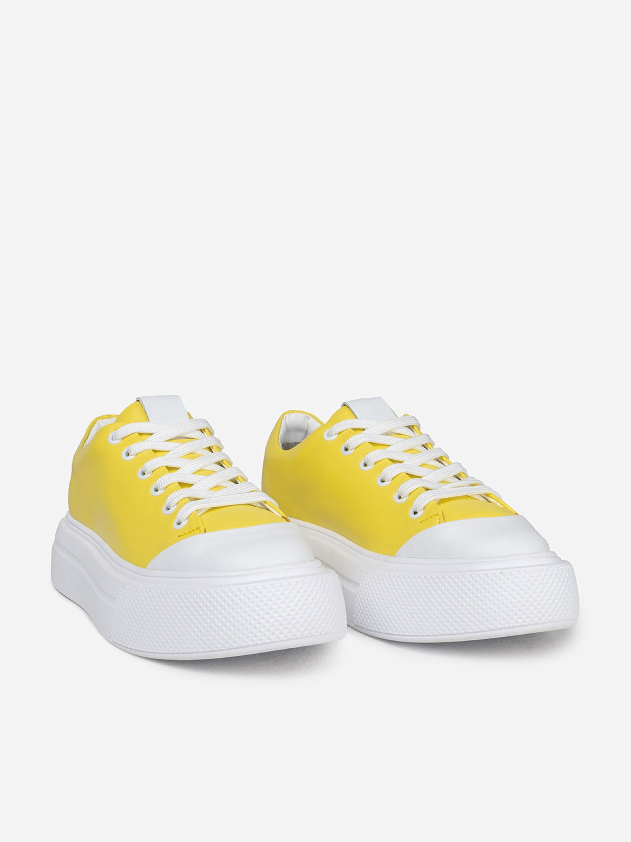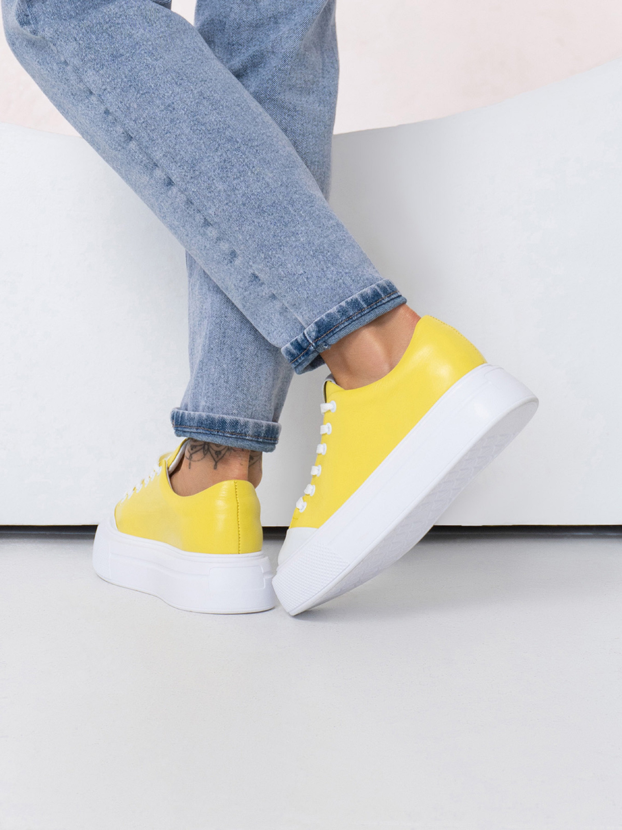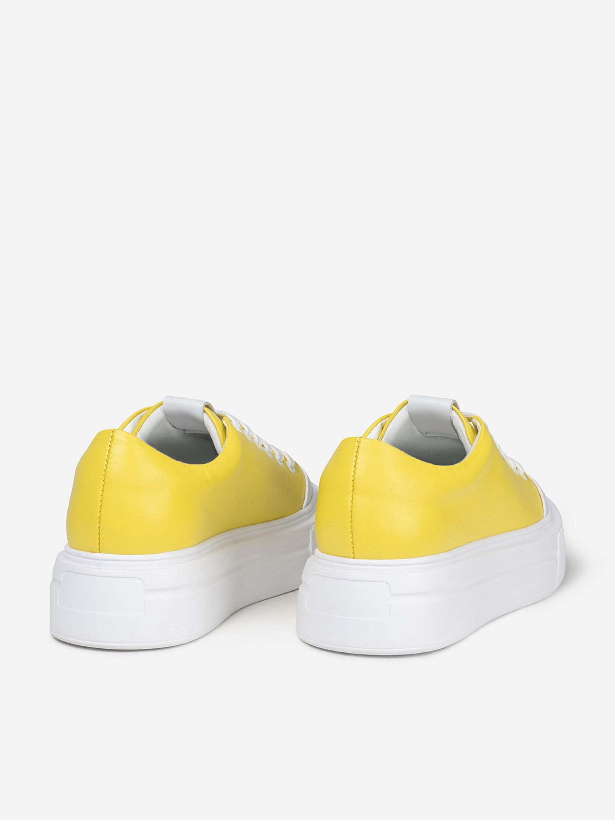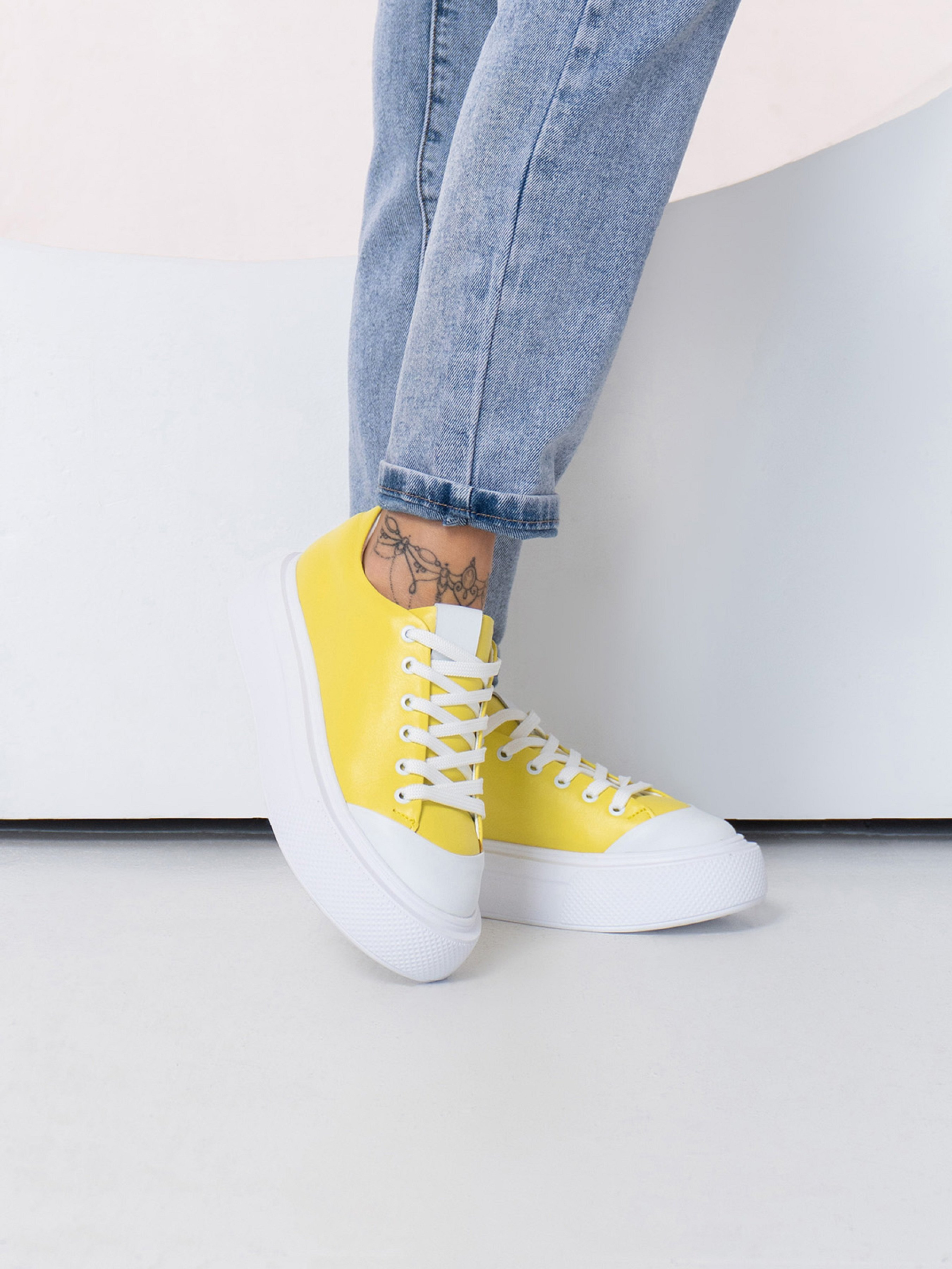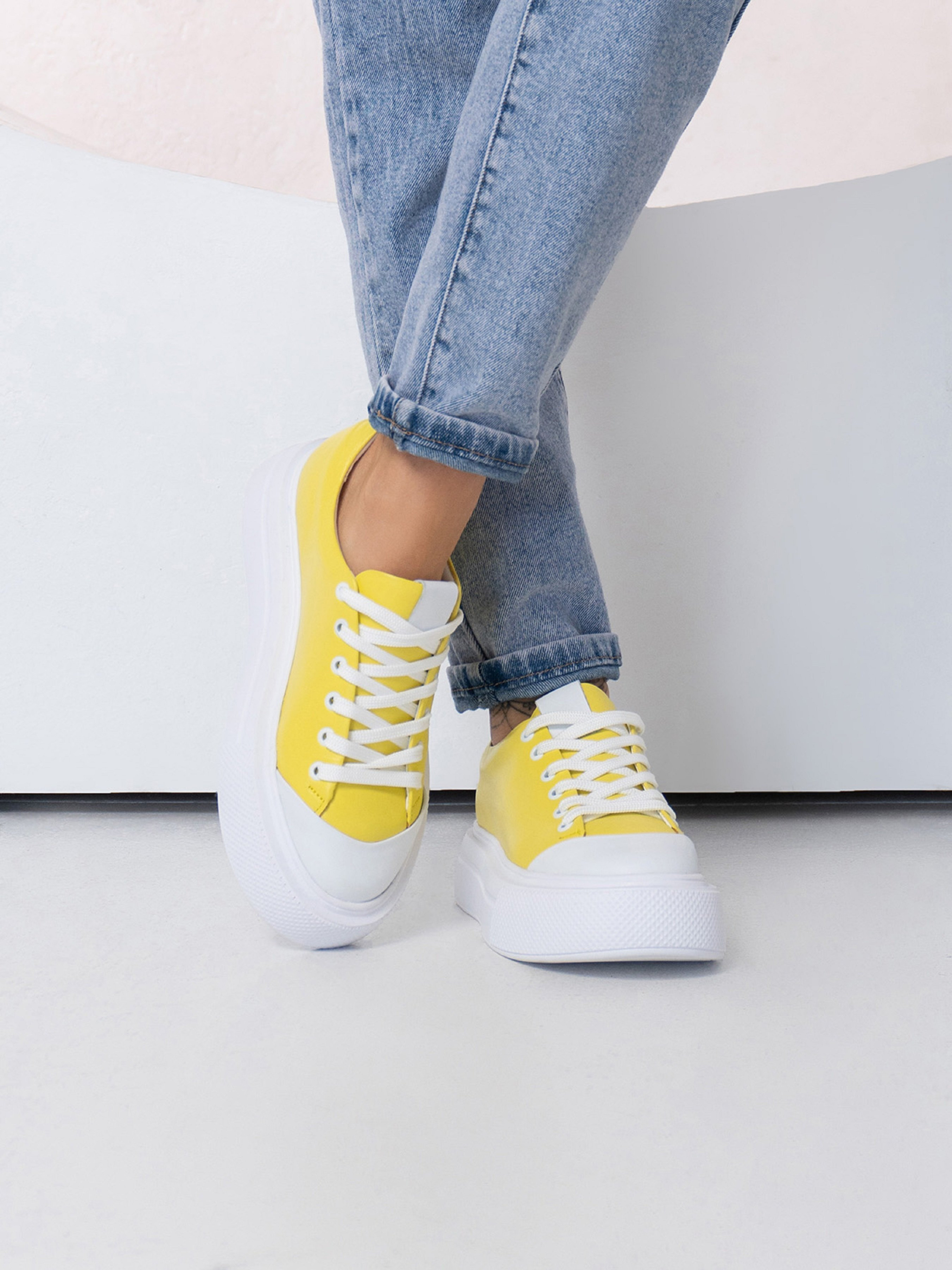 Біло-жовті кеди з натуральної шкіри з високою плоскою підошвою. Модель на шнурівці зі шкіряним внутрішнім підкладом. Матеріал верху: натуральна шкіра Підклад: натуральна шкіра Підошва: EVA (Ева) Висота підошви: 4,5 см та 4 см. Заміри : 36 (23), 37 (23,5), 38 (24), 39 (24,5), 40 (25), 41 (25,5).