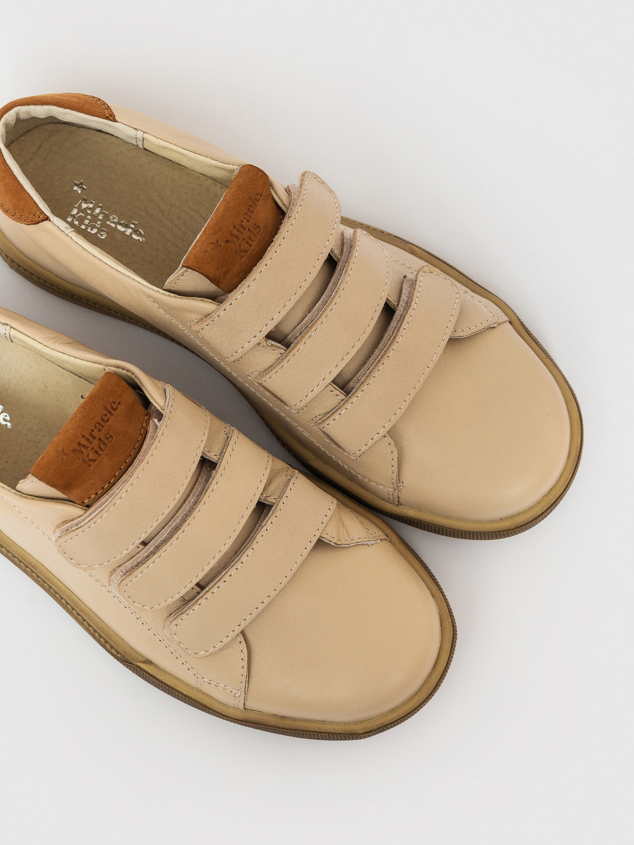 Верх виконаний з мʼякої шкіри і доповнений контрастними шкіряним підкладом. А липучки забезпечують, окрім комфортної фіксації на ніжці, модний і стильний вигляд.