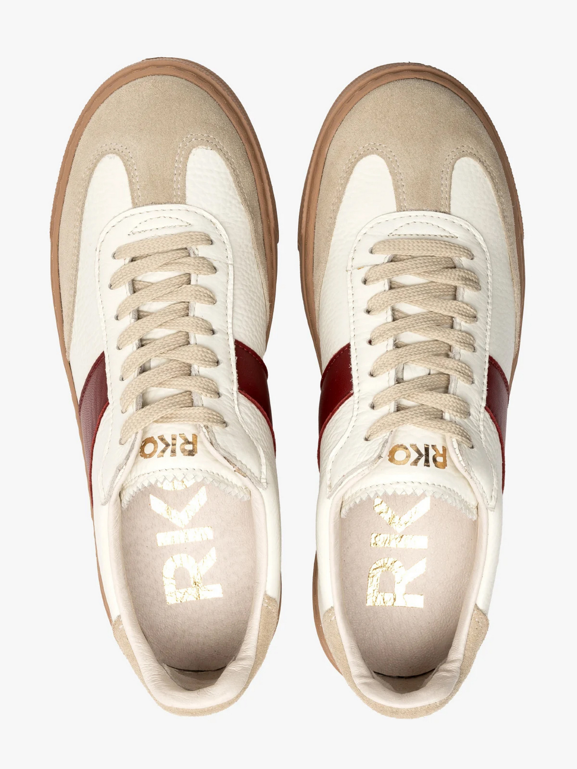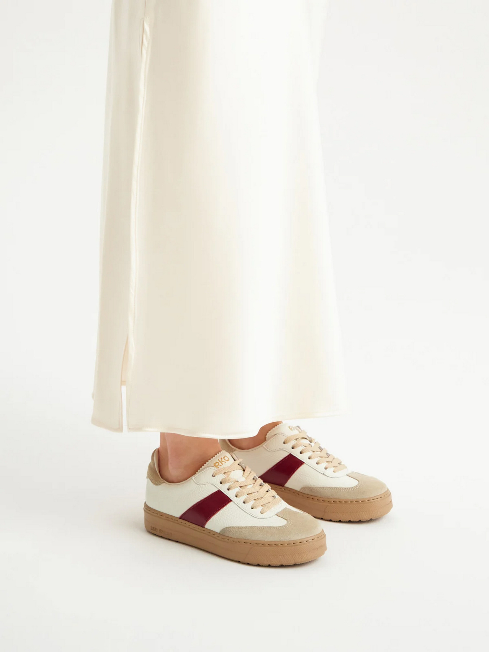 Шкіряні кеди біло-бежевого кольору з бордовими вставками польського виробника RYLKO серії #RKO. Виготовлені з натуральної шкіри та замші преміум якості. Всередині - натуральна шкіра. Модель має пласку бежеву підошву заввишки 3,5 см з технологією R.FLY. Це надзвичайно легка та пружна підошва, виконана з пінки ЕВА. Забезпечує високий комфорт користування. Непориста, легко чиститься вологою ганчіркою. Підходять на стандартну (середню) повноту стопи. Щоб правильно обрати свій розмір, обов'язково звертайте увагу на розмірну сітку RYŁKO EU: 35-23,3 см; 36-24 см; 36,5-24,3 см; 37-24,7 см; 37,5-25 см; 38-25,3 см; 38,5-25,7 см; 39-26 см; 39,5-26,3 см; 40-26,7 см; 40,5-27 см; 41-27,3 см; 42-28 см.