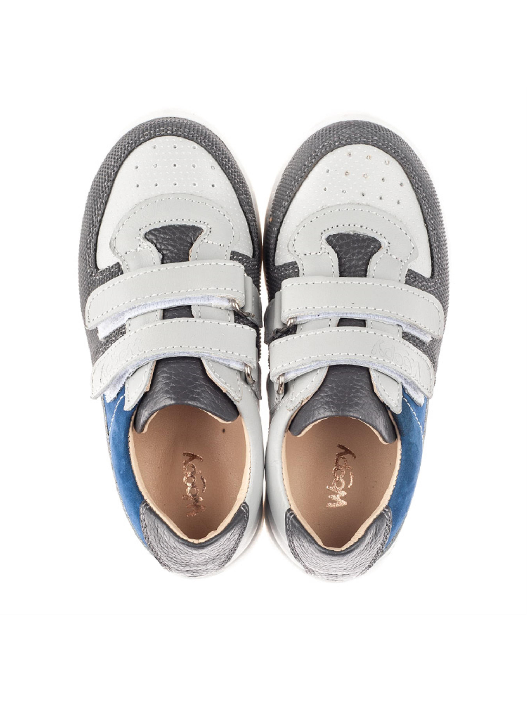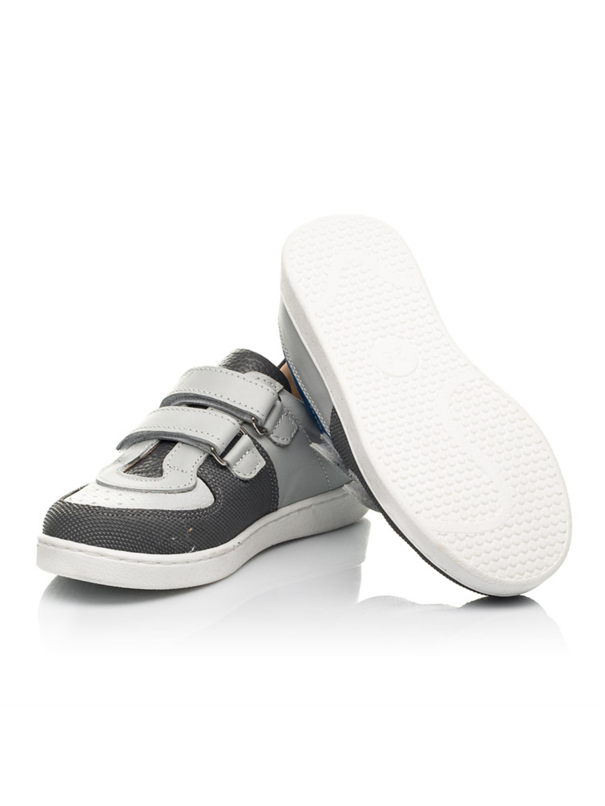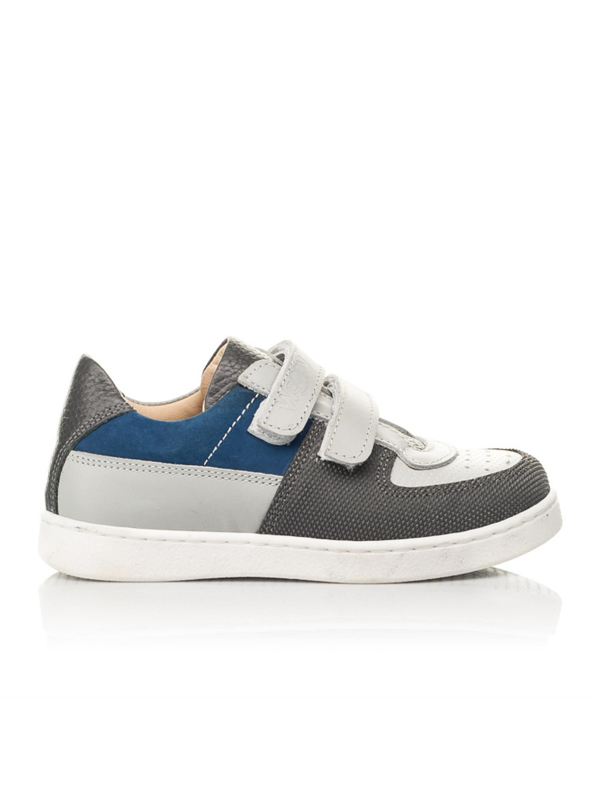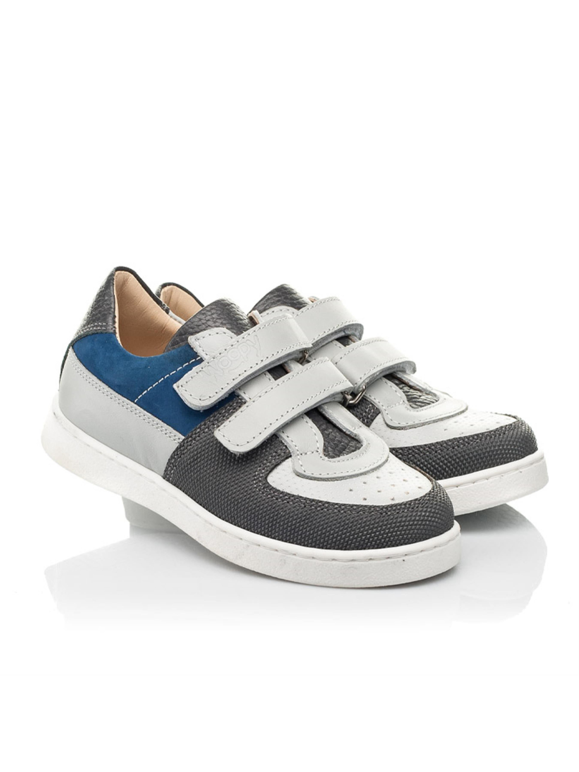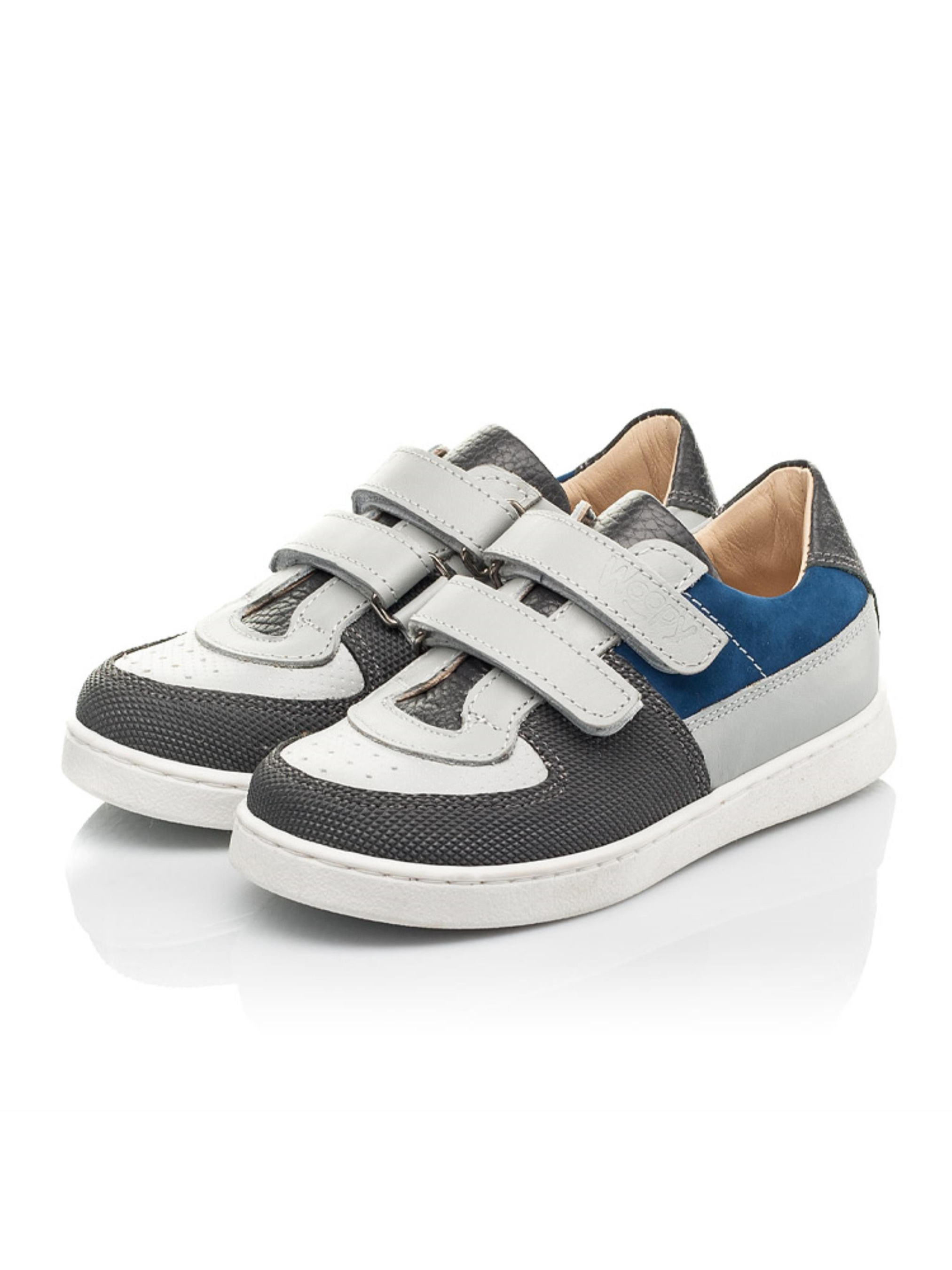 Смілива комбінація різних матеріалів та кольору дозволила створити таку по-справжньому унікальну модель кед. Дитячі кеди для хлопчика пошиті з натуральної шкіри сірого кольору, матеріал підкладки та устілки - натуральна гладка шкіра. Носочок в кедах створений зі шкіри з перфорацією у верхніх шарах та захищений вставкою "неубивайкою" від механчіних пошкоджень та потертостей. Язичок в кедах пошито з натуральної шкіри контрастного темно-сірого кольору, а бокову частину кед прикрашає вставка з натурального нубука вишуканого синього кольору. Спосіб застібання - надійні липучки. Верхня липучка-застібка оздоблена тисненням з логотипом виробника Woopy. Дитячі кеди мають жорсткий задник, анатомічно правильну устілку, легку та гнучку підошву (по периметру прошита).