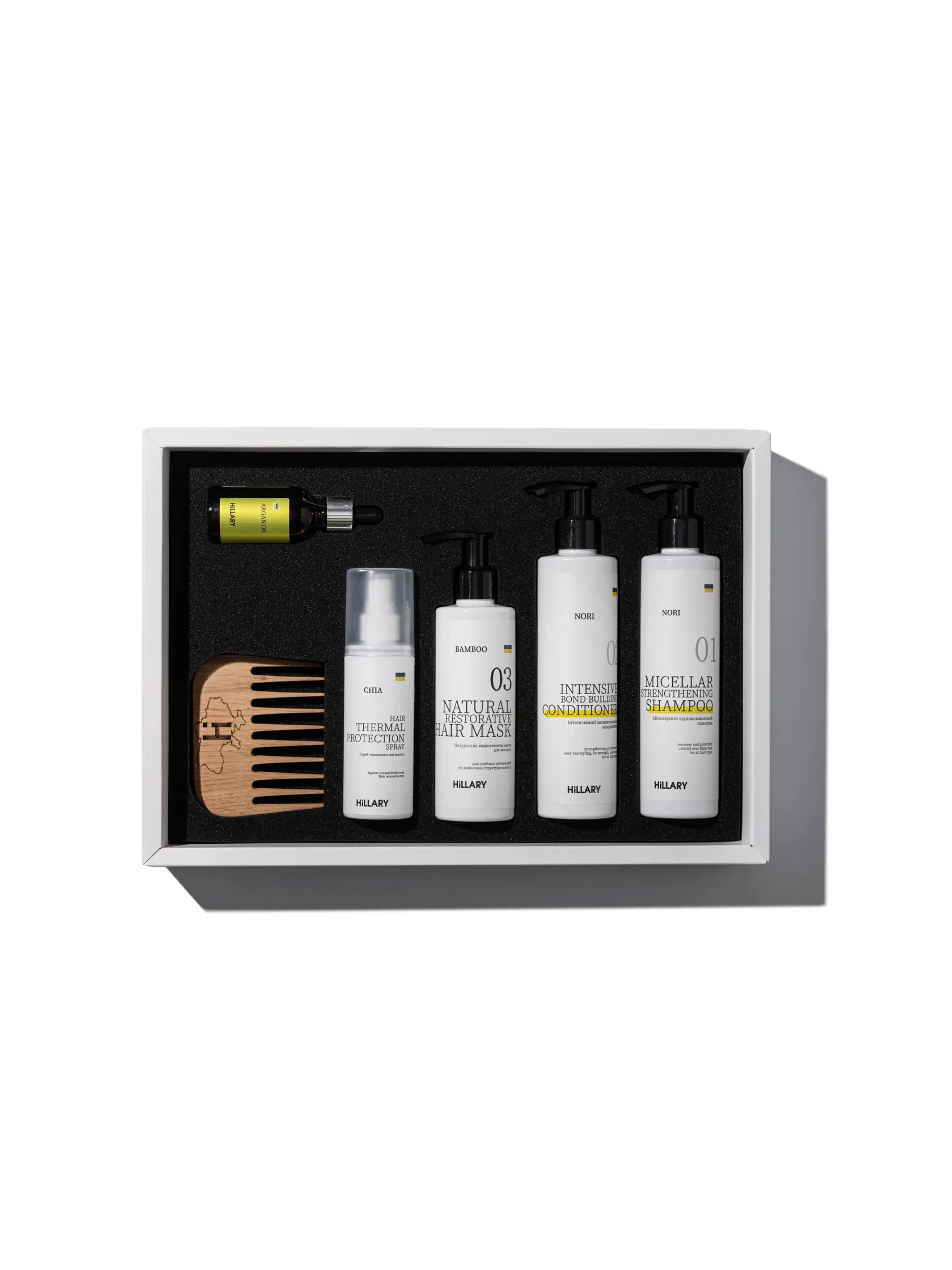 Подарунковий бокс Perfect Nori, із засобами, що призначені для делікатного догляду волосся всіх типів - ідеальний спосіб зробити приємне собі коханій або близькій подрузі, сестрі, чи мамі. Експертний подарунковий комплекс ефективно діє проти сплутування та електризації, робить пасма слухняними та сяючими. Для кучерявого волосся сприяє формуванню гарних завитків. Активні речовини, що містяться у формулі спрею для волосся, живлять і захищають волосся. Засоби, що входять до боксу, забезпечують делікатний догляд та відновлення дисульфідних зв'язків всередині кожної волосини. також захищають волосся від негативного впливу навколишнього середовища та підтримують гідроліпідний баланс шкіри голови. До набору входять: Міцелярний відновлювальний шампунь Norі Hillary Nory Micellar Strengthening Shampoo, 250 мл; Інтенсивний зміцнювальний кондиціонер Hillary Nori Intensive Nori Bond Building Conditioner, 250 мл; Натуральна маска для відновлення волосся Hillary BAMBOO Hair Mask, 200 мл; Спрей-термозахист для волосся Hillary CHIA, 120 мл; Гребінь дубовий Hillary Органічна марокканська арганова олія холодного віджиму Hillary Organic Cold-Pressed Moroccan Argan Oil, 30 мл Застереження: Натуральна косметика не є гіпоалергенною. За 24 години до застосування проведіть алергопробу на згині ліктя.