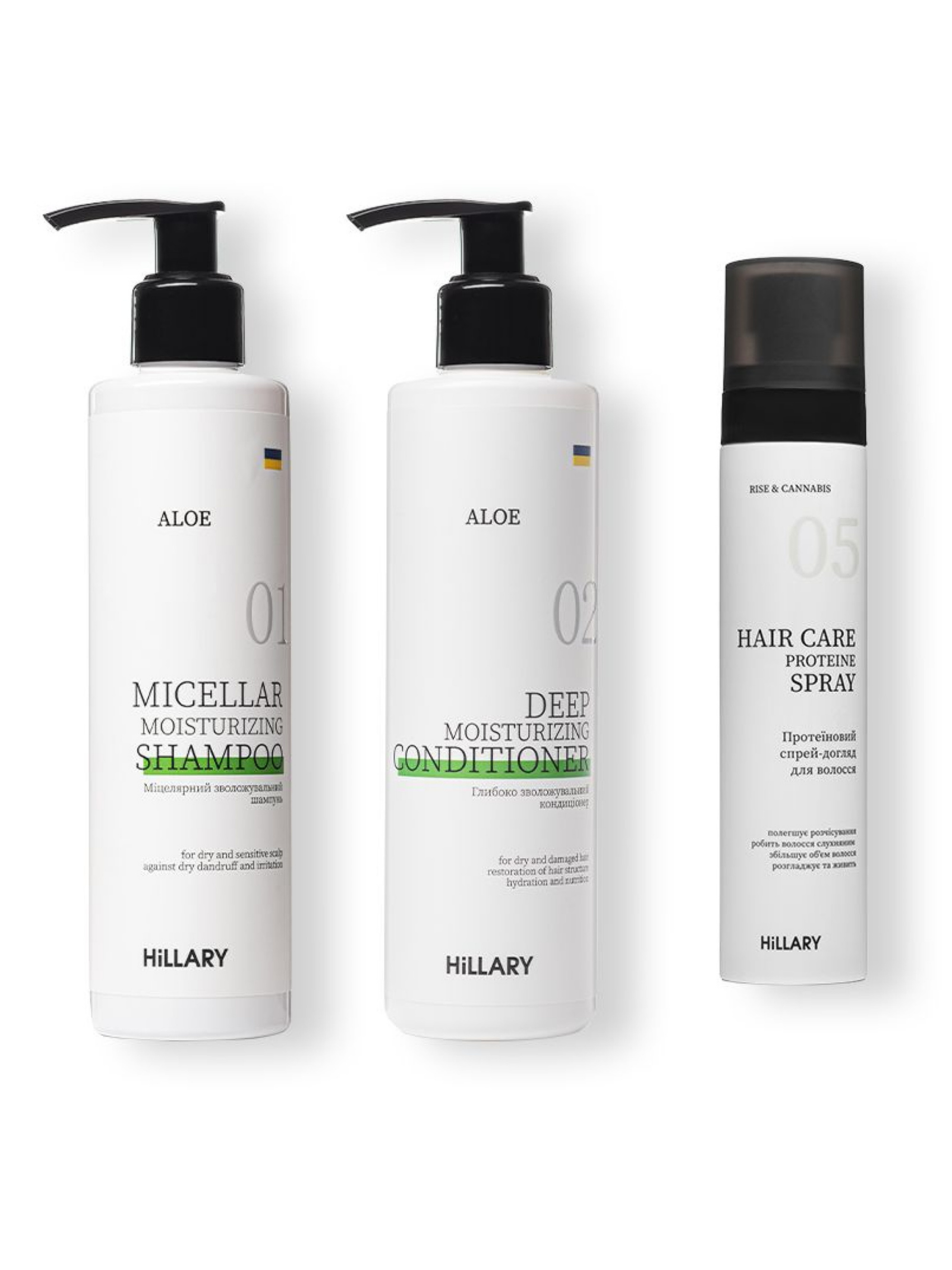 Зміцніть своє волосся з трьома надзвичайно ефективними продуктами, які забезпечують, інтенсивний догляд, зволоження та відновлення для сухого типу волосся. Протеїновий спрей-догляд для волосся Hillary Rise & Cannabis Hair Care Protein Spray з протеїнами рису та коноплі зміцнює та розгладжує волосся, захищаючи його від негативних зовнішніх факторів. Завдяки термозахисним властивостям, спрей полегшує розчісування та укладку, роблячи волосся слухняним і шовковистим. Протеїни рису проникають у кутикулу, забезпечуючи до 85% зміцнення волосся, а олія насіння коноплі живить і зволожує локони. Міцелярний зволожувальний шампунь Aloe Hillary Aloe Micellar Moisturizing Shampoo забезпечує делікатний, але ефективний догляд за чутливою та сухою шкірою голови. М’яко очищує, усуває свербіж і запалення, забезпечуючи відчуття свіжості та комфорту. Завдяки вмісту соку листя алое, шампунь зволожує шкіру голови, підвищує еластичність волосся та покращує його розчісування. Глибоко зволожувальний кондиціонер Aloe Hillary Aloe Deep Moisturizing Conditioner з соком листя алое та гідролізованим протеїном пшениці інтенсивно зволожує, розгладжує та зміцнює структуру волосся. Трегалоза в складі підтримує оптимальний рівень вологи, запобігає розпушуванню та сплутуванню, надаючи волоссям здорового вигляду та шовковистості. Ідеально підходить для пошкодженого фарбуванням або термальним впливом волосся. Цей набір створений для комплексного догляду, щоб ваше волосся завжди виглядало здоровим і блискучим. До набору входять: Протеїновий спрей-догляд для волосся Hillary Rise & Cannabis Hair Care Protein Spray, 100 мл. Склад: Aqua, Cetrimonium Chloride, Glycerin, Hydrolyzed Hemp Seed Extract, Hydrolyzed Rice Protein, Alcohol, Isoamyl p-Methoxycinnamate, Amodimethicone, Tocopheryl Acetate, Ethylhexyl Triazone, Oleyl Oleate, Lecithin, Trideceth-3, Trideceth-15, Phenoxyethanol, Ethylhexylglycerin, Stearamine, Parfum, Citric Acid, Sodium Benzoate, Potassium Sorbate Міцелярний зволожувальний шампунь Aloe Hillary Aloe Micellar Moisturizing Shampoo, 250 мл. Склад: Aqua, Sodium Coco-Sulfate, Lauryl Glucoside, Glycerin, Sodium Lactate, Lactic Acid, Trehalose, Hydrolyzed Wheat Protein, Aloe Barbadensis Leaf Juice, Guar Hydroxypropyltrimonium Chloride, Citric Acid, Sodium Chloride, Benzyl Alcohol, Benzoic Acid, Dehydroacetic Acid, Sodium Benzoate, Potassium Sorbate, Parfum. Глибоко зволожувальний кондиціонер Aloe Hillary Aloe Deep Moisturizing Сonditioner, 250 мл Склад: Aqua, Cetearyl Alcohol, Glycerin, Behentrimonium Chloride, Stearamidopropyl Dimethylamine, Cocos Nucifera (Coconut) Oil, Vitis Vinifera (Grape) Seed Oil, Prunus Amygdalus Dulcis (Sweet Almond) Oil, Aloe Barbadensis Leaf Juice, Hydrolyzed Wheat Protein, Panthenol, Tocopheryl Acetate, Sodium Benzoate, Potassium Sorbate, Benzyl Alcohol, Benzoic Acid, Dehydroacetic Acid, Lactic Acid, Parfum Спосіб застосування: Нанесіть шампунь на ретельно зволожене волосся та шкіру голови. Масажуйте шкіру протягом 2-3 хвилин. Змийте водою. Повторіть 2-3 рази. Нанесіть кондиціонер на вологе чисте волосся і рівномірно розподіліть по всій довжині руками або за допомогою великого гребінця. Змийте водою через 1-2 хвилини. Невелику кількість спрею нанесіть на вологе волосся по всій довжині, висушити феном чи виконати укладку. Або на сухе волосся перед використанням плойки\вирівнювача для волосся. Застереження: Натуральна косметика не є гіпоалергенною. За 24 години до застосування проведіть алергопробу на згині ліктя.