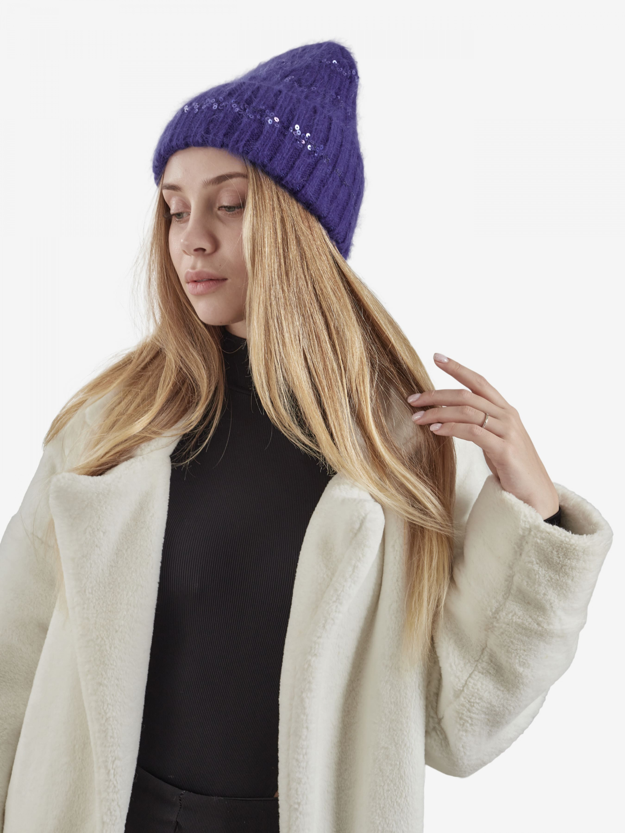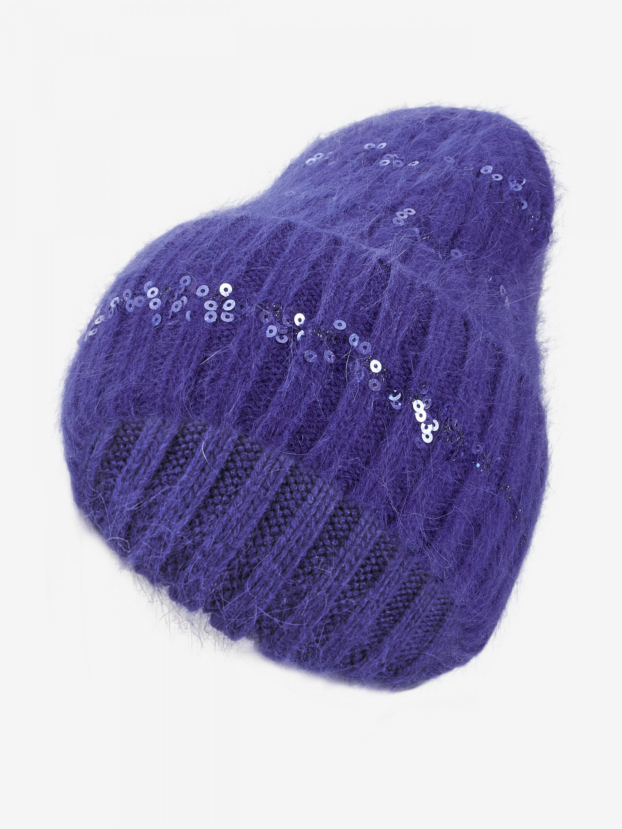 "Стильна жіноча тепла шапка біні відмінно впишеться у ваш звичайний образ. Ви почуватиметеся комфортно в будь-яку погоду. Шапка доповнена щільно прилеглим відворотом, еластична, добре тягнеться і приємна на дотик. Виріб прикрашений паєтками і прошитий люрекс. голову від вітру та холоду, забезпечить комфорт під час носіння. Деталі: - Склад: 52% вовна кролика, 48% акрил - Розмір універсальний, добре тягнеться - Висота шапки: 25 см - Напівобіг шапки: 22 см - Сезон: Осінь-Зима - Тип в'язання: середня - Декорована паєтками"
