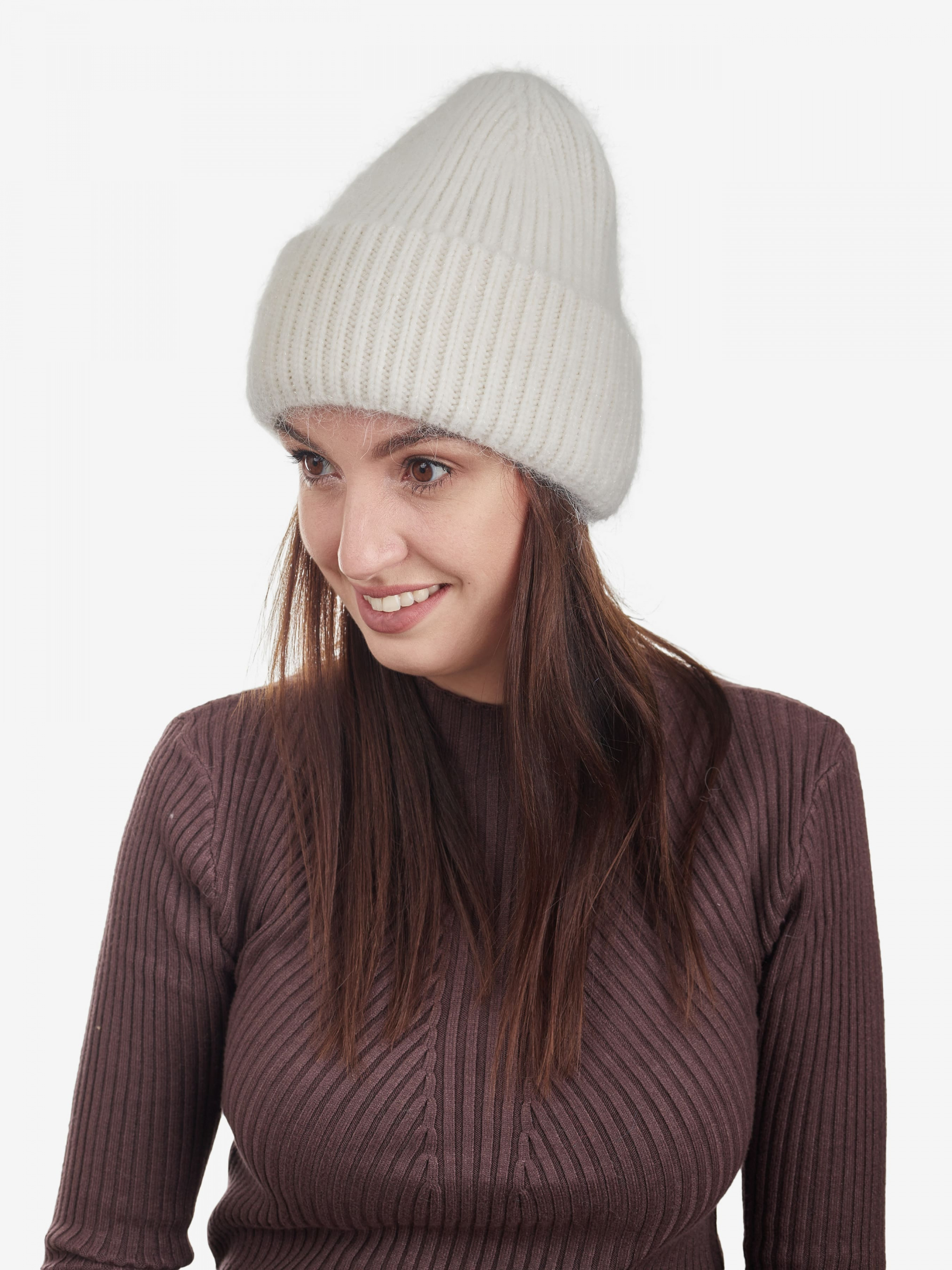 "Стильна жіноча тепла шапка біні відмінно впишеться у ваш звичайний образ. Ви почуватиметеся комфортно в будь-яку погоду. Шапка доповнена щільно прилеглим відворотом, еластична, добре тягнеться і приємна на дотик. Виріб прикрашений люрексовою ниткою. та холоду, забезпечить комфорт під час носіння. Деталі: - Склад: 50% віскоза, 40% ангора, 5% кашемір, 5% еластан - Розмір універсальний, добре тягнеться - Висота шапки: 22 см - Напівобіг шапки: 22 см - Сезон: Осінь-Зима - Тип в'язання: середня - Декорована люрексовою ниткою"