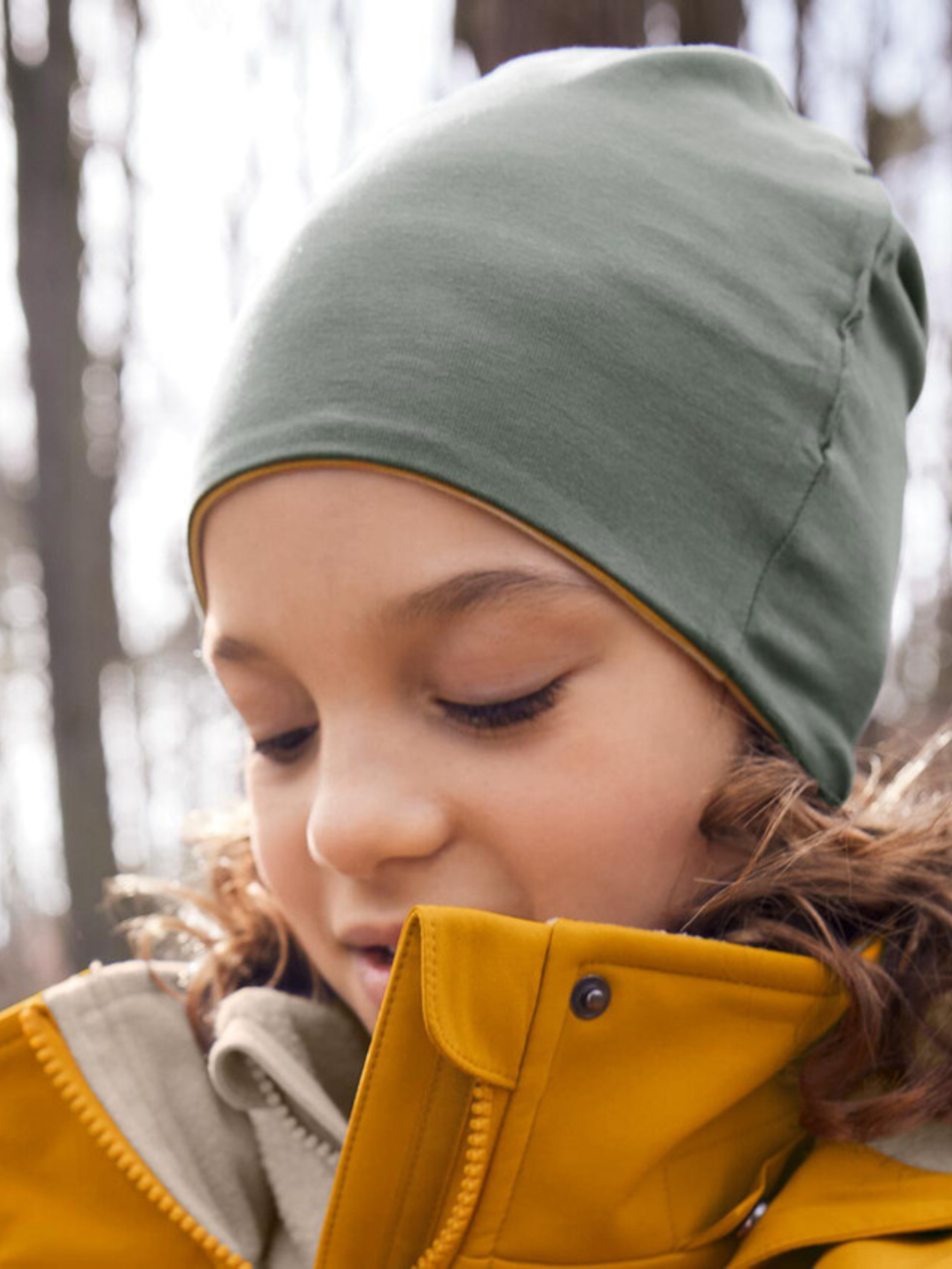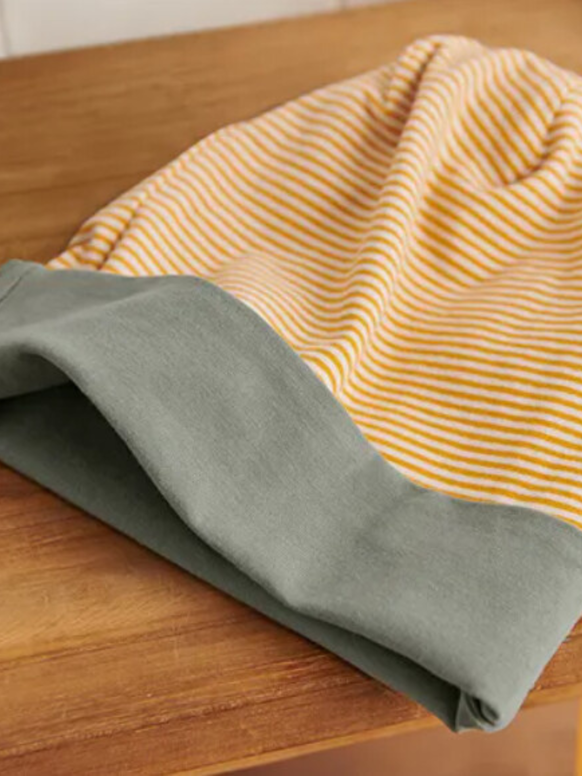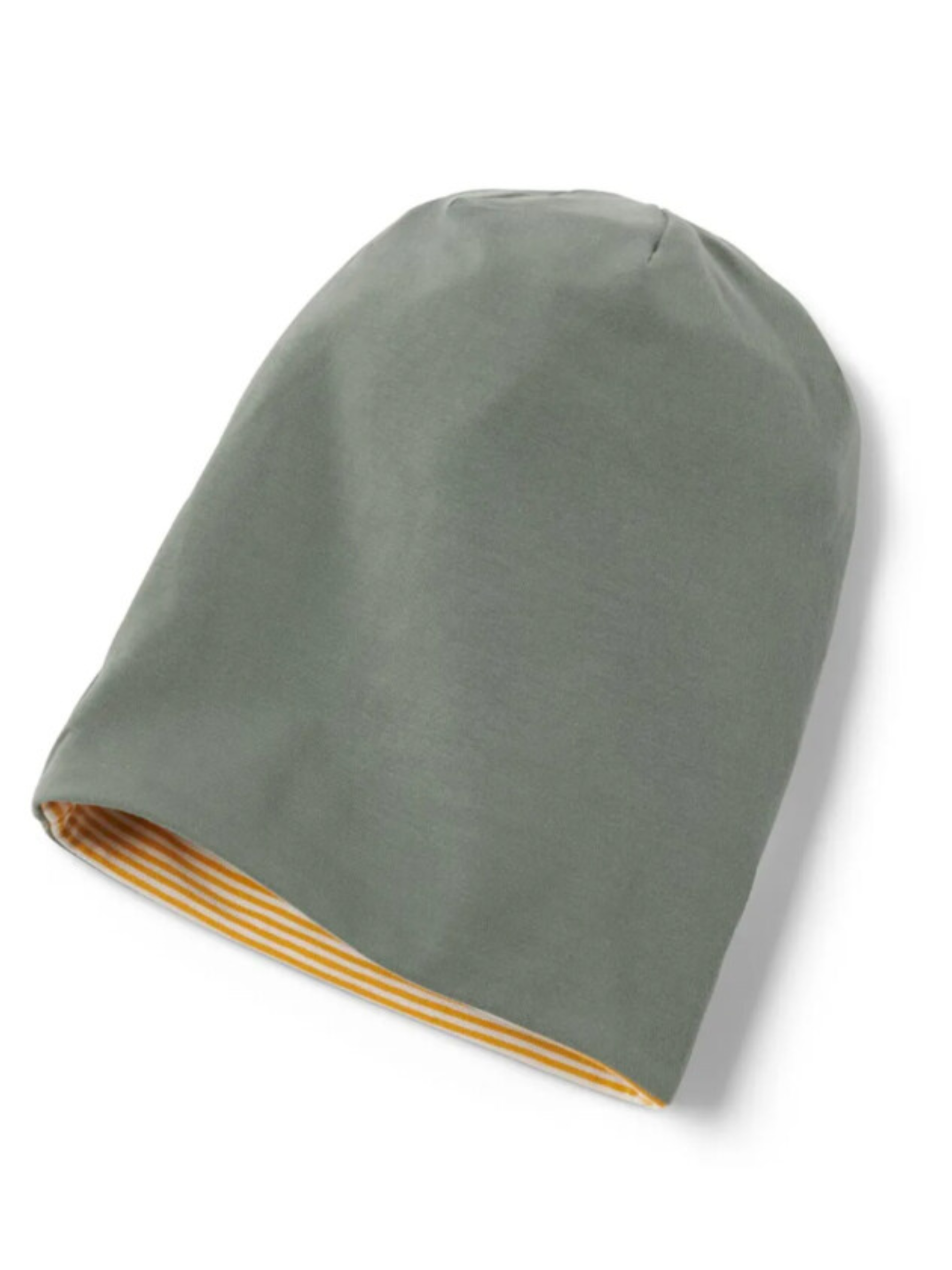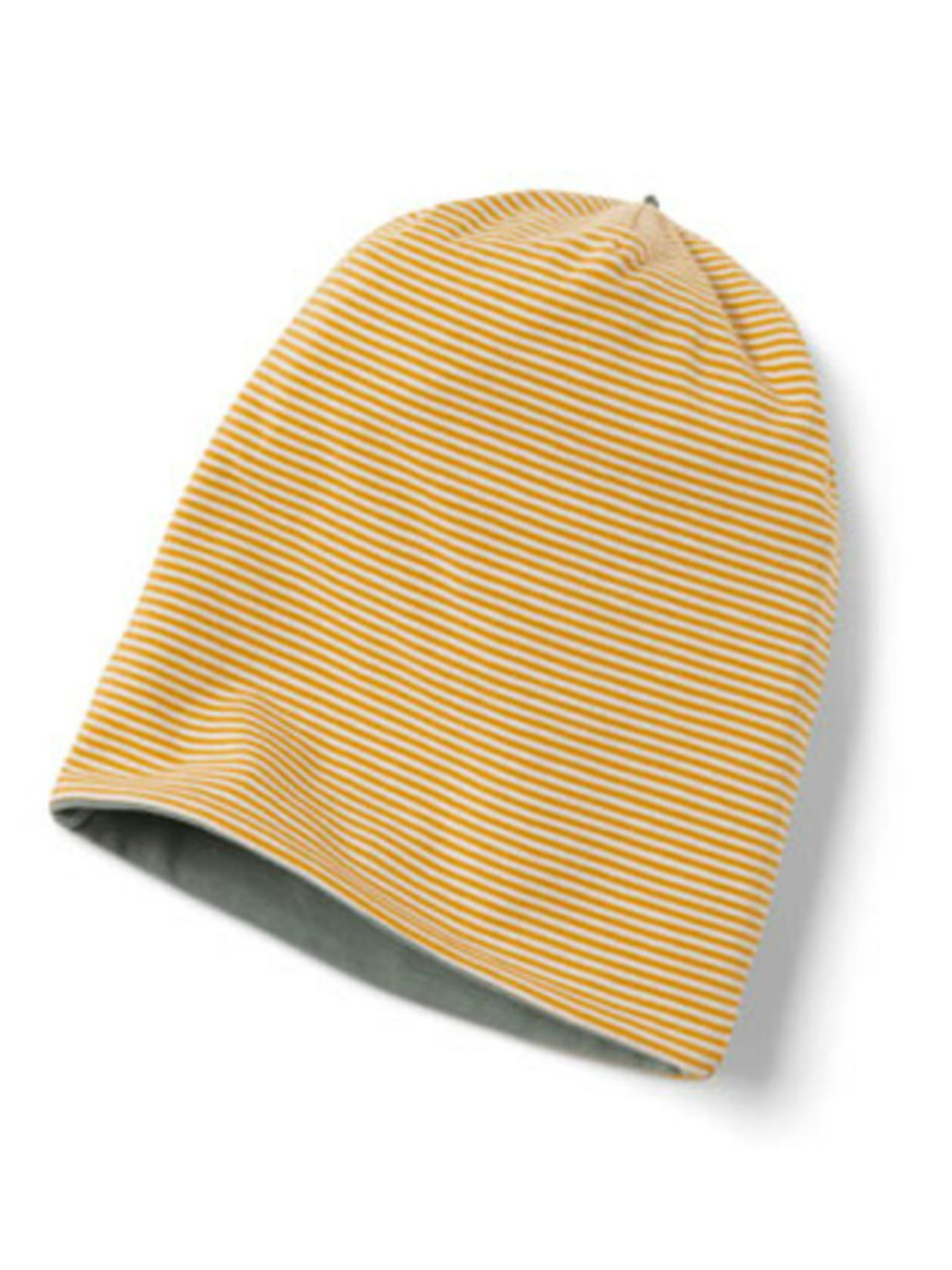 М’яка трикотажна шапка у формі біні — зручна, приємна до тіла й універсальна завдяки двосторонньому дизайну. Одна сторона виконана у жовто-білу смужку, інша — однотонна зелена. Завдяки еластану шапка добре тримає форму, забезпечує ідеальну посадку та комфорт під час носіння. Виготовлена з органічної бавовни, сертифікована за стандартом GOTS, протестована зовнішніми інститутами на відсутність шкідливих речовин. Ця шапка допомагає захищати водні ресурси. Матеріал: 95% бавовна (органічно вирощена), 5% еластан