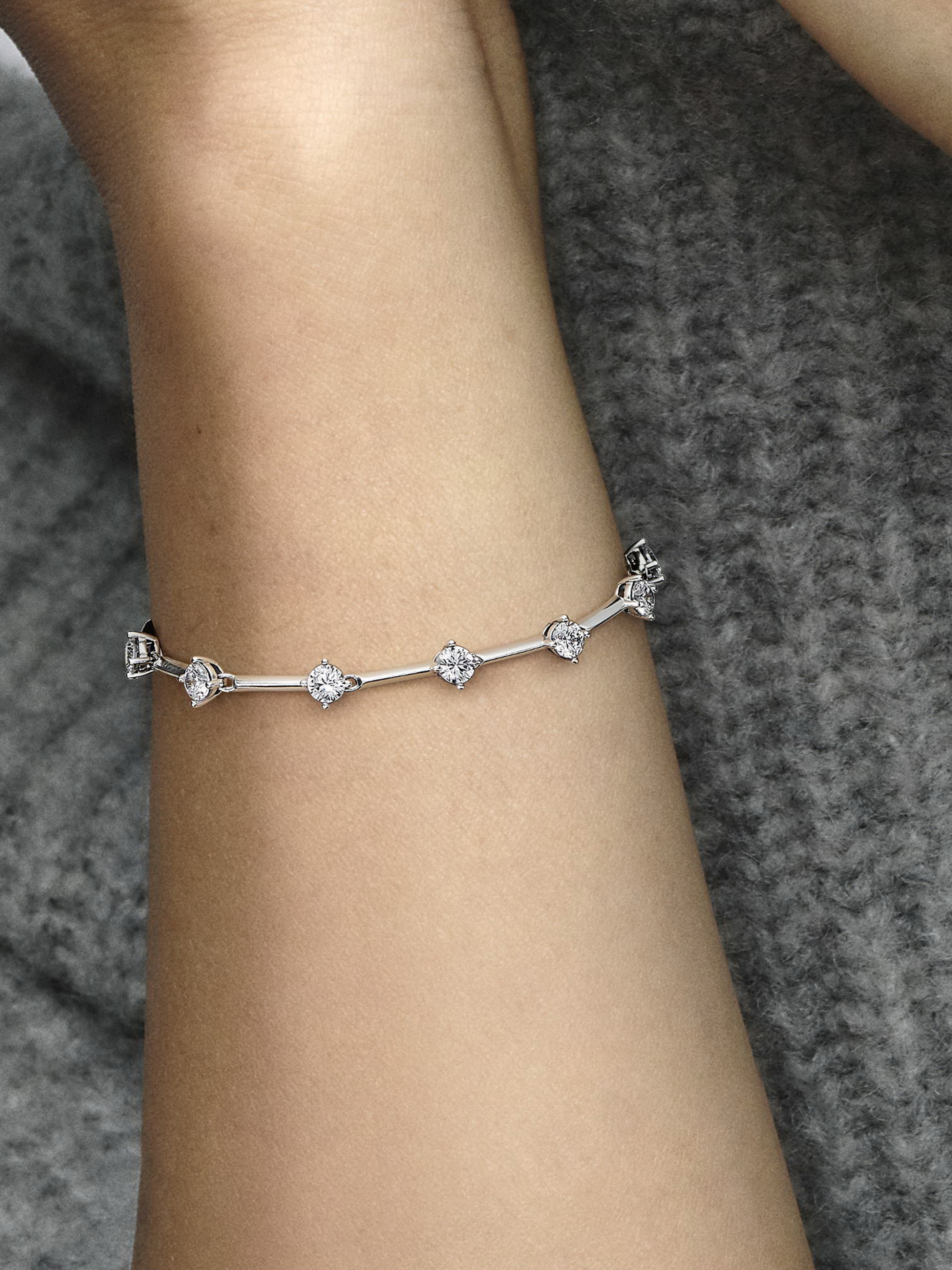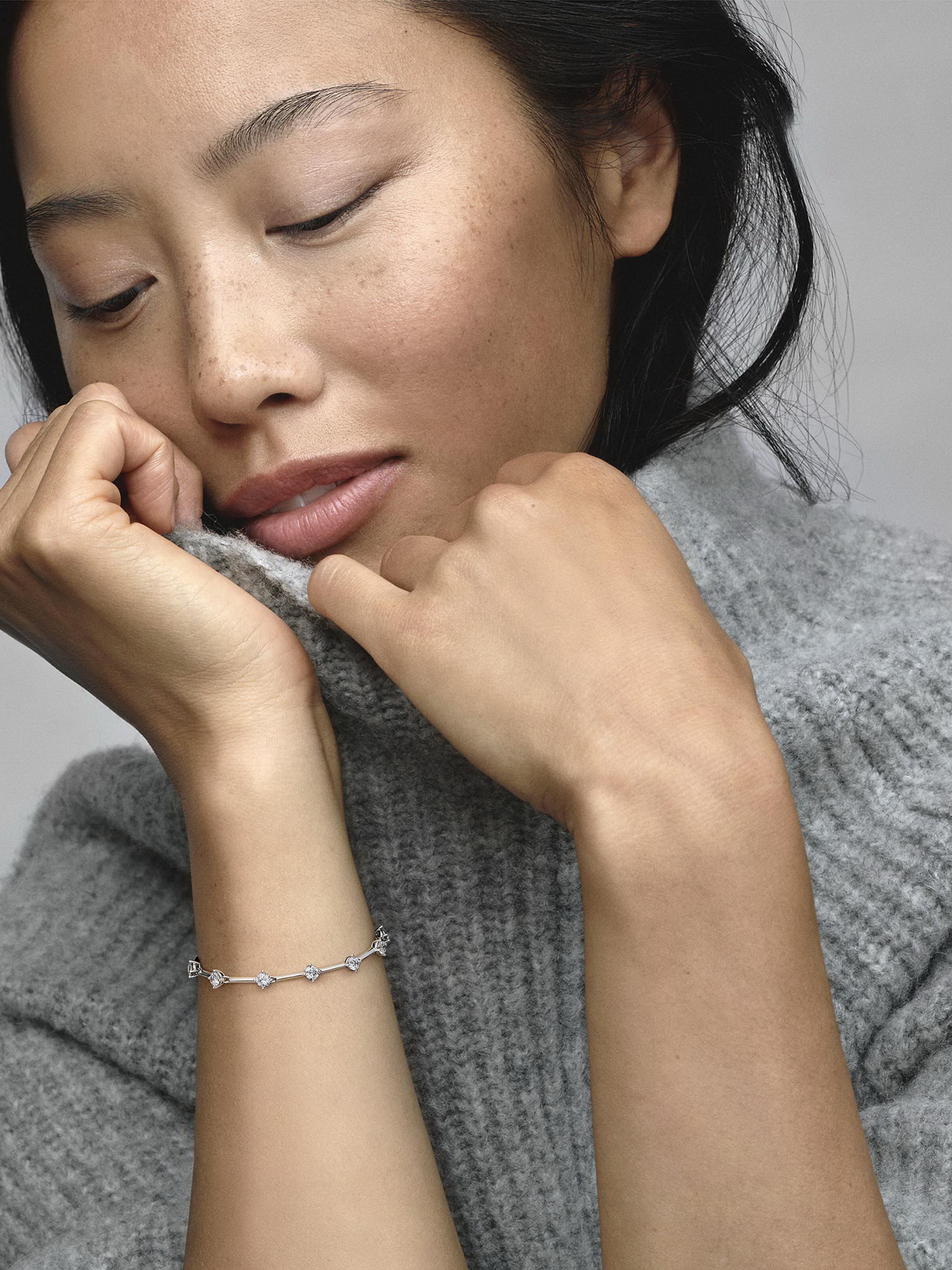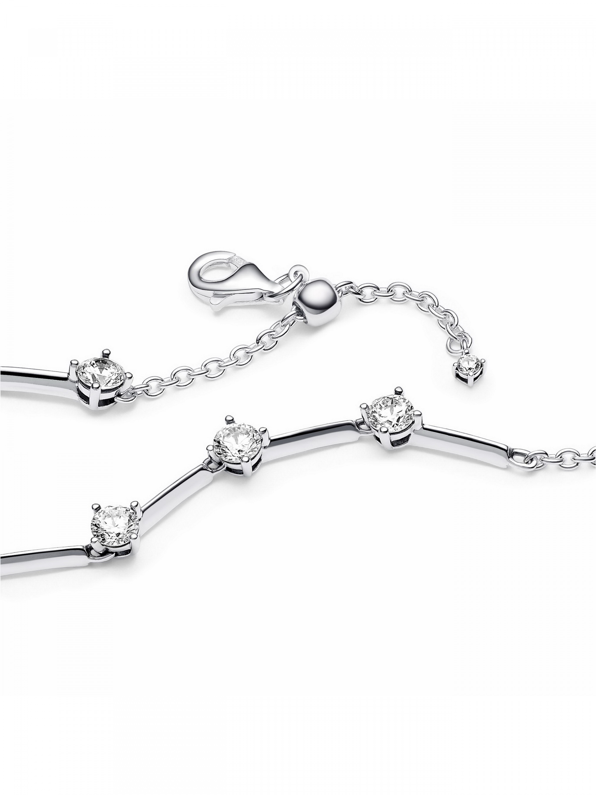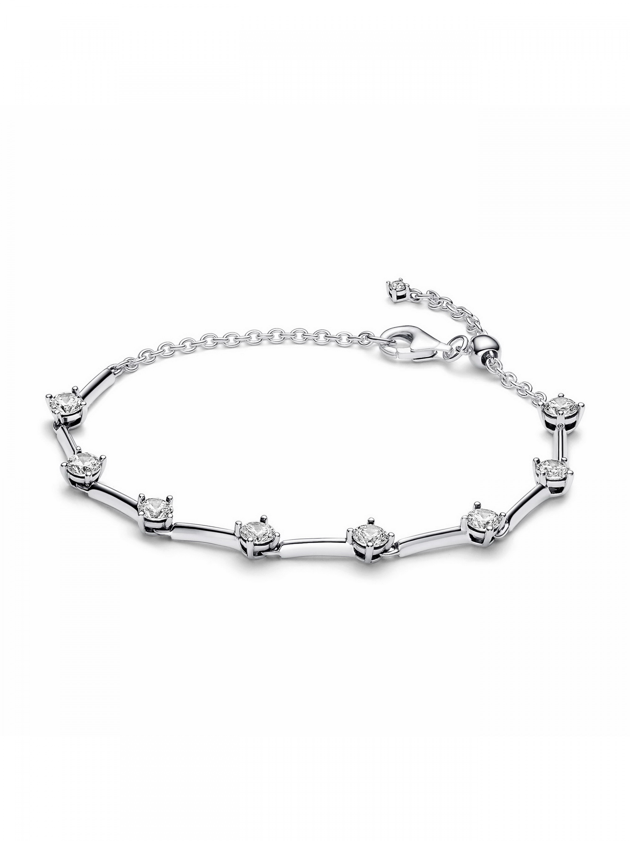 Обирайте сучасну класику з браслетом "Блискучі пластини". Цей браслет зі срібла 925-ї проби має ряд тригранних пластин, що розділені вісьмома блискучими каменями кубічного оксиду цирконію. Усі срібні пластини з’єднані між собою кільцями, що забезпечують гнучкість і динамічність браслета. Регульована застібка має звисаючий ланцюжок з одним акцентним камінцем. Самостійний або в поєднанні з іншими прикрасами, цей класичний браслет має безмежний потенціал для стилізації.