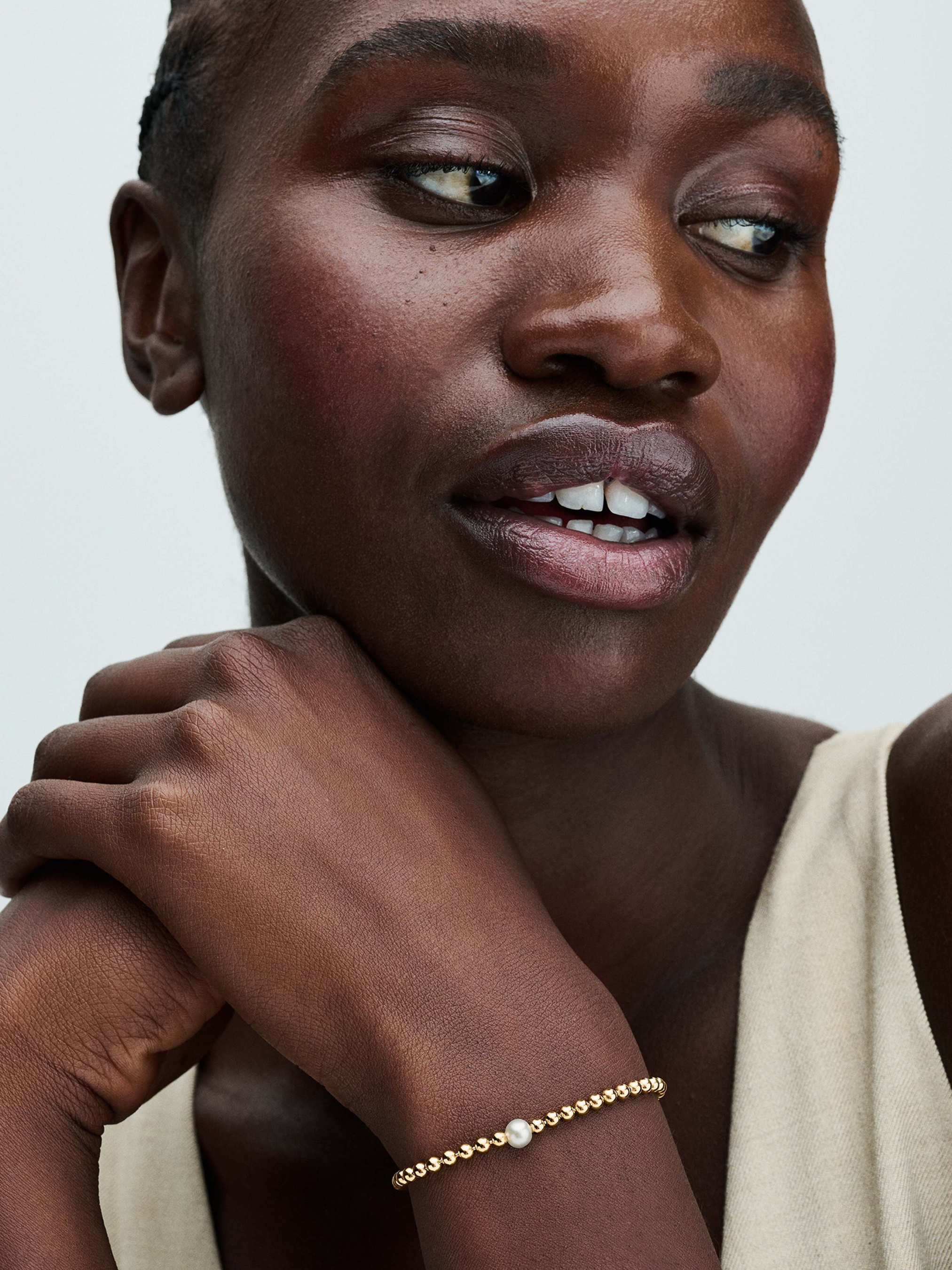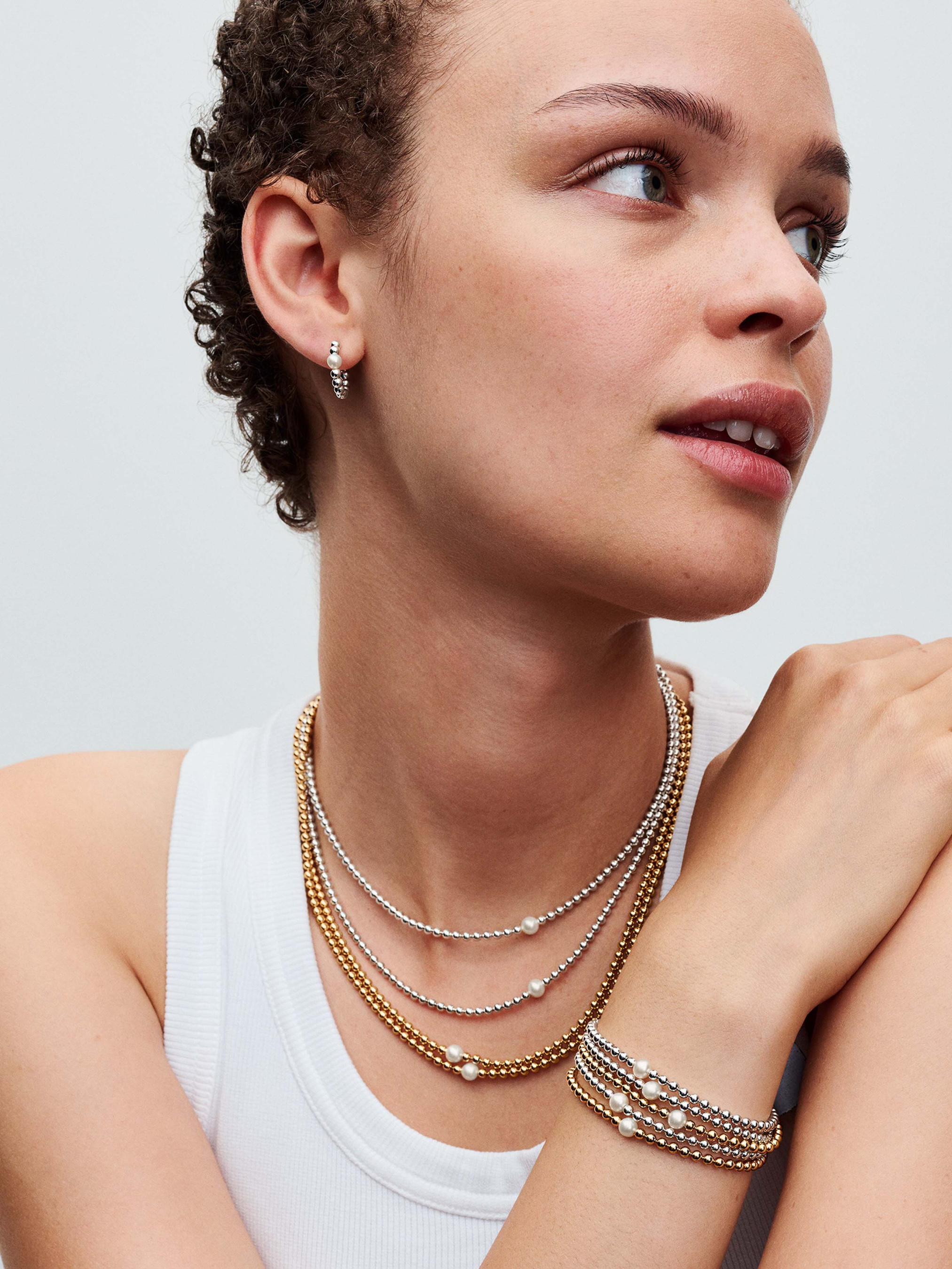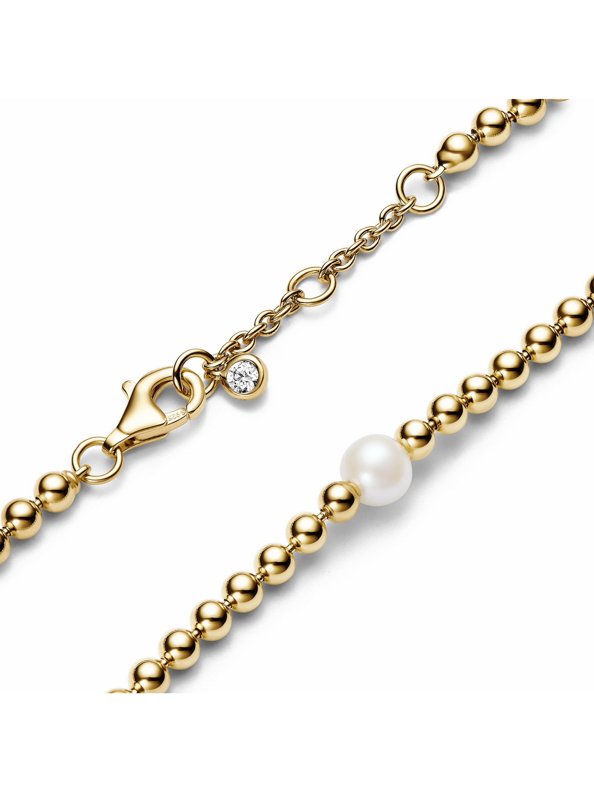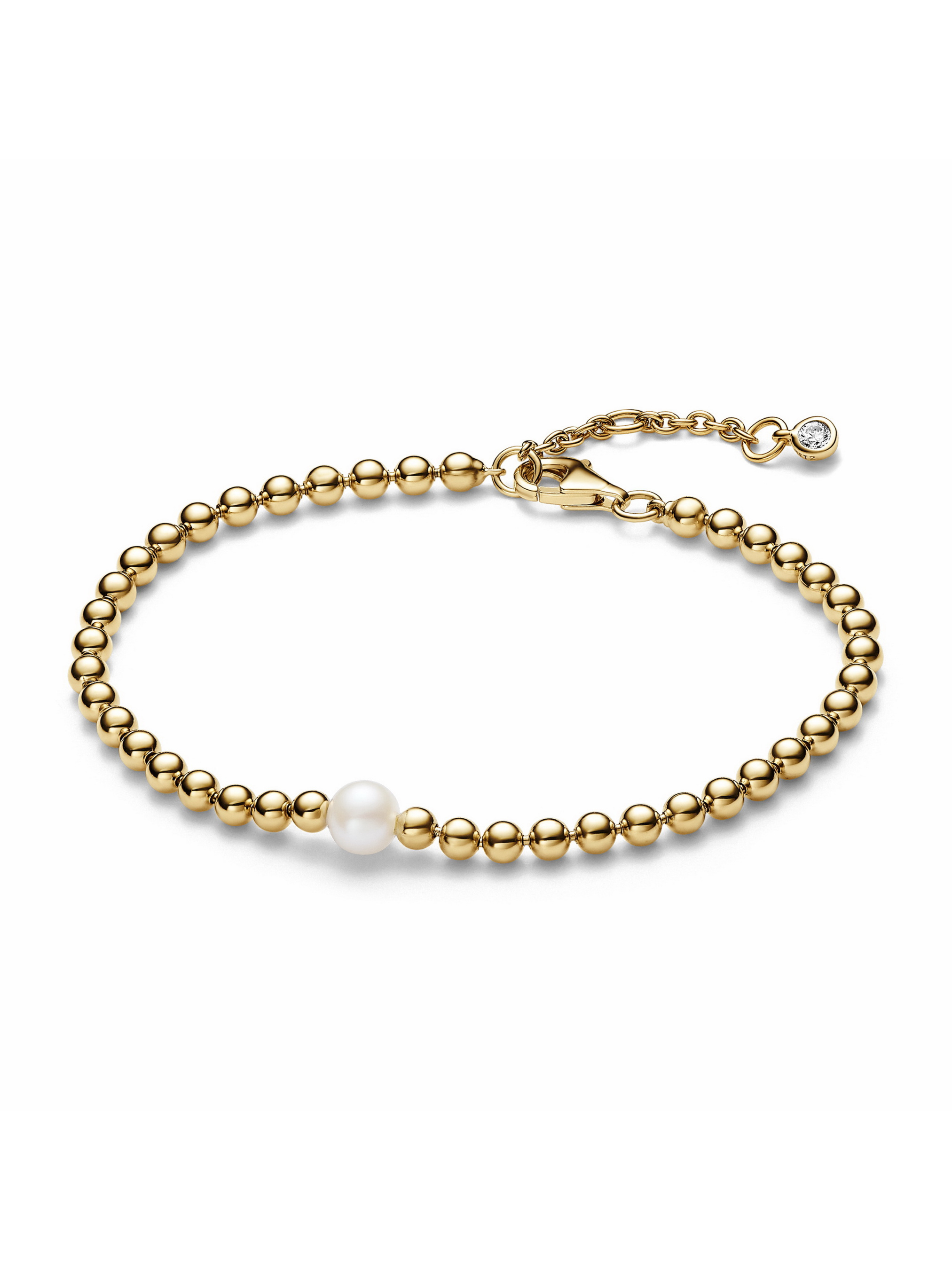 Відчуйте обійми сяйва з нашим браслетом "Бісер та перлина", вкритим золотом 14k. Центральним елементом є перлина, яка оточена полірованими металевими намистинами, відображаючи суть Pandora Timeless. Біля застібки сяє камінець кубічного оксиду цирконію, який надає витонченого блиску прикрасі. Унікальна та символічна оброблена прісноводна культивована перлина втілює красу, мудрість та любов. Зверніть увагу, що кожна оброблена прісноводна культивована перлина є унікальною і може відрізнятися за розміром та кольором. Цей матеріал може змінюватися під впливом часу та навколишнього середовища. Наші прісноводні культивовані перли обробляються відбілюванням та підсиленням блиску.