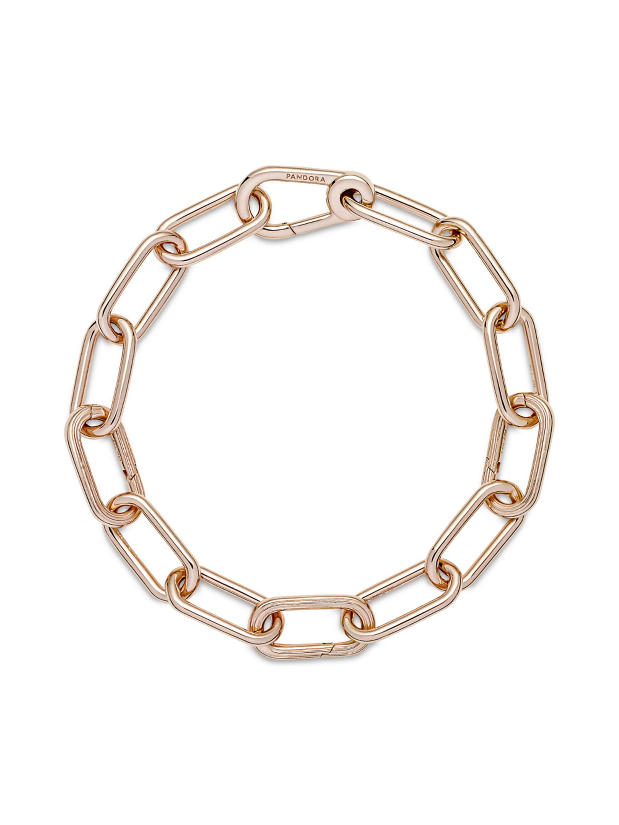 Напишіть власну мантру на вашому зап'ясті. Ланковий браслет Pandora ME, що вкритий рожевим золотом 14k, відкриває світ безмежних можливостей для стилізації. Цей браслет містить три рельєфних з'єднувача, що відкриваються, ланки для стилізації та застібку-карабін. Спочатку персоналізуйте дизайн ланкового ланцюжка: один набір з'єднаних між собою ланок для стилізації можна замінити на чотири невеликих з'єднаних між собою ланки, подвійну ланку для стилізації або одну ланку для стилізації, при цьому ви можете, за необхідності, відкоригувати довжину ланцюжка. Щойно дизайн ланцюжка буде персоналізовано, доповніть прикрасу щонайбільше двома змістовними медальйонами або вісьмома міні-підвісками на кожному з'єднувачі, що відкривається, або закріпіть по одному медальйону на кожній ланці для стилізації, щоб продемонструвати світові унікальність і багатогранність вашої особистості.