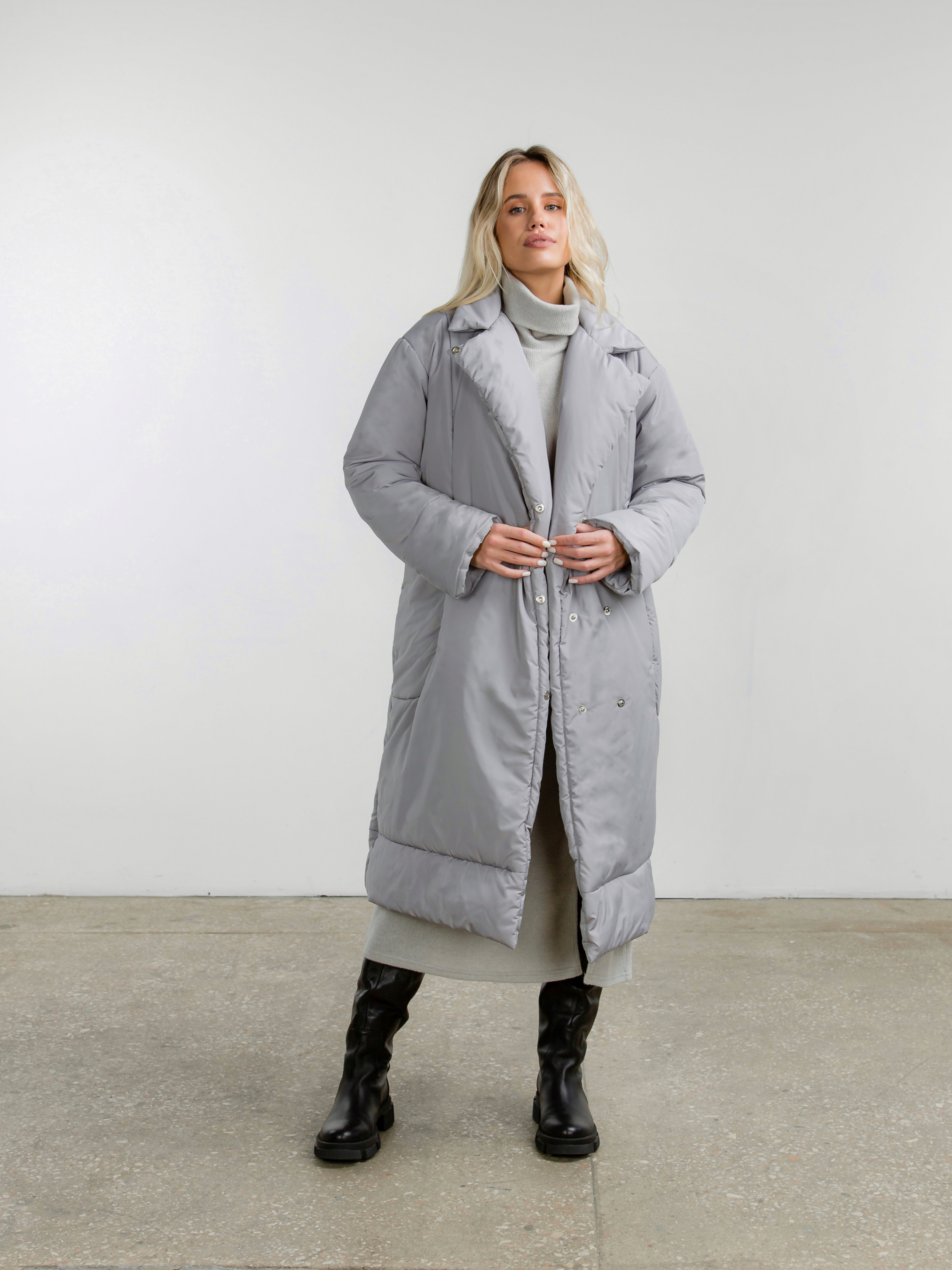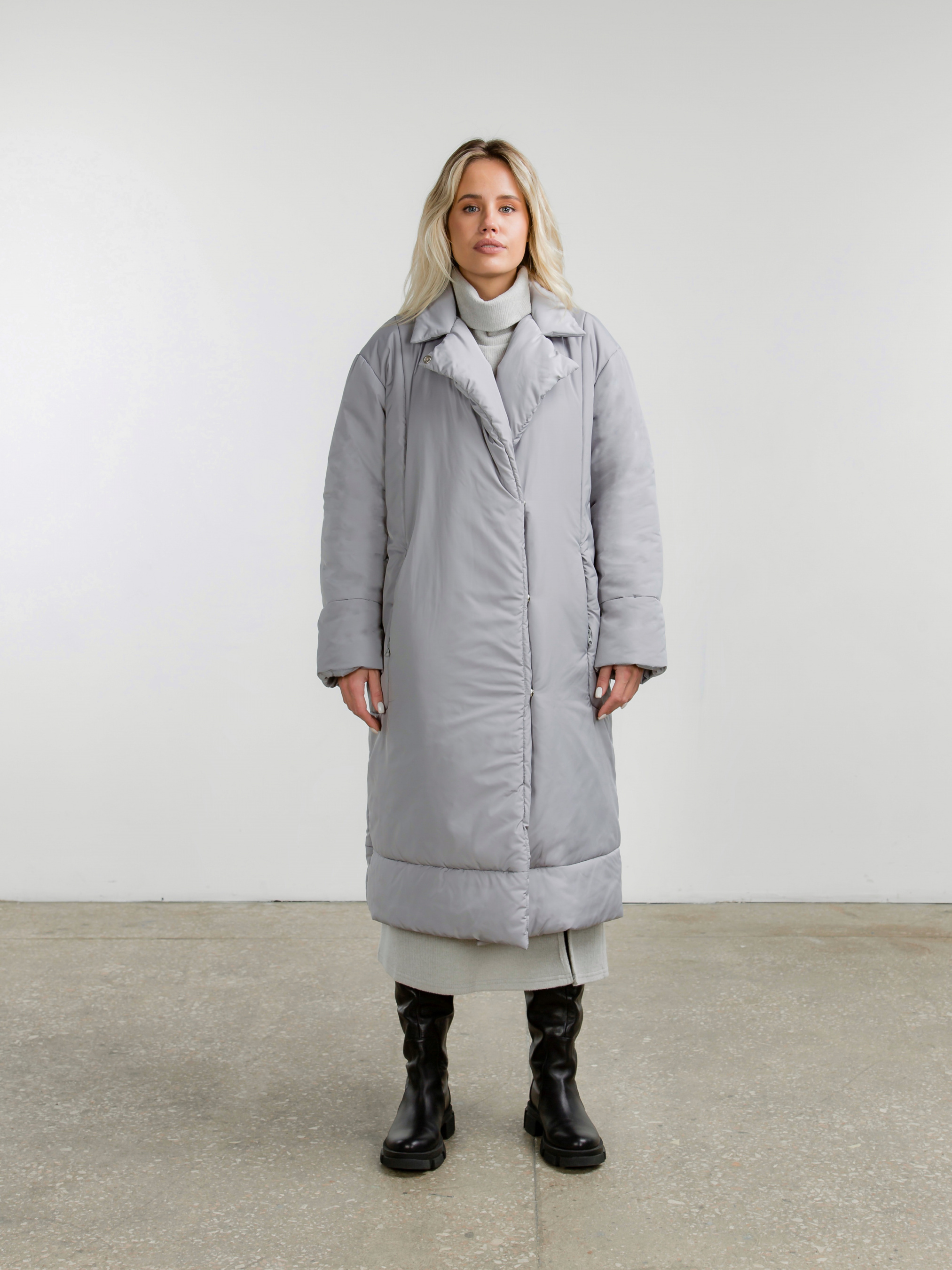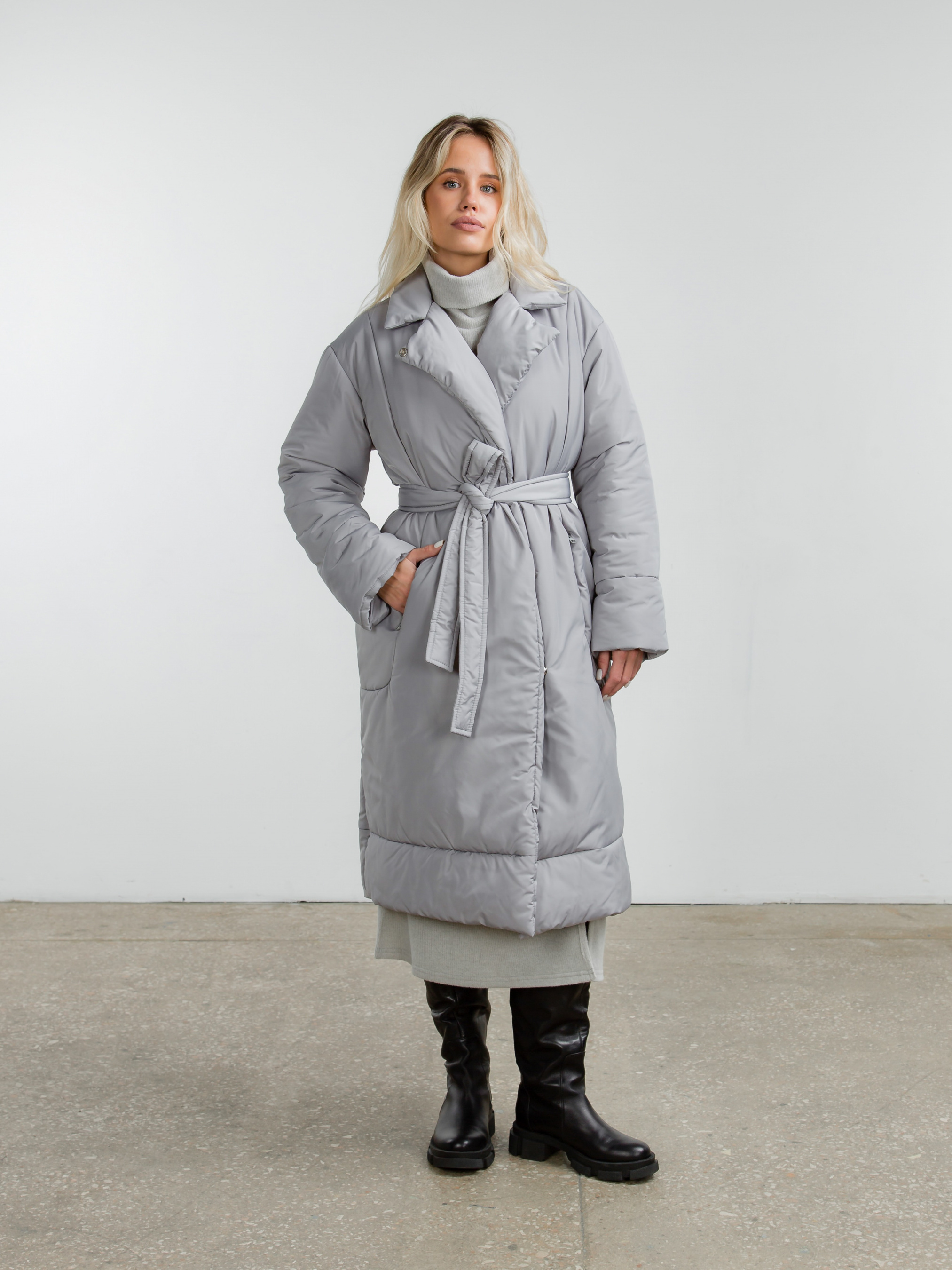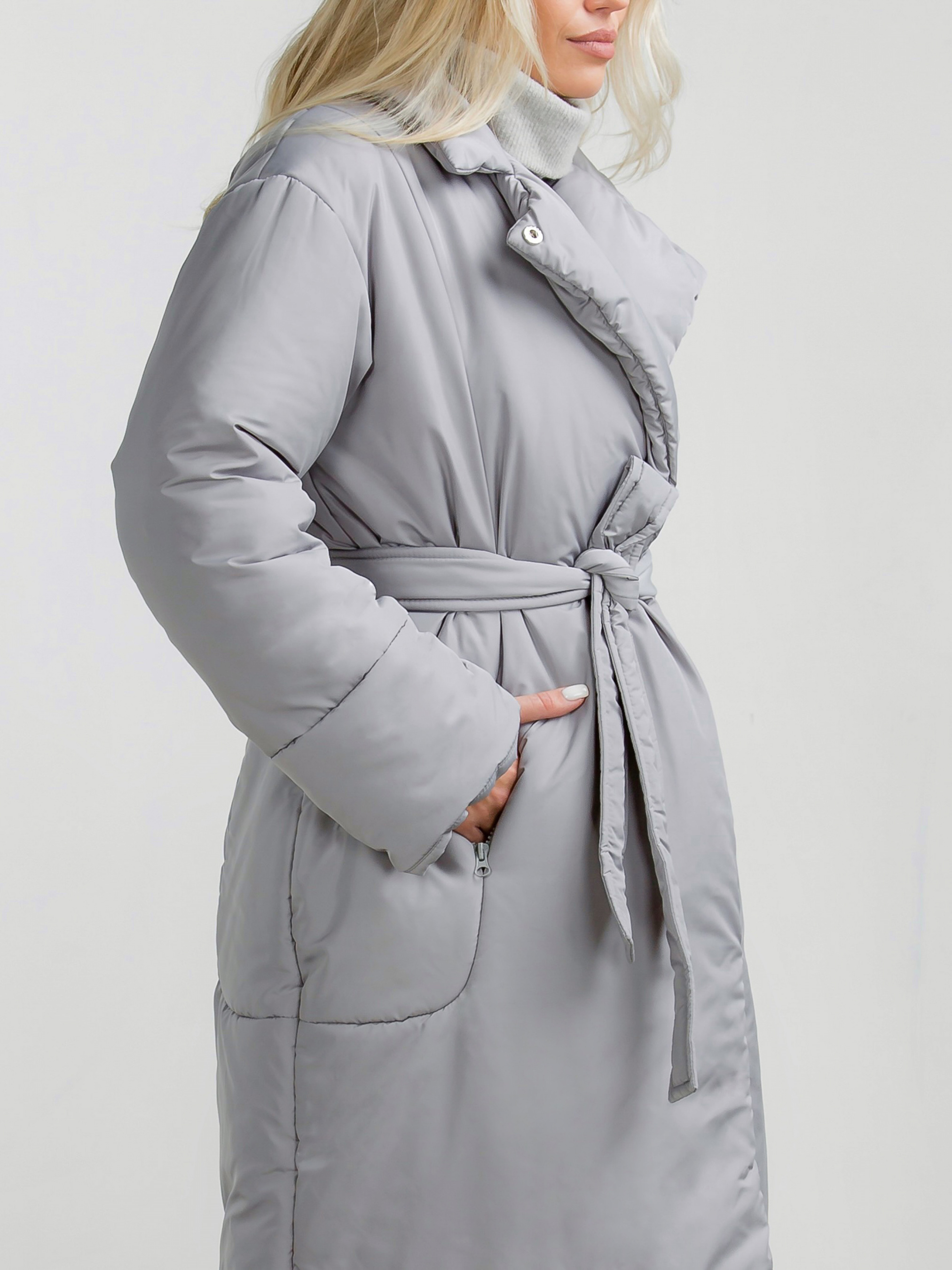 Зимовий пуховик з V-подібним коміром, який можна застебнути під горло. Застібається всередині на два ряди кнопок. Наповнювач синтепуху, який не дасть замерзнути в погоду до -20 градусів. У комплекті пояс, за допомогою якого можна зробити акцент на талії. Кишеньки на флісі.