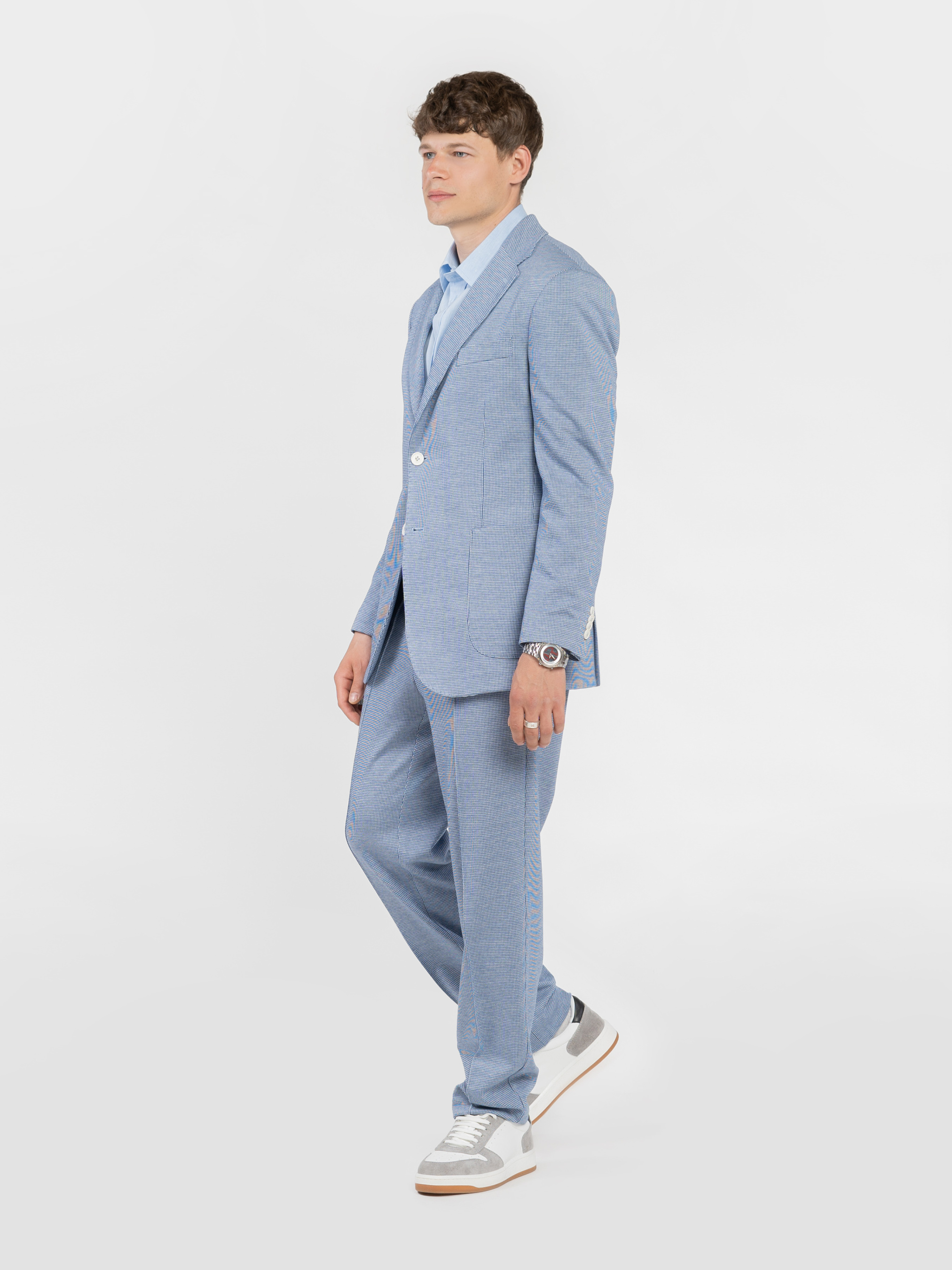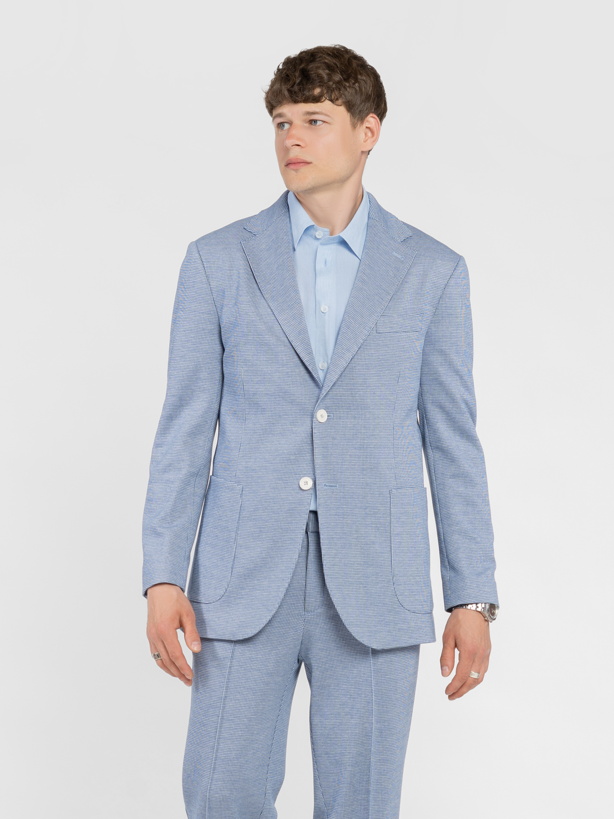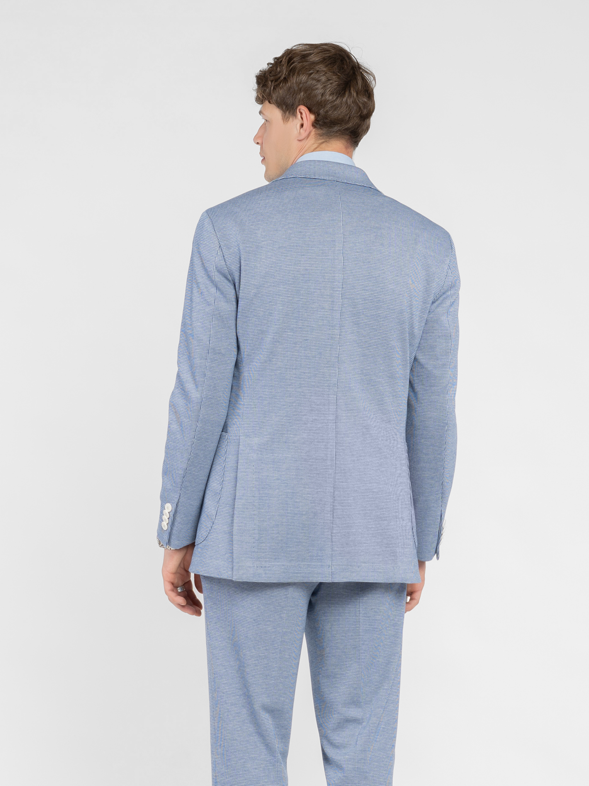 Чоловічий піджак Arber блакитного кольору, виготовлений з інноваційної тканини з додаванням віскози. Інноваційні добавки забезпечують вільну циркуляцію повітря, а тканина практична, не мнеться і стійка до забруднень. Модель із застібкою на 2 ґудзики, з прямими лацканами, напівпідкладкою, двома накладними кишенями та двома шліцами. Вдало поєднується із брюками M01.26.16.512 з тієї ж тканини. Модель на фото у розмірі 48. Зріст: 183 см. Параметри: 97/86/96