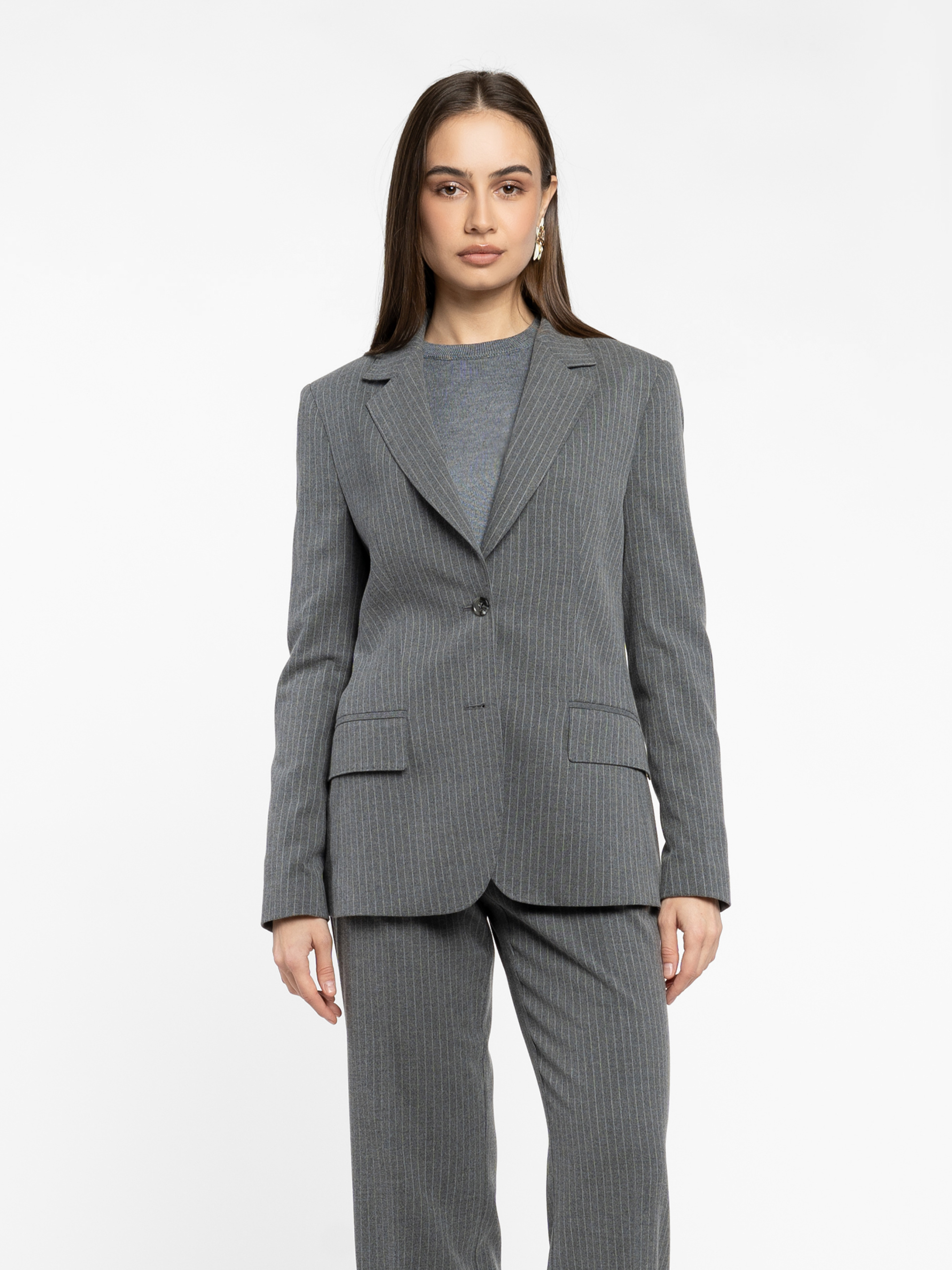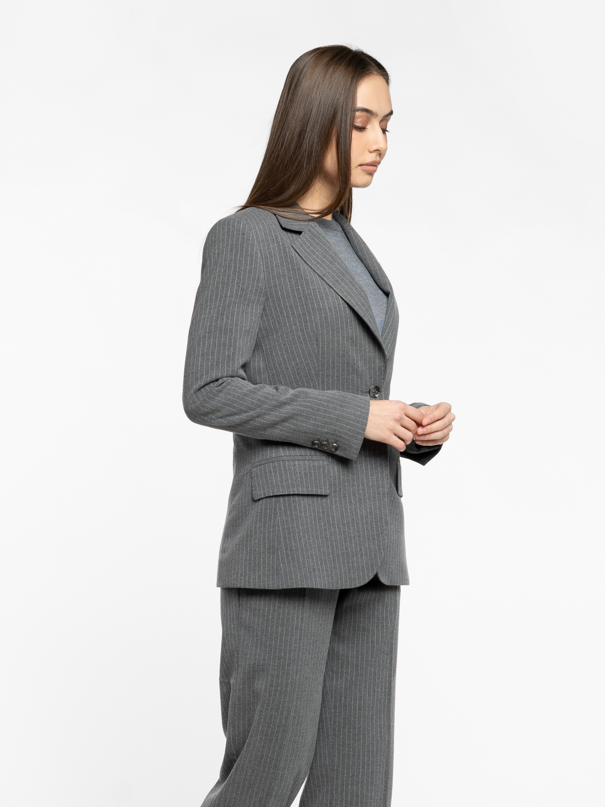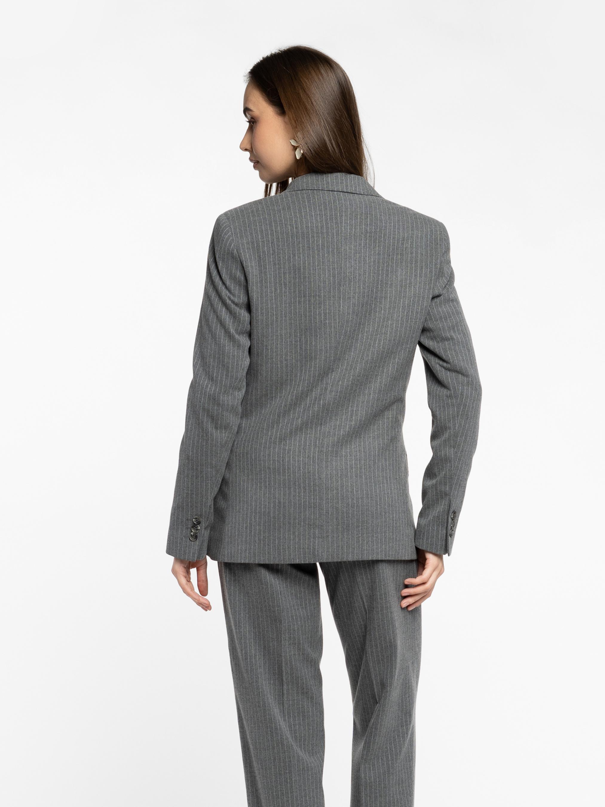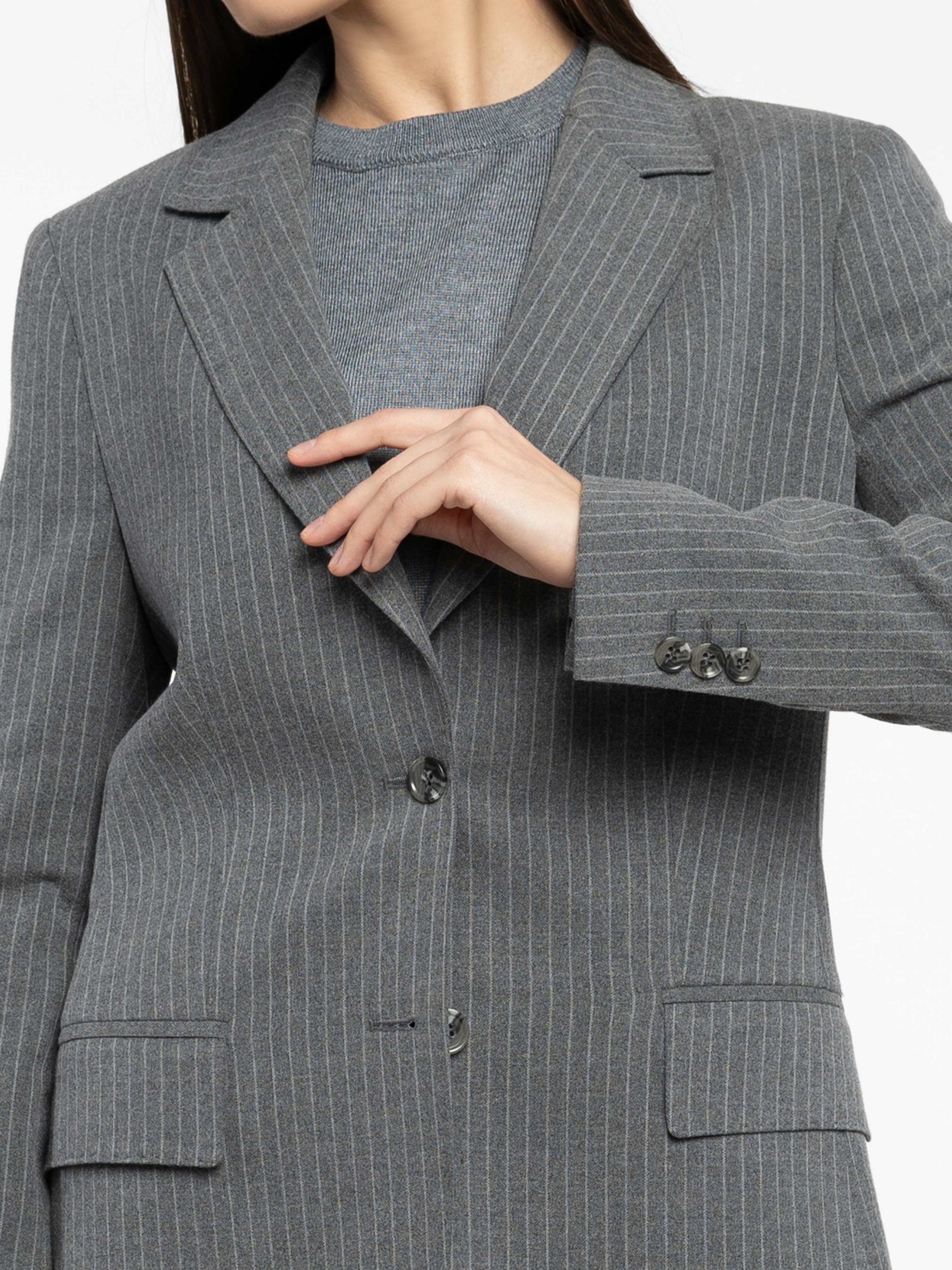 Жіночий жакет Arber сірого кольору у стриману смужку, виконаний з м’якої тканини з додаванням віскози. Напівприталений крій створює гармонійний баланс сили та елегантності. Однобортна застібка на ґудзики, прямі лацкани та дві прорізні кишені з клапаном забезпечують ідеальну посадку і функціональність. Стильно доповнює як сучасні брюки, так і витончені спідниці, формуючи елегантний та актуальний total look. Модель на фото у розмірі 44 . Зріст: 168 см. Параметри: 79/60/88
