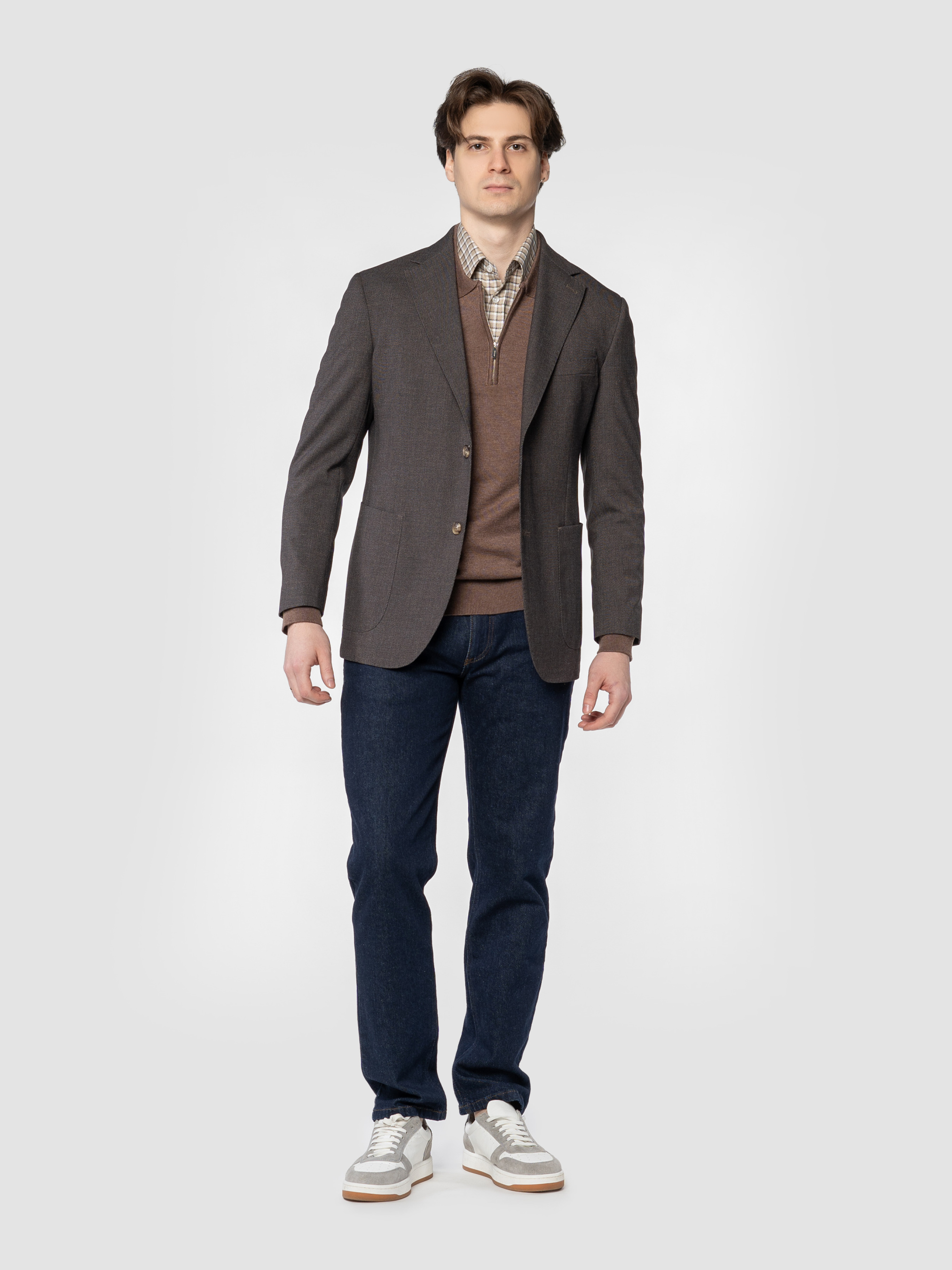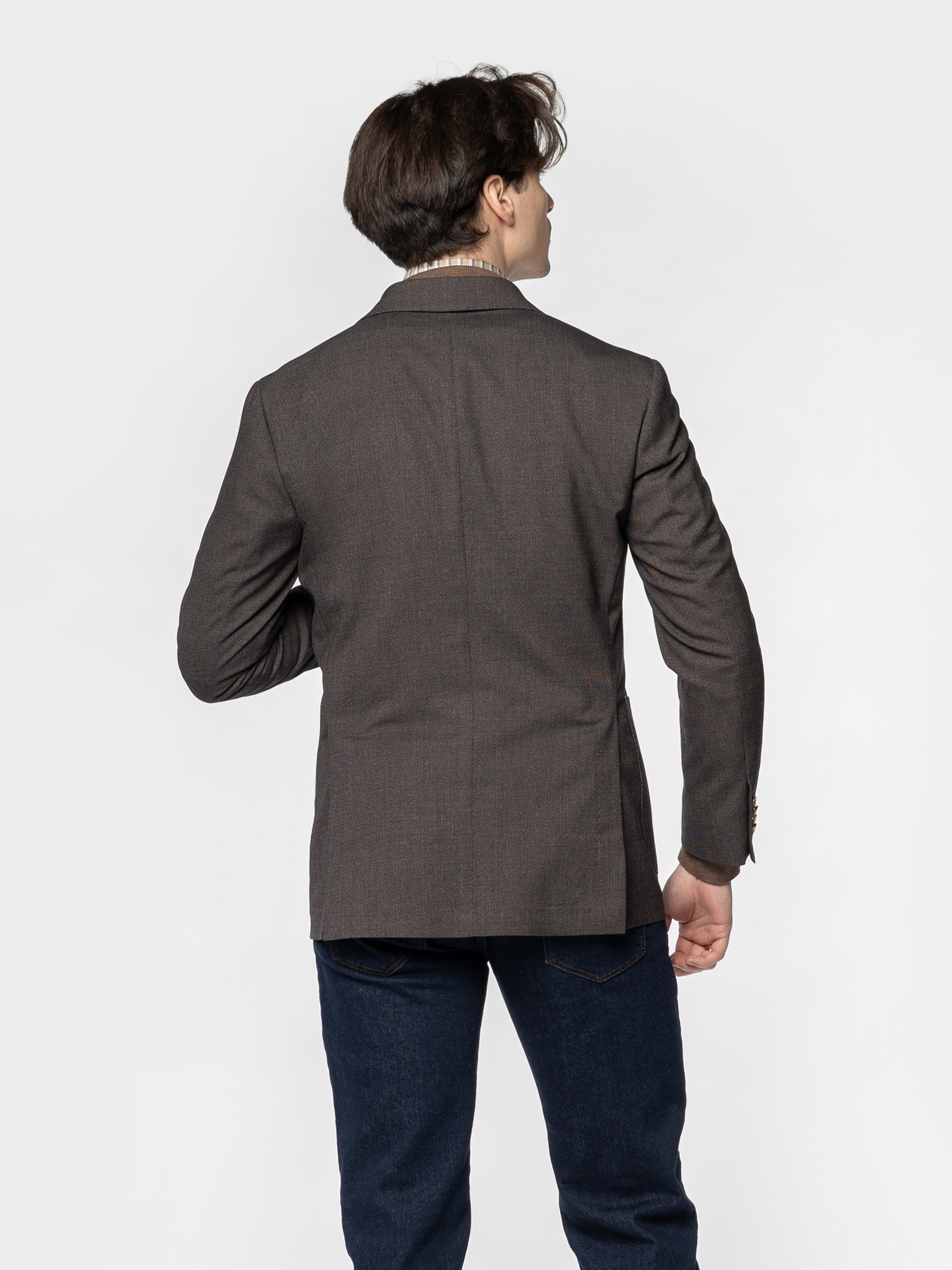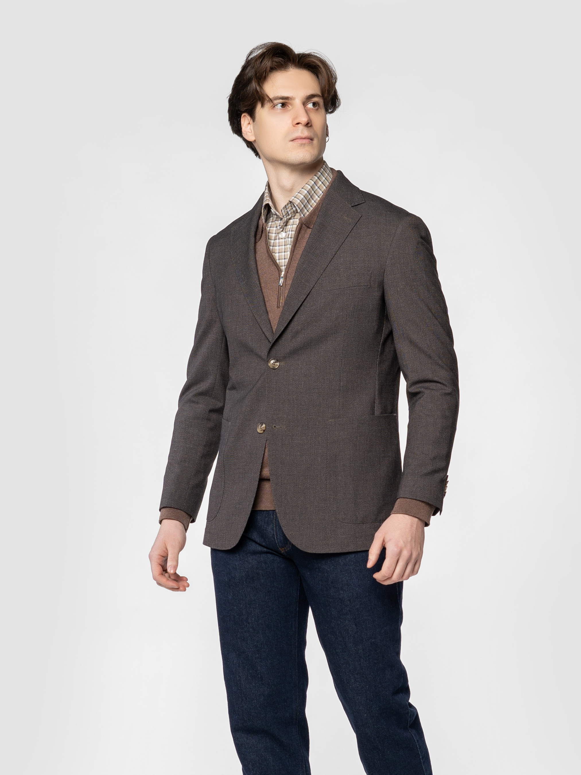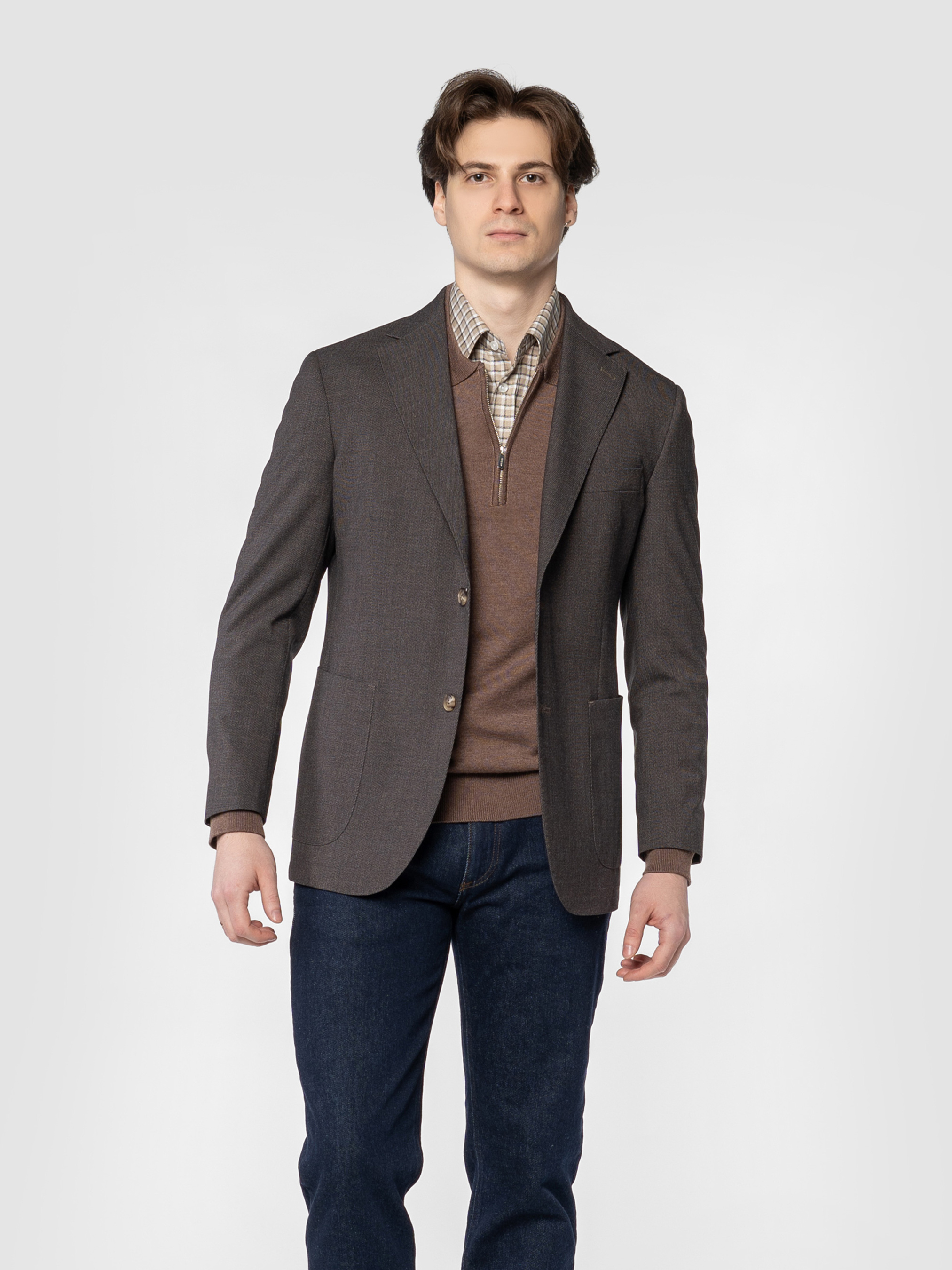 Чоловічий піджак Arber коричневого кольору, створений з м’якої тканини на основі шовковистої віскози з додаванням еластану. Матеріал тягнеться, не мнеться та зберігає форму навіть при активному ритмі дня. Модель має класичний крій, акуратні лацкани та продуману посадку. Оснащений двома накладними кишенями та однією нагрудною. Ідеальний для стильних офісних образів, зустрічей з друзями або вечірніх виходів — легко поєднується з брюками, джинсами. Модель на фото у розмірі 48. Зріст: 185 см. Параметри: 103/78/100