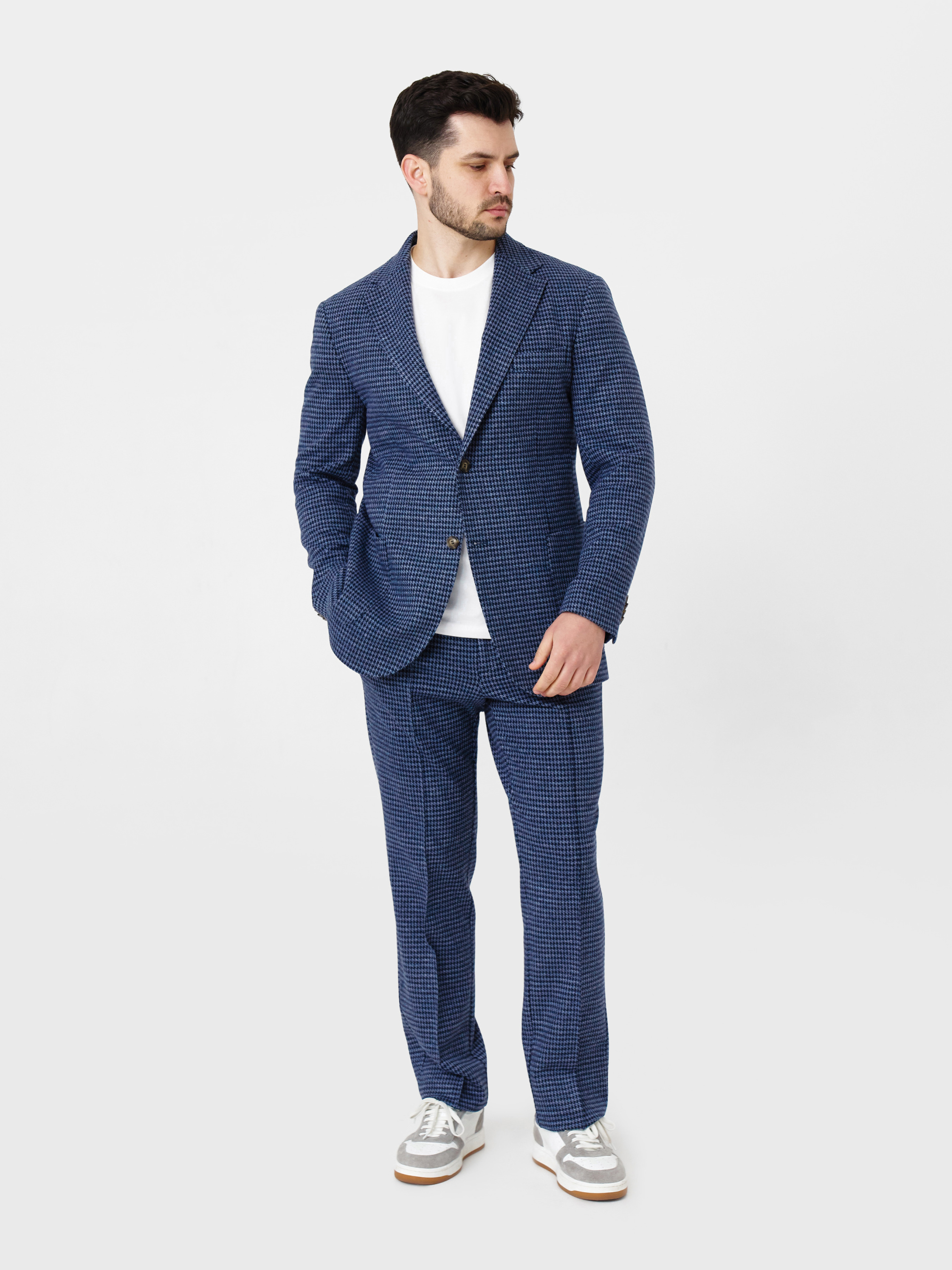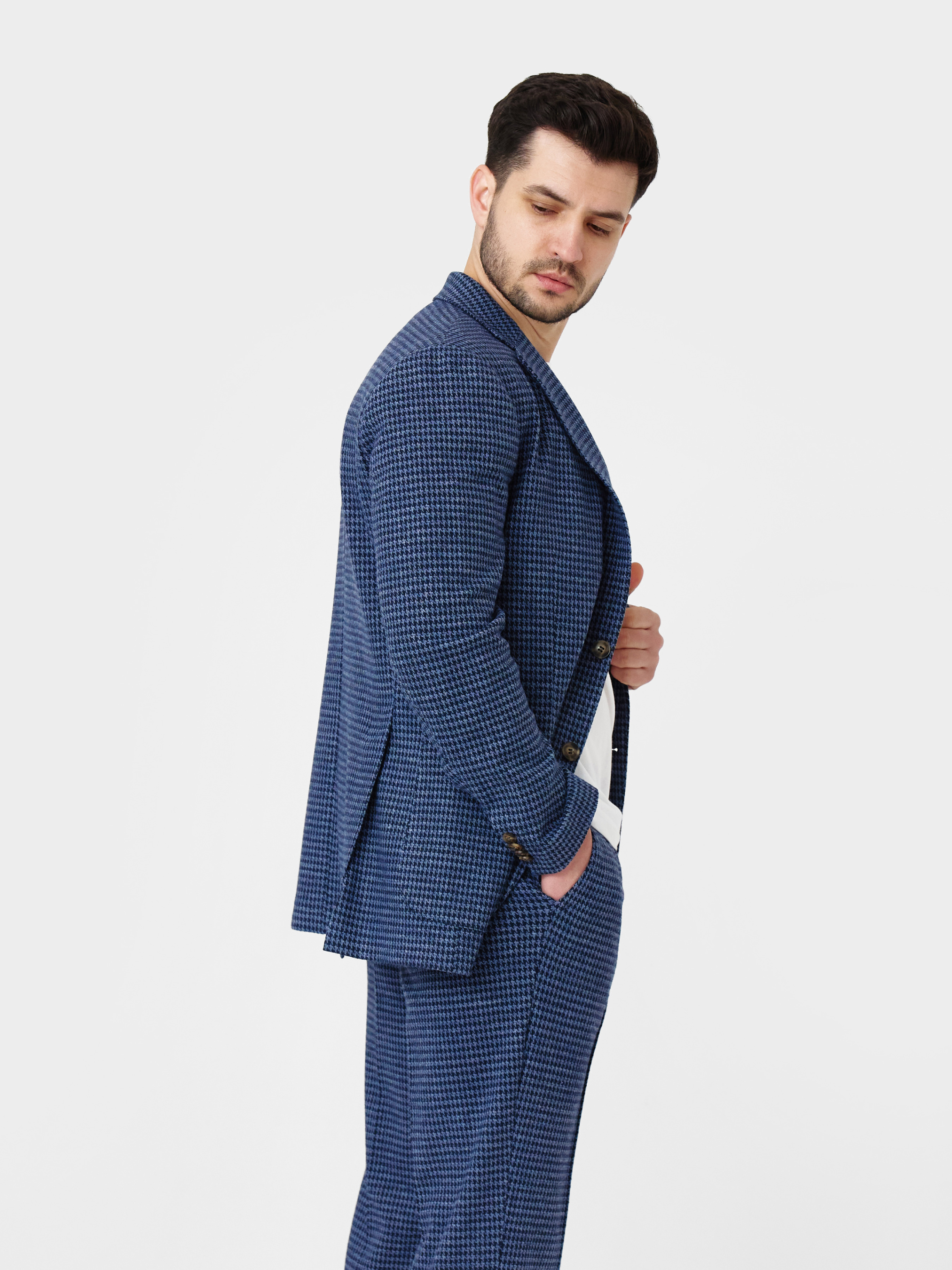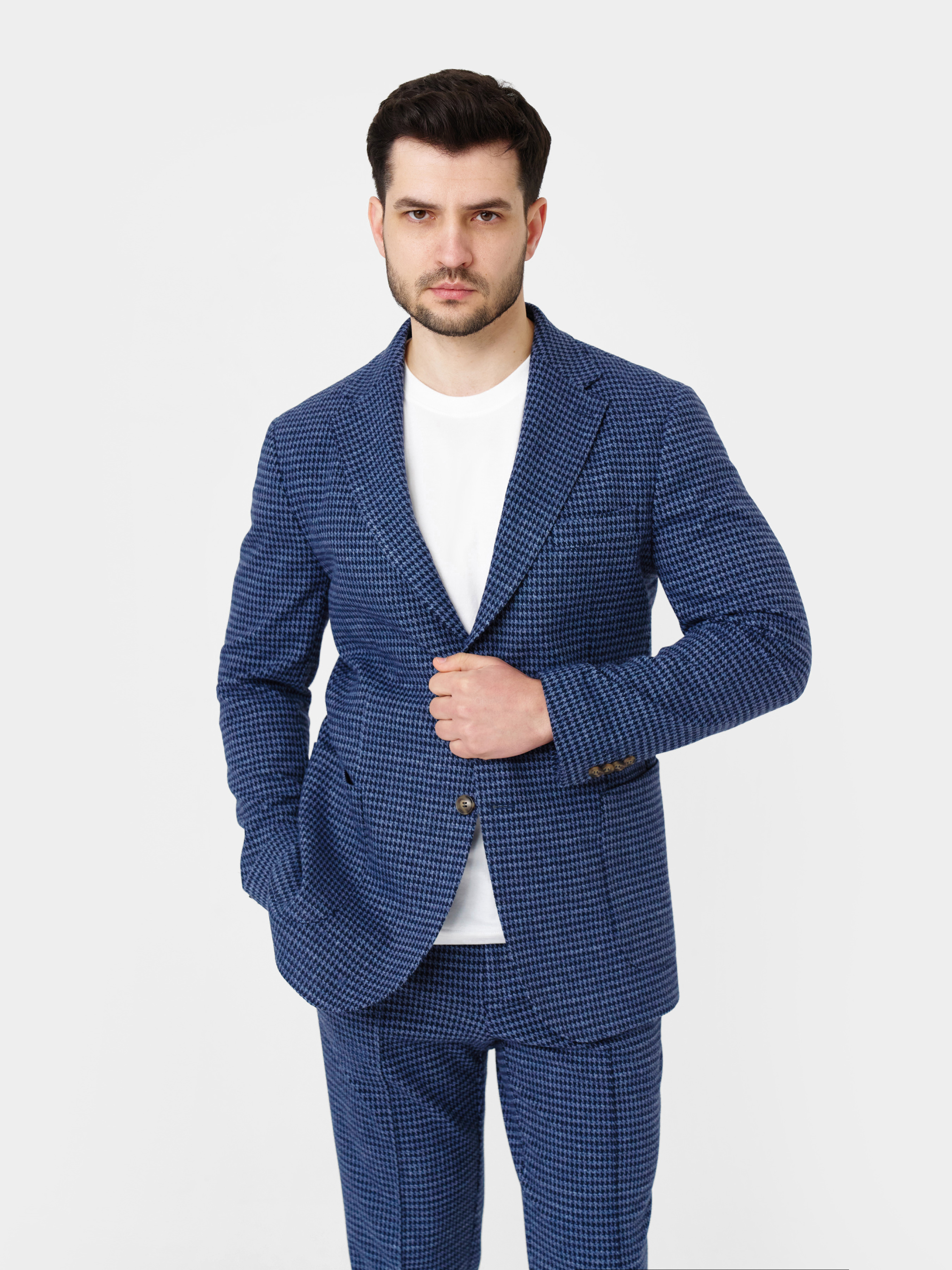 Чоловічий піджак Arber синього кольору, створений з трикотажної тканини на основі шовковистої віскози з додаванням еластану. Матеріал тягнеться, не мнеться та зберігає форму навіть при активному ритмі дня. Модель має класичний крій, акуратні лацкани та продуману посадку. Оснащений двома накладними кишенями та однією нагрудною. Ідеально виглядає у комплекті з брюками M01.09.06.611 з тієї ж тканини, для стильних офісних образів, зустрічей з друзями або вечірніх виходів — легко поєднується з брюками, джинсами. Модель на фото у розмірі 48. Зріст: 188 см. Параметри: 110/80/100