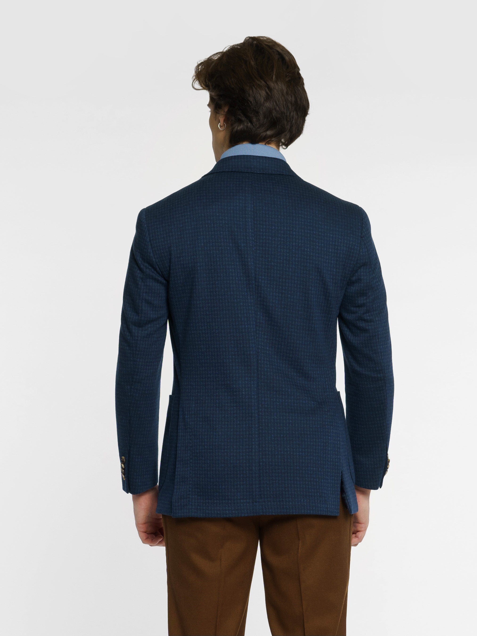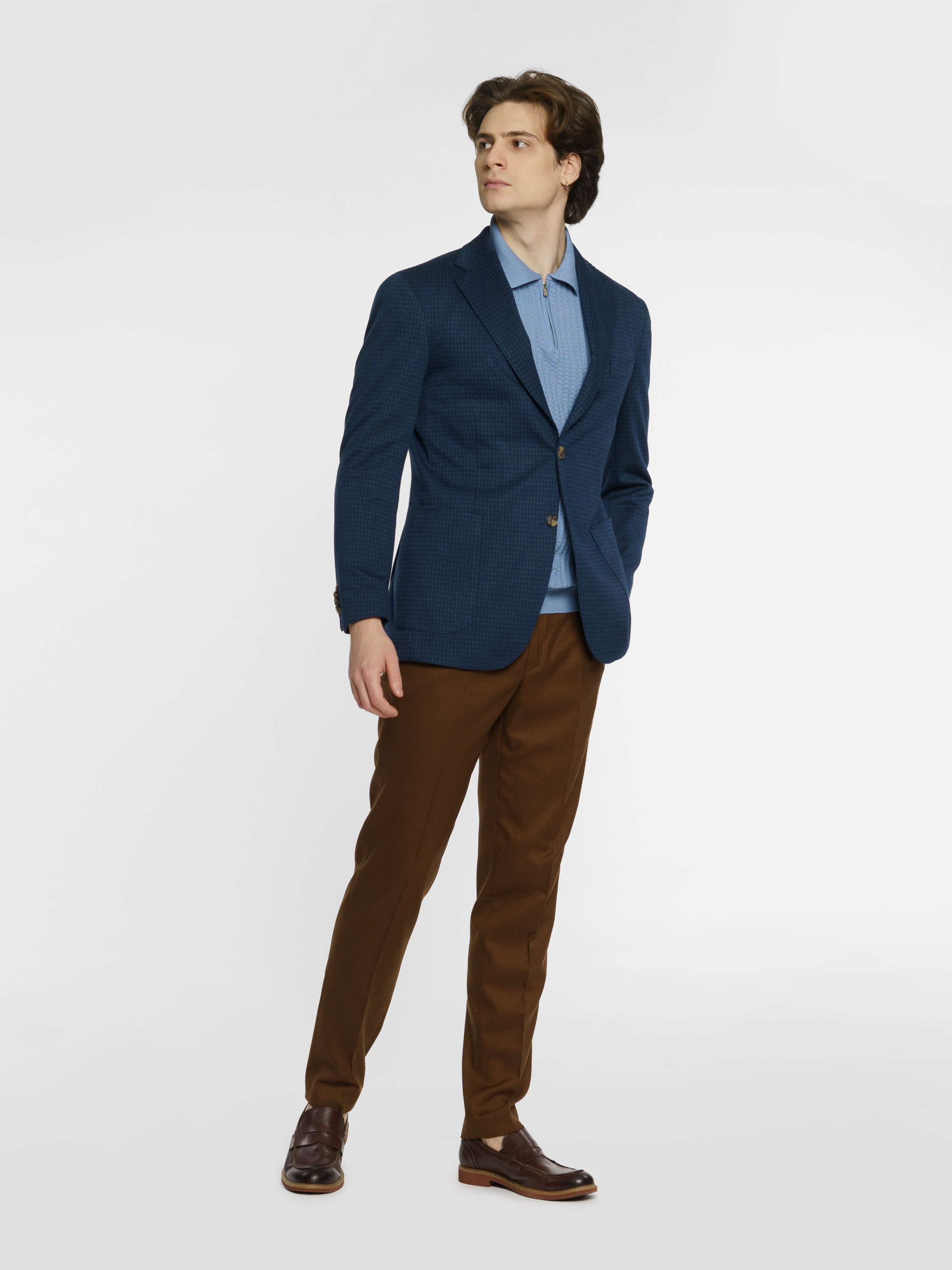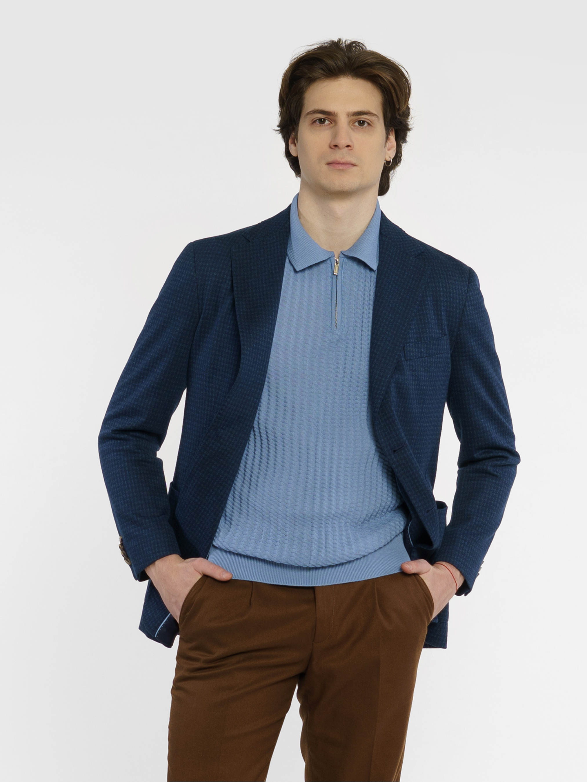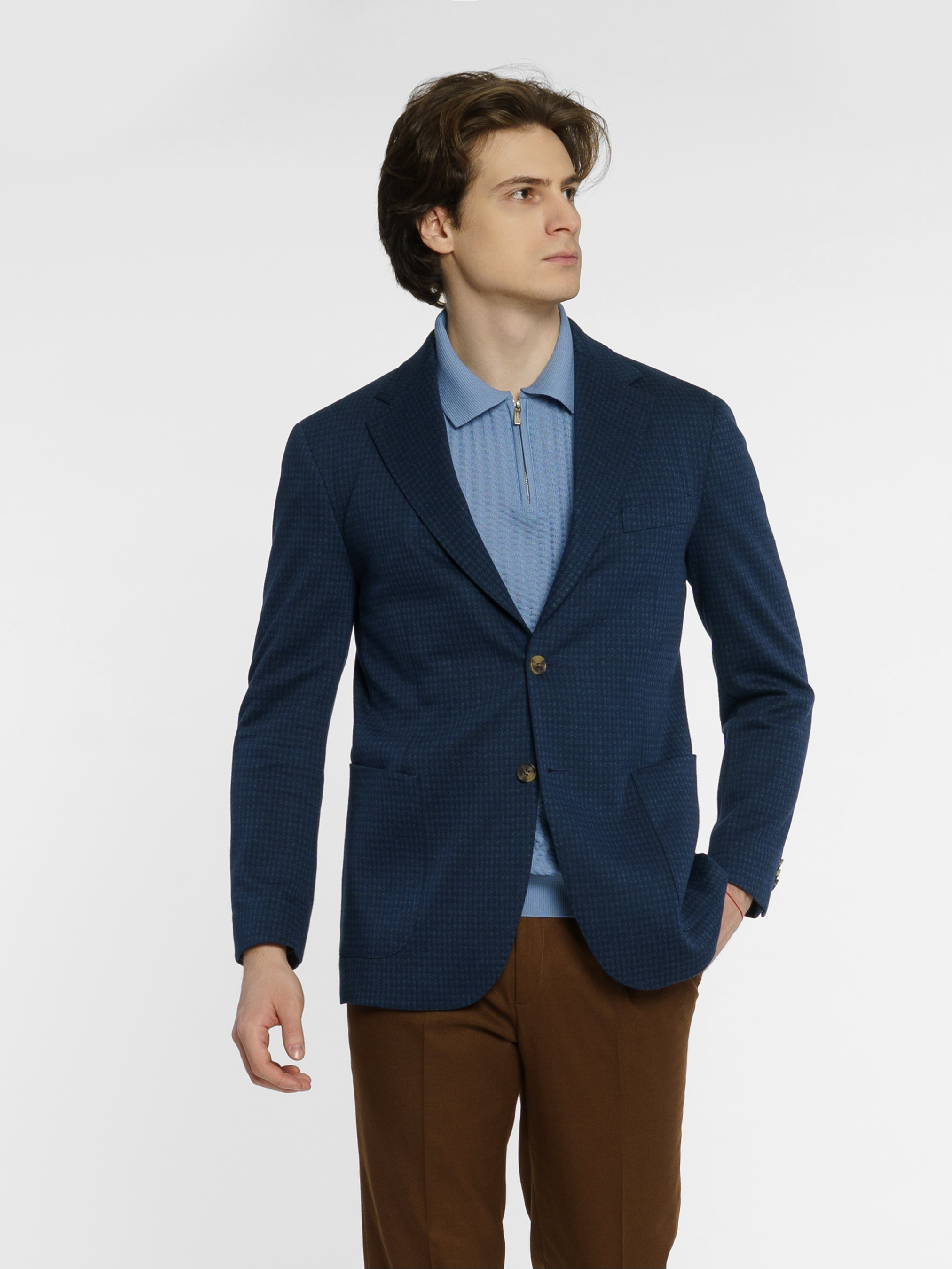 Чоловічий трикотажний піджак Arber синього кольору, створений з еластичної тканини із модним мікродизайном, на основі шовковистої віскози. Піджак максимально комфортний та ідеально сідає на фігурі завдяки м'якій трикотажній тканині. Модель на 2 ґудзики, із прямим лацканом, двома накладними кишенями та двома шліцями, підкладка спинки вкорочена. Піджак чудово поєднується із брюками з бавовни або джинсами, доповнити образ можна тонким трикотажем, сорочкою casual та неформальним взуттям. Можна також доповнити піджак брюками з такої ж тканини M01.22.09.411.