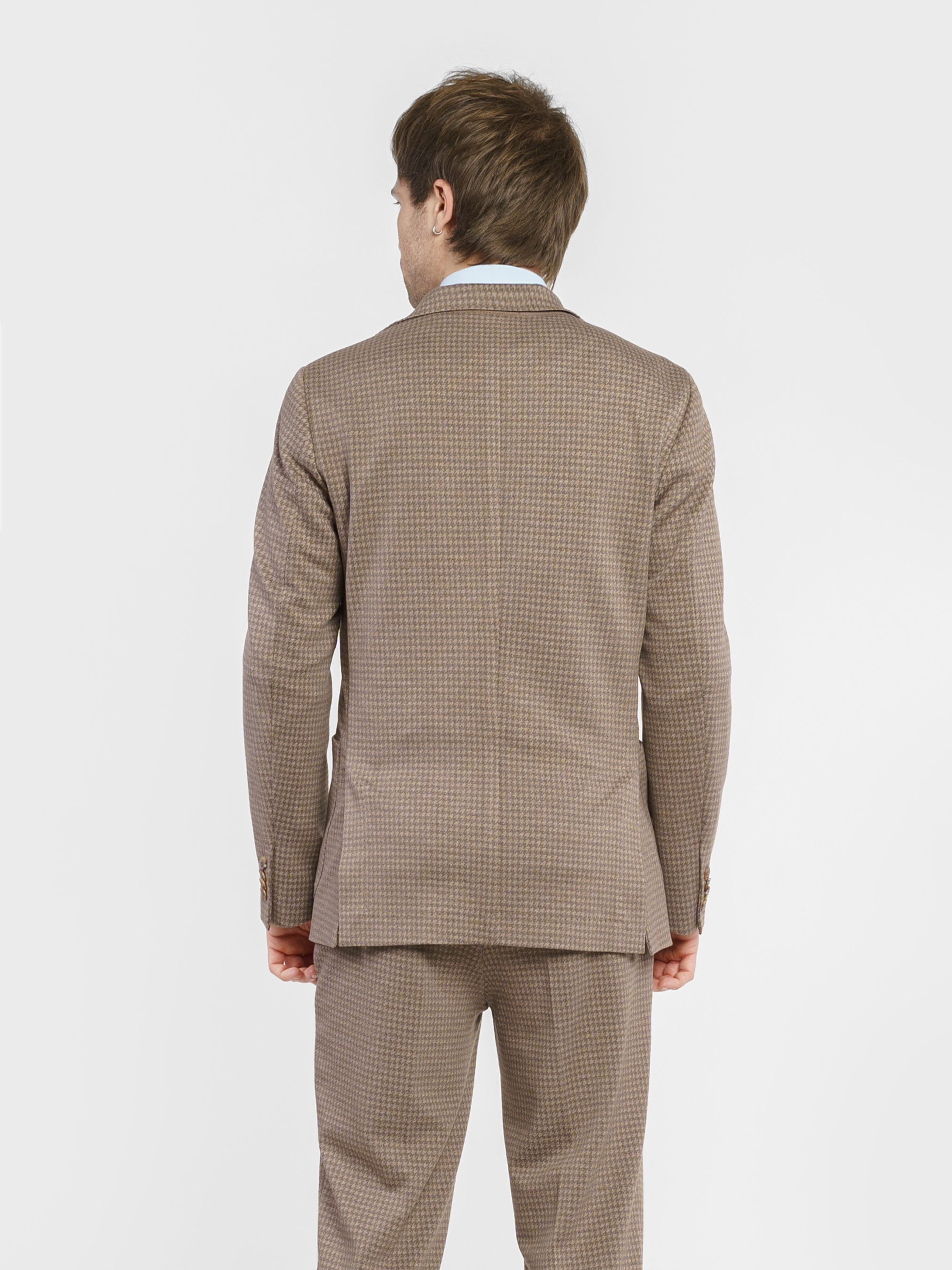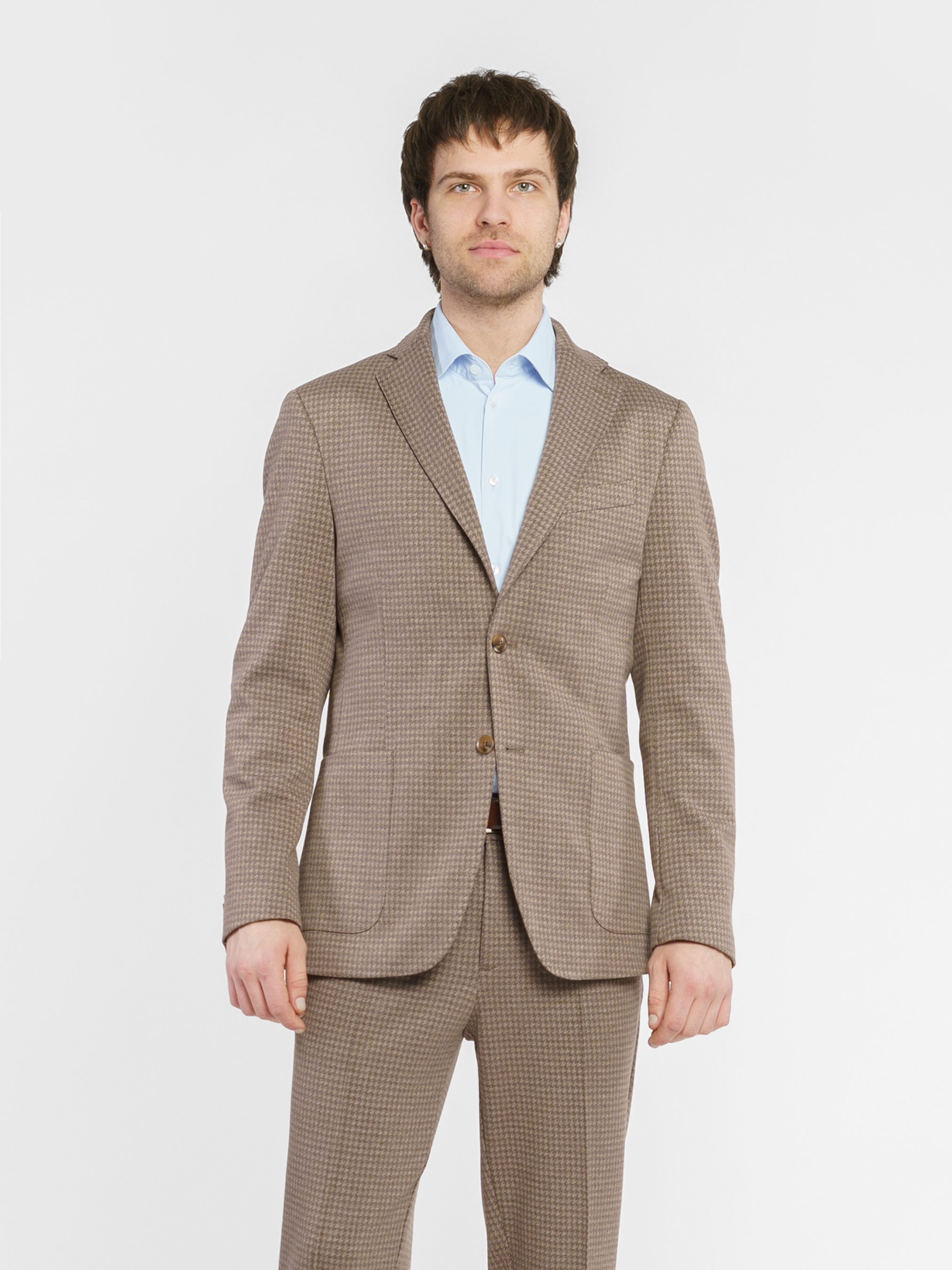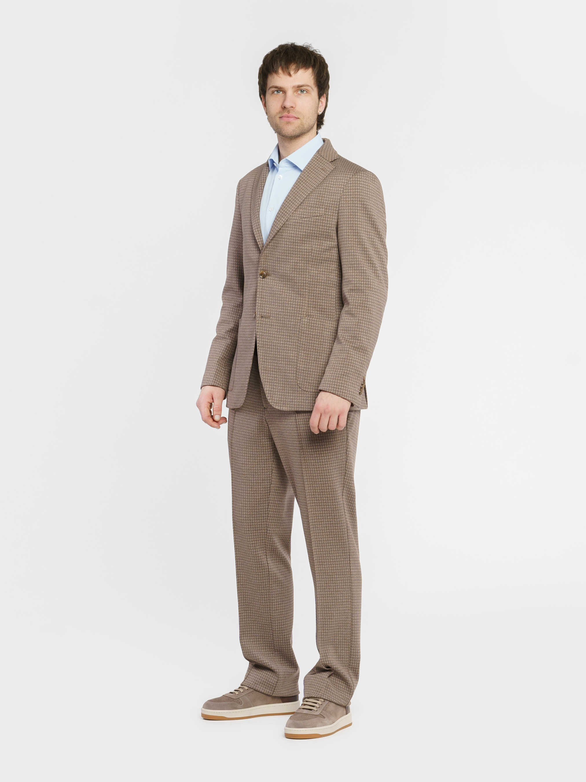 Чоловічий піджак Arber бежевого кольору, виготовлений з інноваційної тканини з додаванням віскози. Інноваційні добавки забезпечують вільну циркуляцію повітря, а тканина практична, не мнеться і стійка до забруднень. Модель із застібкою на 2 ґудзики, з прямими лацканами, напівпідкладкою, двома накладними кишенями та двома шліцами. Вдало поєднується із брюками M01.26.16.512 з тієї ж тканини. Модель на фото у розмірі 48. Зріст: 183 см. Параметри: 94/90/99
