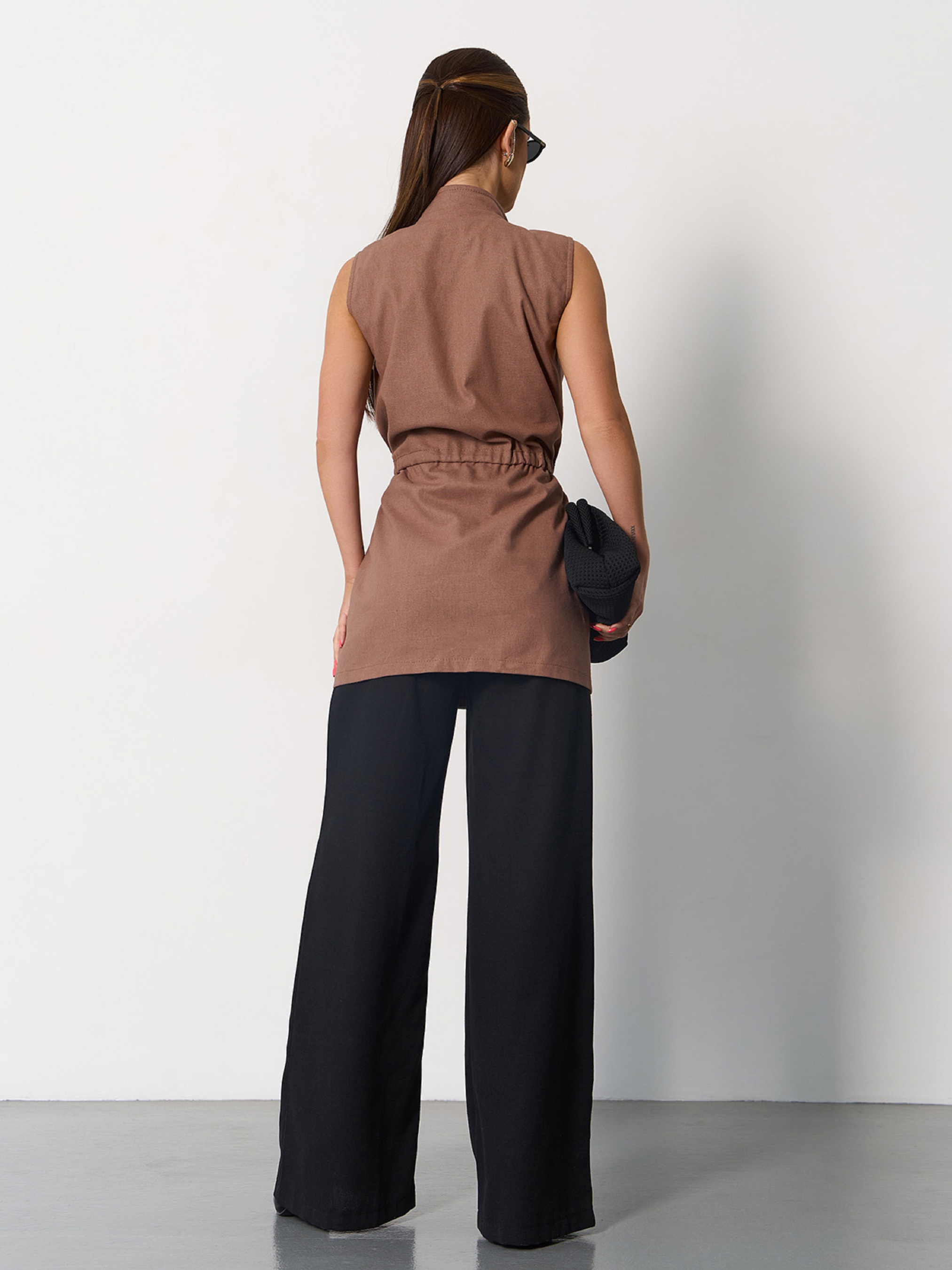 Лляний коричневий жилет без рукавів з куліскою на талії. Виріб на ґудзиках з декоративними клапанами та нагрудними кишенями. Жилетка подовженого крою з коміром-стійкою. Напівобхват: Груди: S (46), M (48), L (50), XL (52), Довжина виробу - 79, Тканина: Низька еластичність.Напівобхват: Груди: S (46), M (48), L (50), XL (52), Довжина виробу - 79, Тканина: Низька еластичність. Склад: 65% льон, 20% бавовна, 15% поліестер