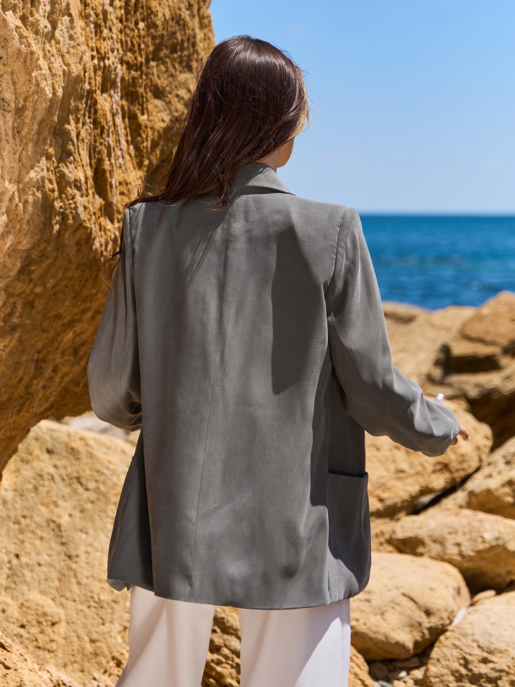 Оливковий піджак без гудзиків, виготовлений з тканини купро з нижнім текстильним підкладом та підплічниками. Піджак з довгими рукавами та подовженим прямим кроєм. Модель із накладними кишенями. Напівобхват: Груди: S(54), M(56), L(58), XL(60), Довжина виробу - 73, Рукав - 60, Тканина: Низька еластичність.