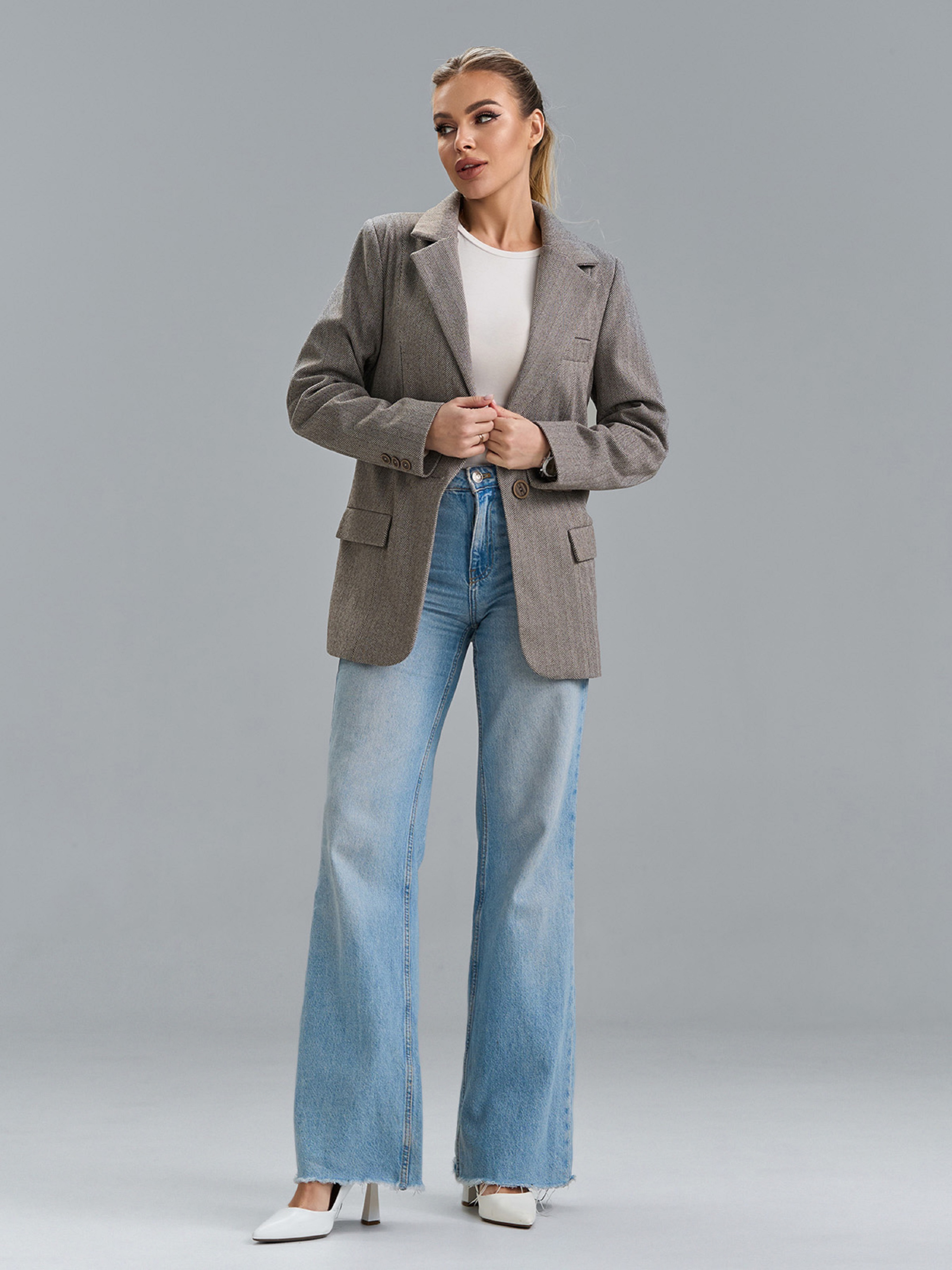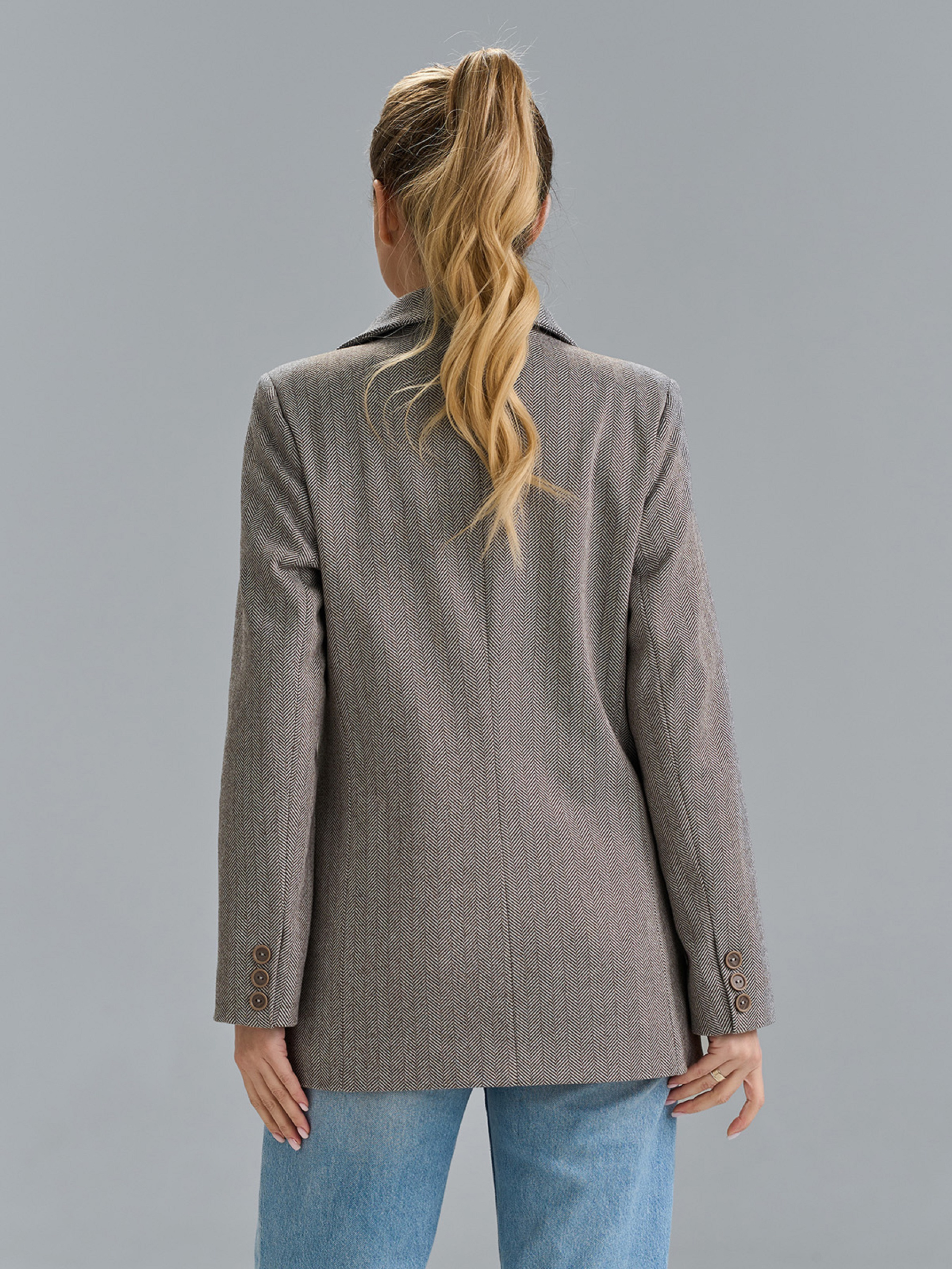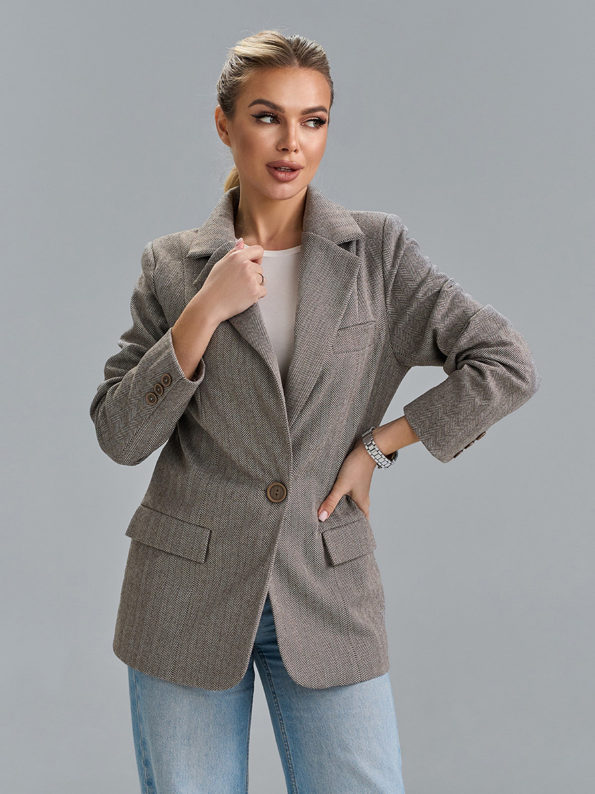 Серый жакет на пуговице с классическим кроем и карманами, выполненный из кашемира в елочку. Модель с английским воротником, длинными рукавами и декоративной листочкой. Пиджак с нижним подкладом и потайными плечиками. Полуобхват: Грудь: S (46), M (48), L (50), XL (52), Длина изделия - 75, Рукав - 61, Ткань: Низкой эластичности.