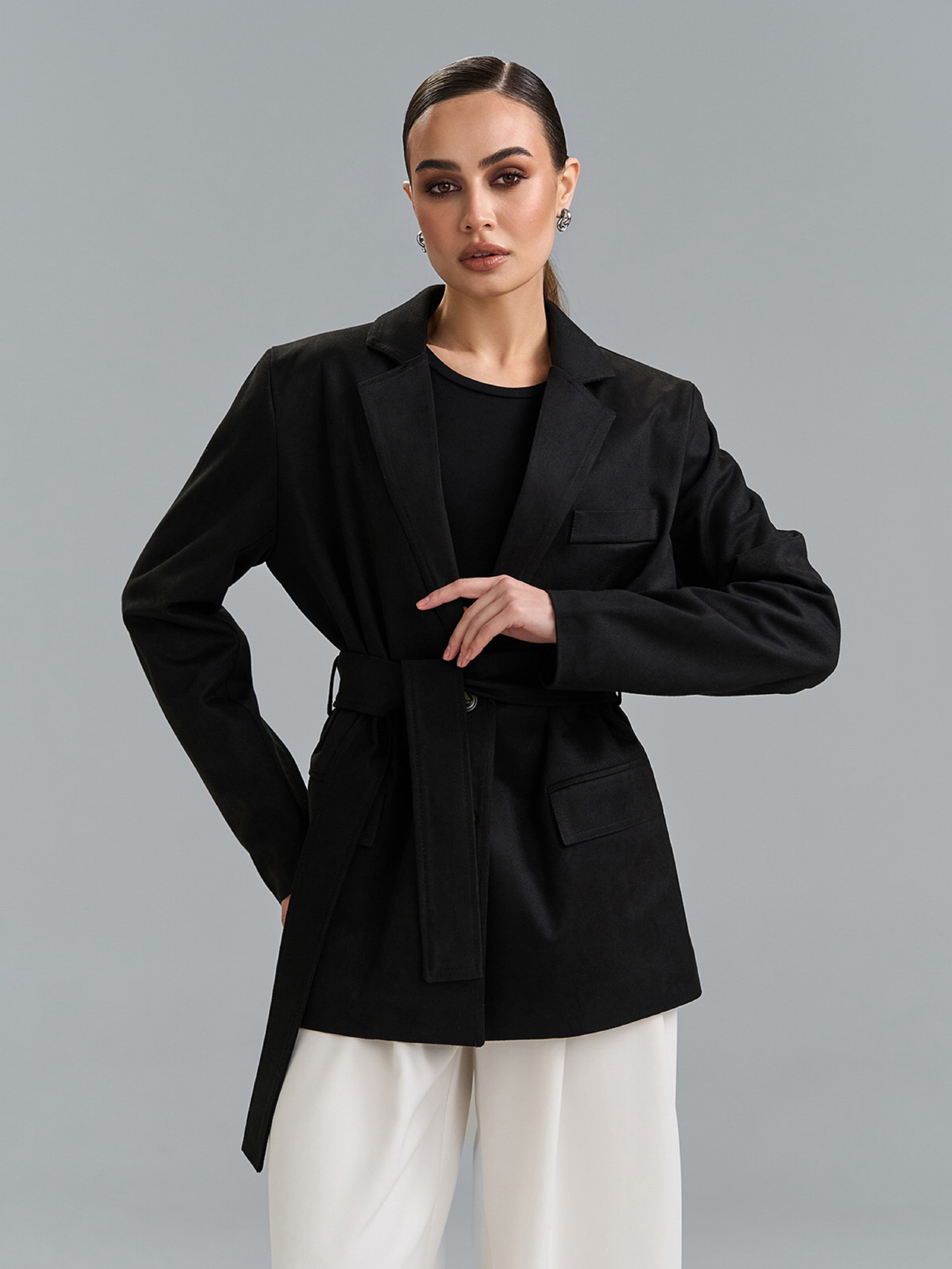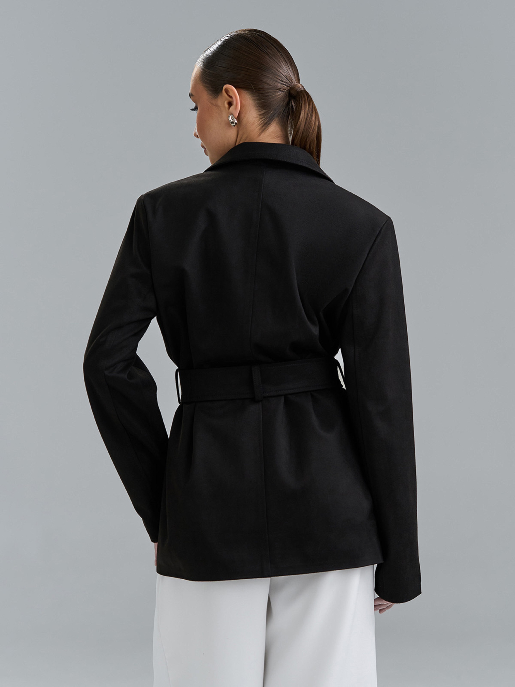 Подовжений жакет із чорної еко-замші з нижнім текстильним підкладом. Жакет на гудзиках з кишенями на клапанах та декоративною листочкою. Жакет комплектується знімним поясом. Напівобхват: Груди: S (53), M (55), L (57), XL (59), Довжина виробу - 75, Рукав - 64,Тканина: Низької еластичності.