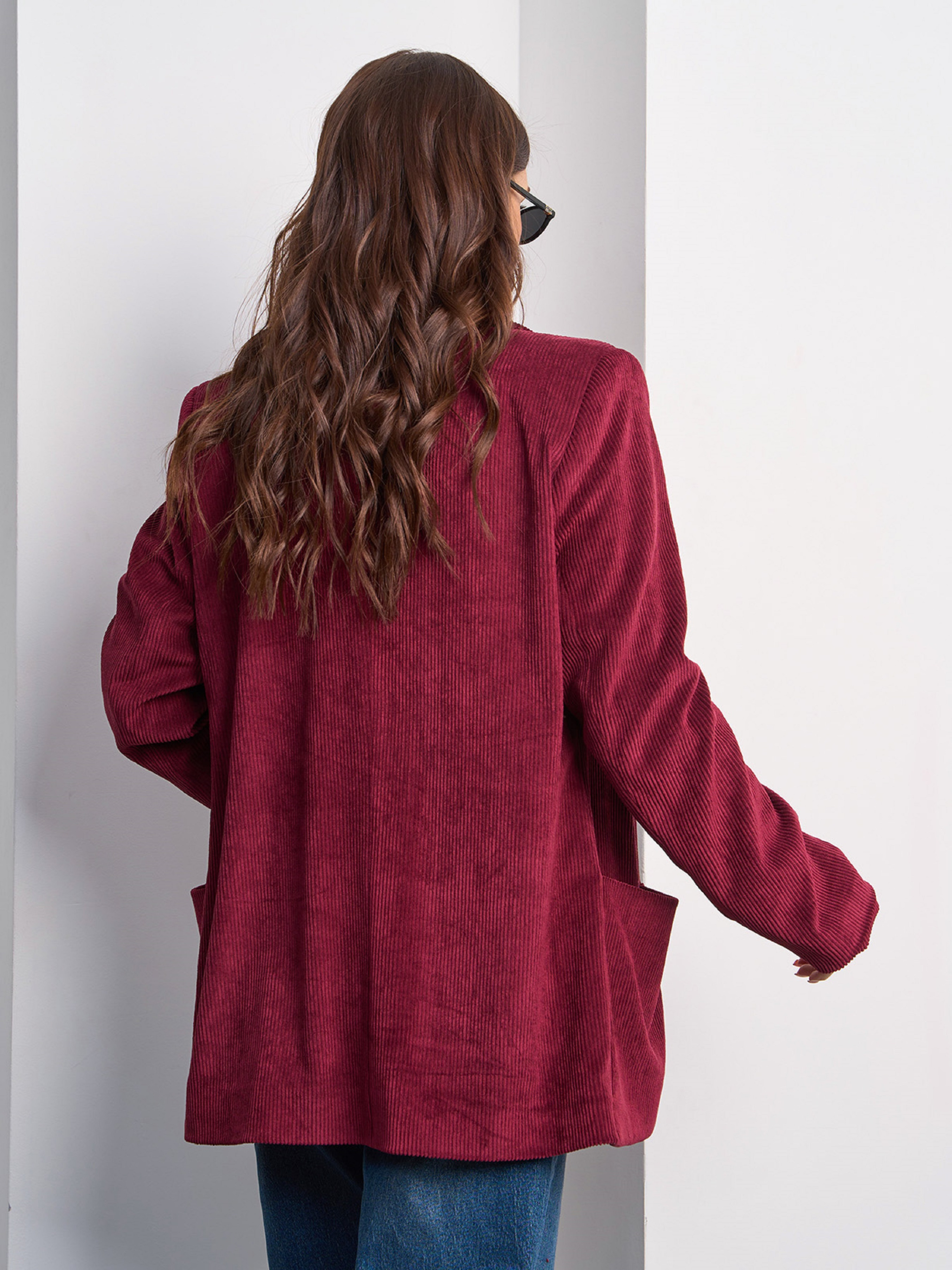 Вельветовий бордовий піджак прямого вільного крою на ґудзиках. Виріб з англійським коміром та довгими прямими рукавами. Піджак з підкладом та накладними кишенями. Виріб із підплічниками для формування силуету. Напівобхват: Груди: S(50), M(52), L(54), XL(56), Довжина виробу - 73, Рукав - 60, Тканина: Низька еластичність.