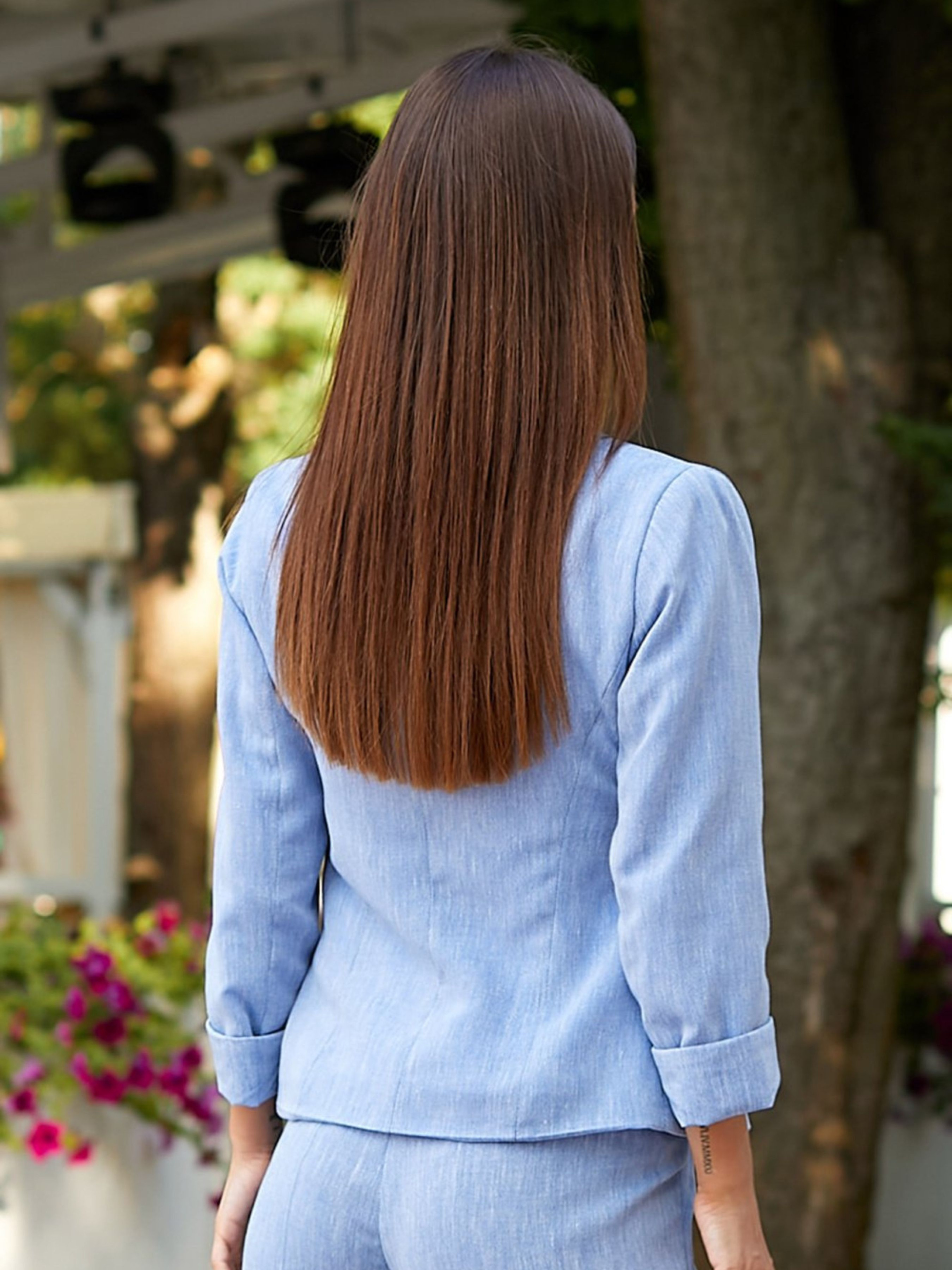 Жіночий піджак — ідеальний вибір для стильних образів Цей короткий лляний жакет блакитного кольору стане елегантним акцентом у вашому гардеробі. Завдяки приталеному силуету він чудово підкреслює фігуру, а англійський відкладний комір із лацканами додає класичного шарму. Жакет застібається на дві ґудзики, має підкладку для комфортного носіння та рукави довжиною три чверті, що виглядають особливо жіночно та сучасно. Довжина виробу — 53 см, ідеально підходить для створення як ділових, так і повсякденних образів. Переваги: натуральний льон, що дарує комфорт і дихає; універсальний блакитний колір, який легко поєднувати; стильний крій, що підкреслює талію; зручний у носінні завдяки підкладці. Такий піджак стане must-have елементом вашого гардеробу: носіть його з брюками, спідницями чи сукнями — і завжди виглядайте бездоганно!