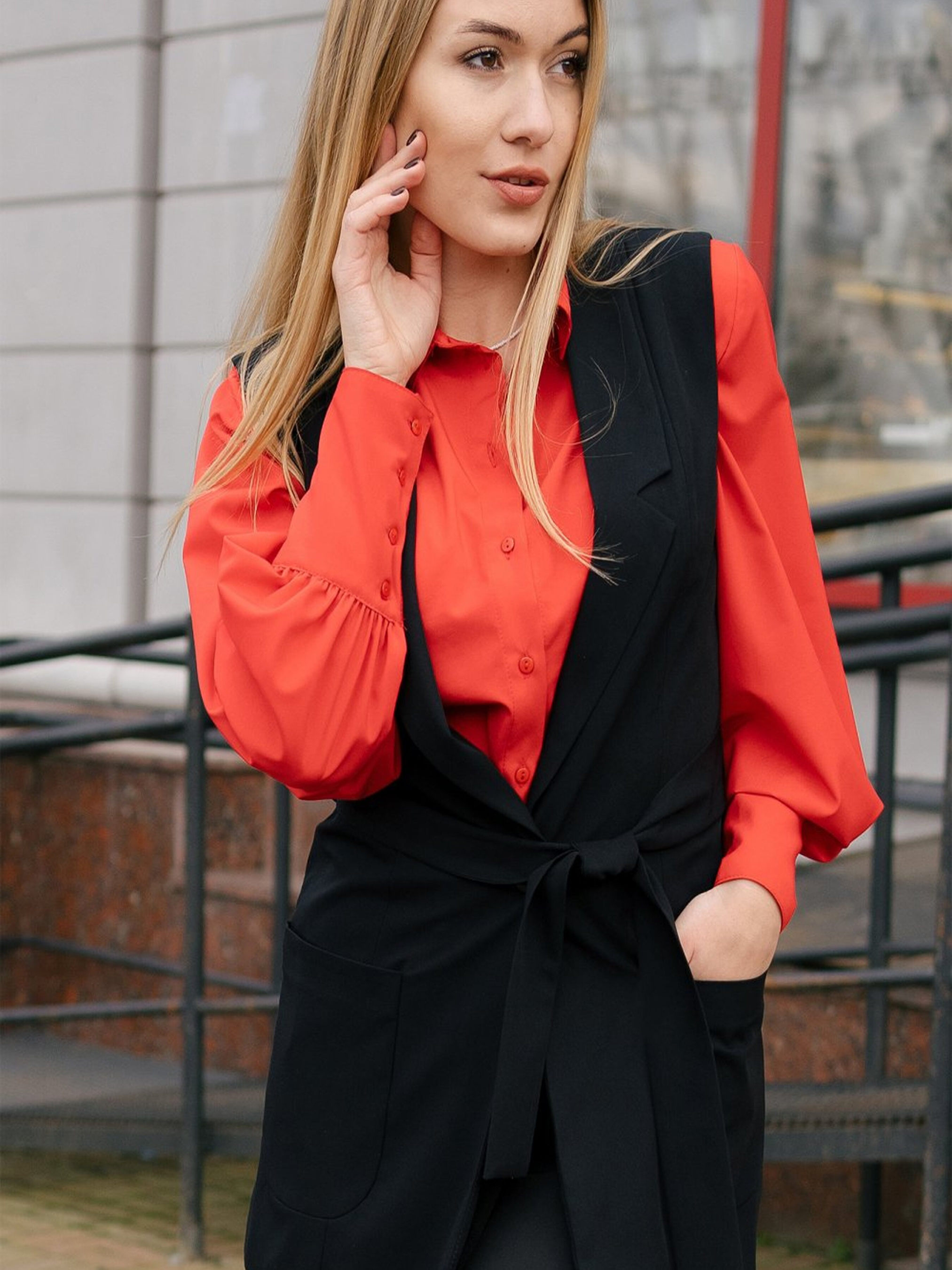Жіночий чорний жилет з кишенями, вузьким кроєм та поясом Цей чорний жилет з кишенями, вузьким кроєм і поясом стане стильним і універсальним доповненням вашого гардеробу. Його елегантний вигляд з підкресленою талією дозволяє створювати різноманітні образи як для офісу, так і для повсякденних виходів. Основні характеристики: Колір: чорний — класичний та універсальний відтінок, що підходить до будь-якого образу. Крій: вузький — додає фігурі витонченості та елегантності. Кишені: зручні і практичні для зберігання дрібниць. Пояс: акцентує увагу на талії, додаючи форму та стиль. Дизайн: мінімалістичний, підходить для комбінування з різними елементами гардеробу. Як носити: Поєднуйте жилет з блузами, сорочками або футболками для створення елегантного чи розслабленого вигляду. Ідеально підходить для офісних луков чи casual стилю з джинсами або спідницями.