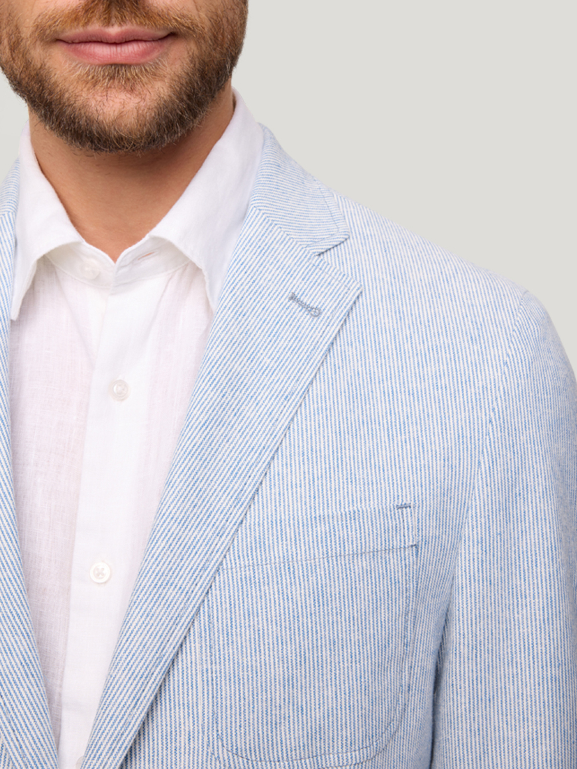 Блакитний літній чоловічий піджак - це легкий, стильний елемент гардеробу, що ідеально підходить для теплої пори року. Він зазвичай виконаний з тканин, що дихають, таких як льон, бавовна або їх суміші, завдяки чому добре пропускає повітря і не перегріває. Колір - світло-блакитний або небесний, що надає образу свіжість, легкість і трохи невимушеної елегантності. Такий піджак чудово поєднується з чиносами, лляними брюками або навіть джинсами, а під нього можна вдягнути просту футболку, сорочку з коротким рукавом або поло.
