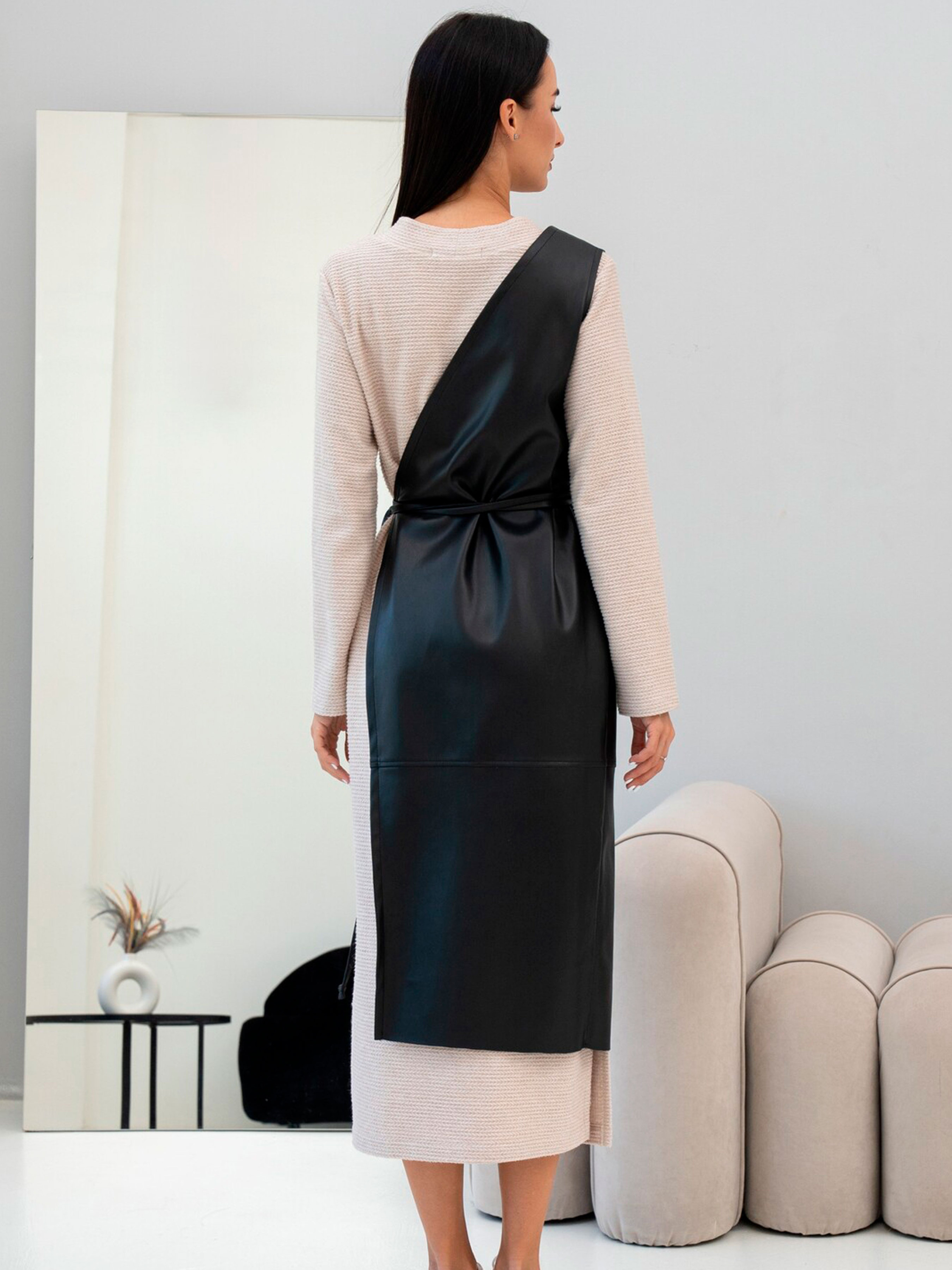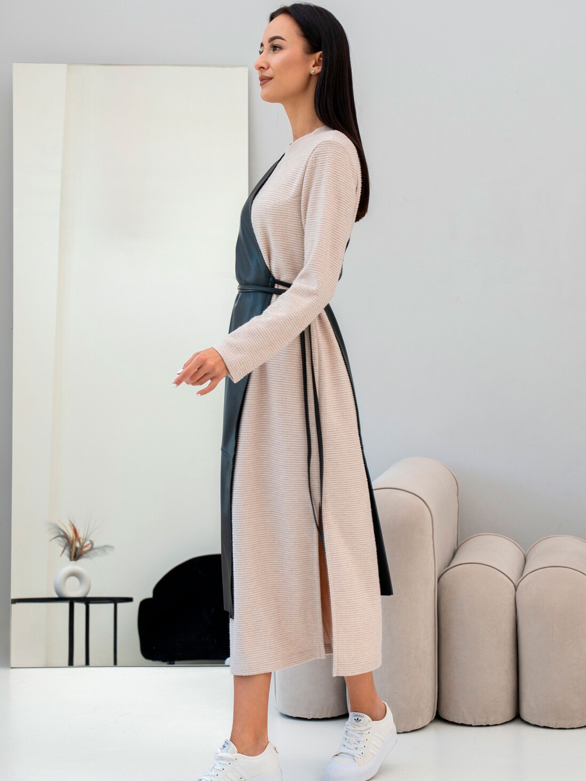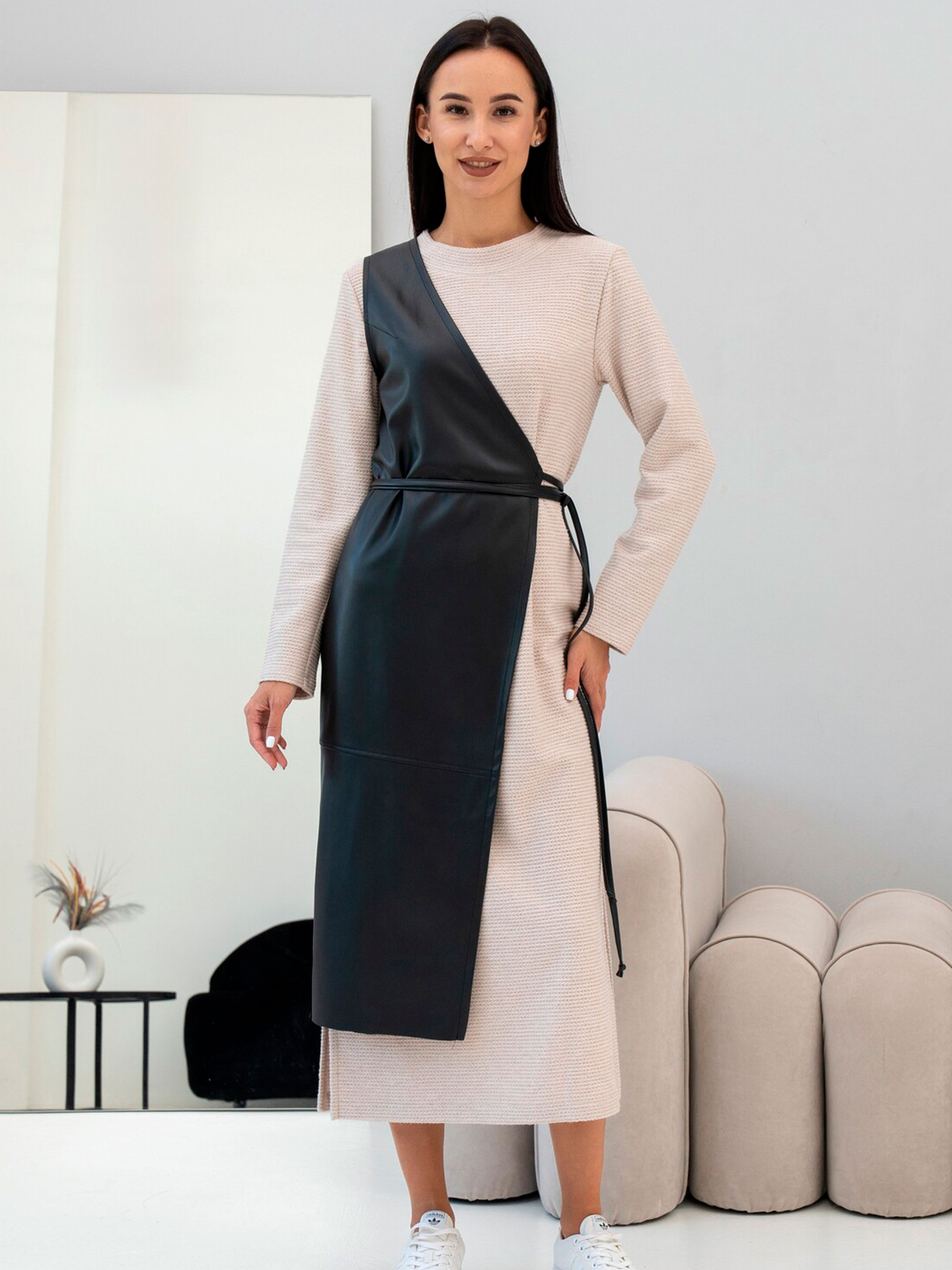Стильний жіночий жилет Іонелла стане ефектним акцентом у вашому гардеробі. Модель виконана з м’якої екошкіри, приємної на дотик і стійкої до зносу. Завдяки асиметричному крою та поясу, що зав’язується, жилет створює виразний, сучасний силует і чудово підкреслює талію. Цей виріб легко поєднується з сорочками, водолазками чи сукнями, створюючи модні багатошарові образи для будь-якої пори року. Характеристики Модель: Іонелла Матеріал: екошкіра Склад тканини: 56% поліестер, 34% віскоза, 10% бавовна Силует: приталений Крій: асиметричний Довжина: міді Застібка: пояс на зав’язках Сезон: весна / осінь / демісезон Виробник: Україна Переваги Асиметричний дизайн створює сучасний акцент Пояс допомагає підкреслити фігуру Екошкіра — м’який, етичний матеріал з ефектом натуральної шкіри Підходить для офісних, повсякденних і стильних вечірніх образів Як носити Жилет Іонелла чудово поєднується з класичною білою сорочкою або гольфом, а також зі штанами, спідницями чи сукнями. Для більш сміливого луку додайте високі чоботи або черевики на підборах. Догляд Протирати вологою м’якою тканиною. Не прасувати. Не прати у машинці. Зберігати на тремпелі, уникаючи перегинів.