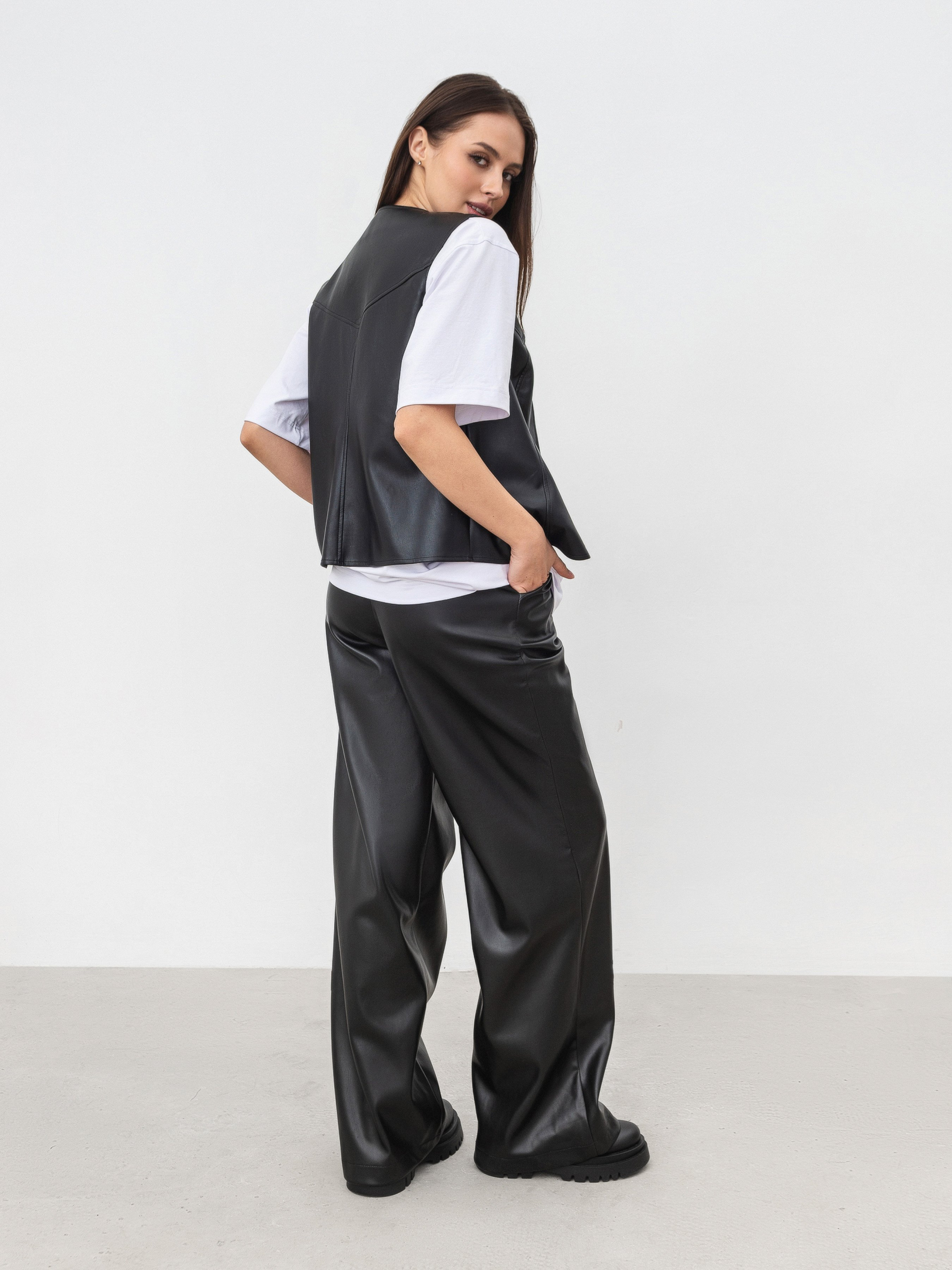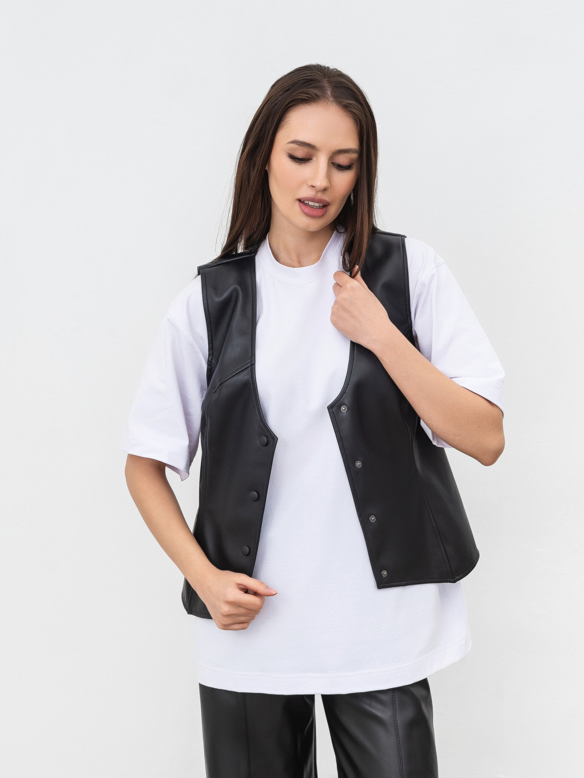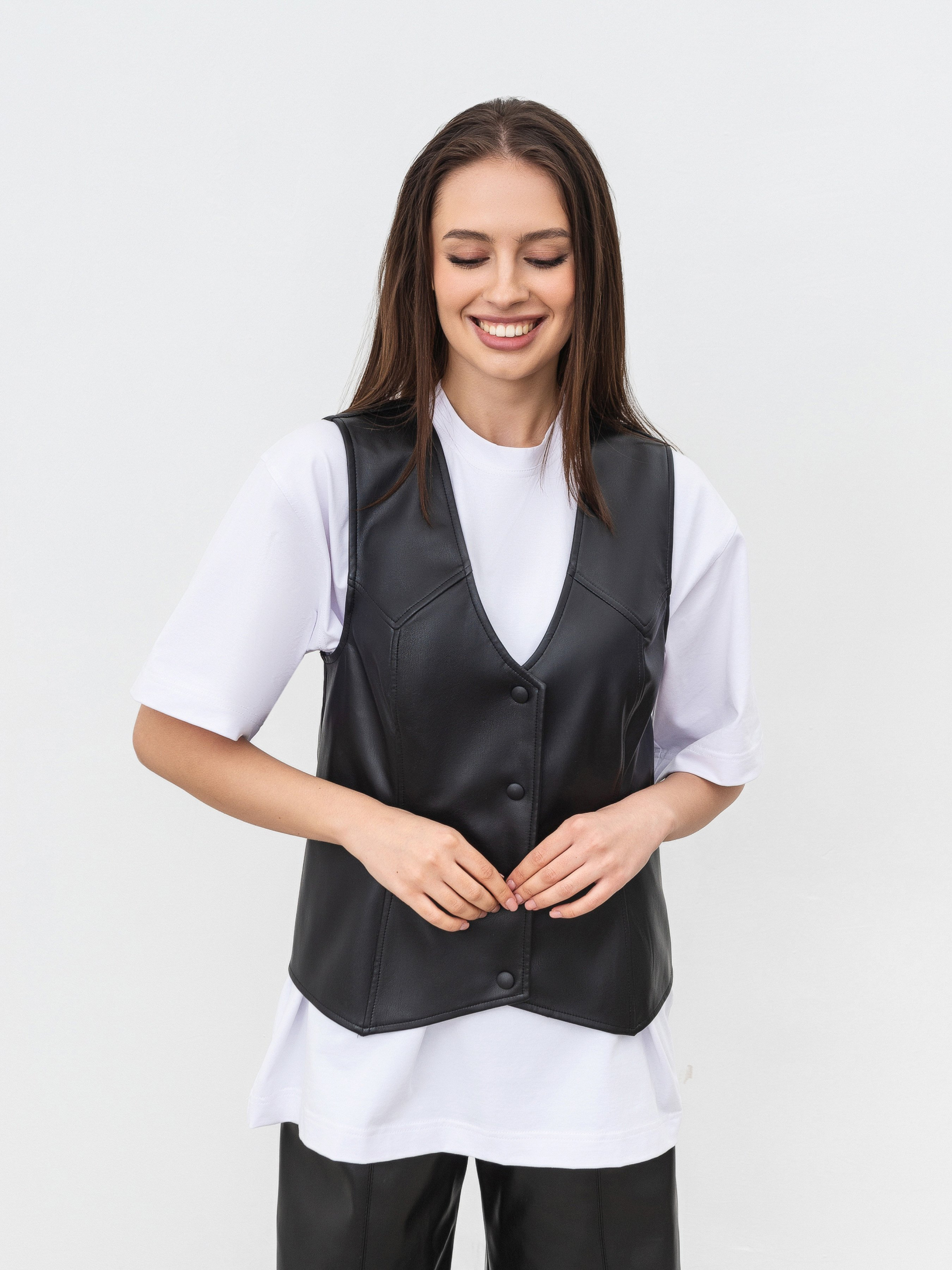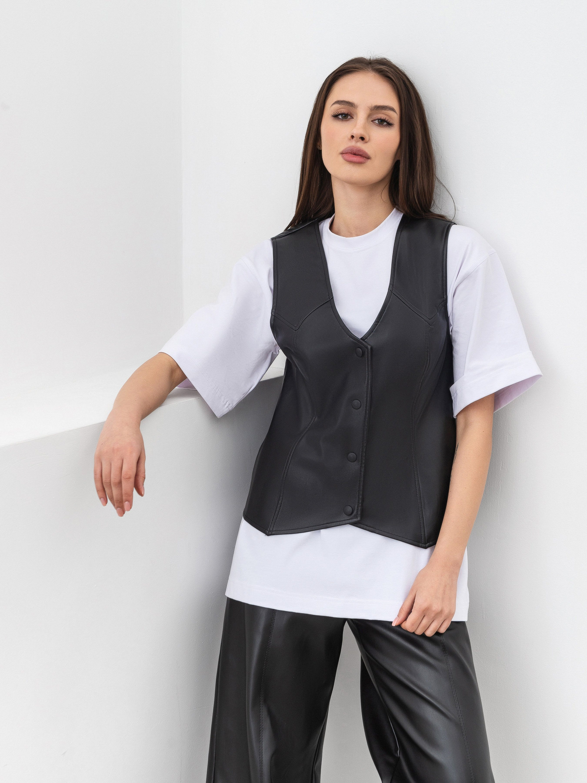 Подовжений жилет зі шкіри. Цупкий і в одночас м який матеріал замінник шкіри, всередині на м якій замші. Застібуєтся на кнопки. Жилет більше прямого фасону, це дає змогу втілювати багатошарові образи, де жилет буде слугувати другим шаром, вдягаючи поверх футболки чи лонгу. Для більшого вільного фасону рекомендуємо брати на розмір більше. Дивись до комплекту шкіряні брюки Нерн чи шкіряну спідницю Манта