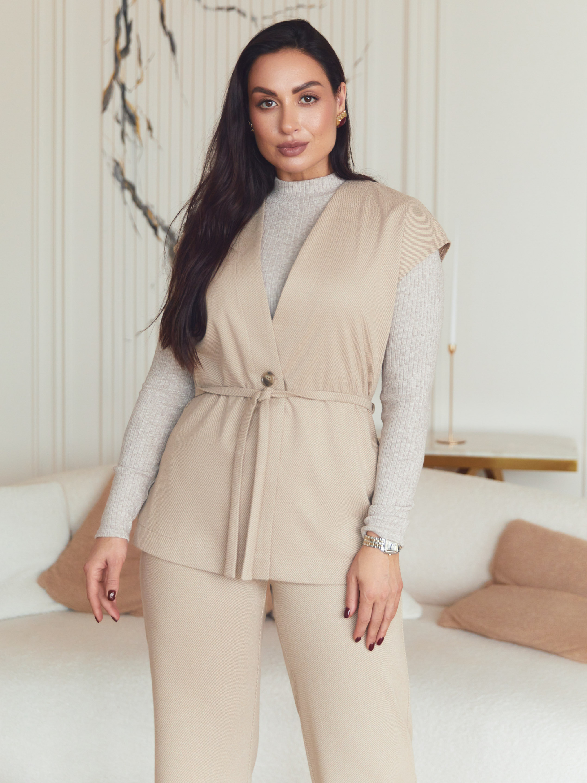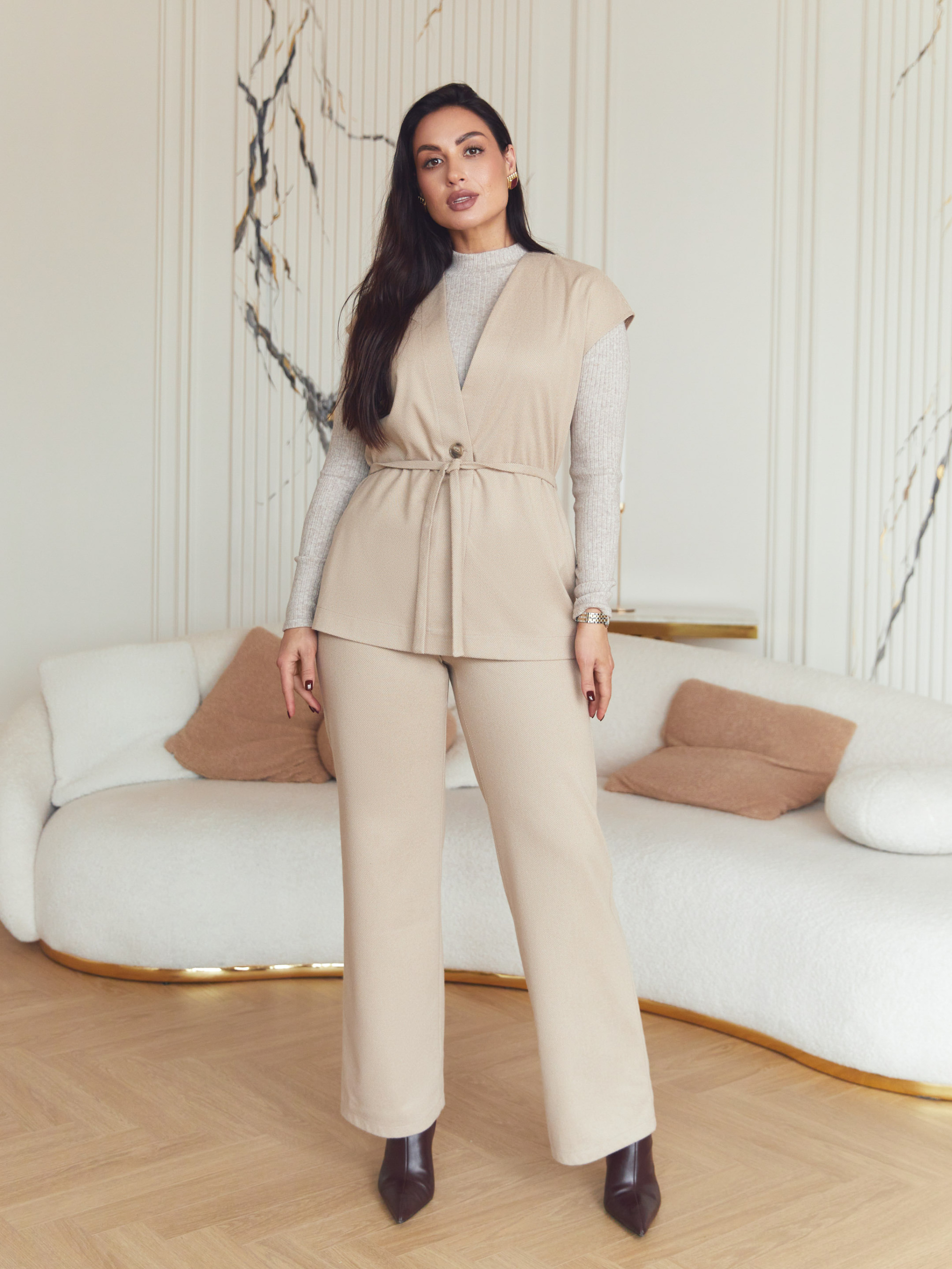 Жилет Seventeen 2344. | Winter 25 part 2 Цей жилет — практичне рішення для міжсезонного гардероба, коли важливі тепло, універсальність і акуратний зовнішній вигляд. Модель легко інтегрується у повсякденні та ділові образи, підсилюючи їх без перевантаження деталями. Фасон і посадка Прямий, вільний крій не сковує рухів і підходить для різних типів фігури. Приспущене плече формує м’яку лінію верху та забезпечує комфортну посадку поверх сорочок, гольфів чи суконь. Пояс у комплекті дозволяє регулювати силует — носити жилет вільно або з акцентом на талії. Матеріал і комфорт Виконаний з кашеміру, жилет приємний до тіла, добре утримує тепло та залишається легким. Матеріал підходить для осінньо-весняного сезону, зберігає форму й охайний вигляд навіть при активному щоденному носінні. Функціональні деталі Застібка на ґудзик забезпечує зручність у використанні та підтримує лаконічний дизайн. Мінімалістичні декоративні елементи роблять модель універсальною — вона легко поєднується як з класичними, так і з кежуал-образами. універсальний фасон для різних стилів комфортна посадка без обмеження рухів можливість змінювати силует за допомогою пояса теплий, м’який матеріал для міжсезоння готовий завершений образ завдяки комплектації Довжина виробу S–M: довжина виробу — 68 см L–XL: довжина виробу — 70 см 2XL–3XL: довжина виробу — 71 см Догляд Рекомендовано ручне прання до 30° для збереження властивостей тканини та форми виробу. Розмірна сітка S–M: обхват грудей 84–88 см, талії 68–72 см, стегон 92–96 см L–XL: обхват грудей 92–96 см, талії 76–81 см, стегон 100–105 см 2XL–3XL: обхват грудей 100–105 см, талії 86–91 см, стегон 110–115 см