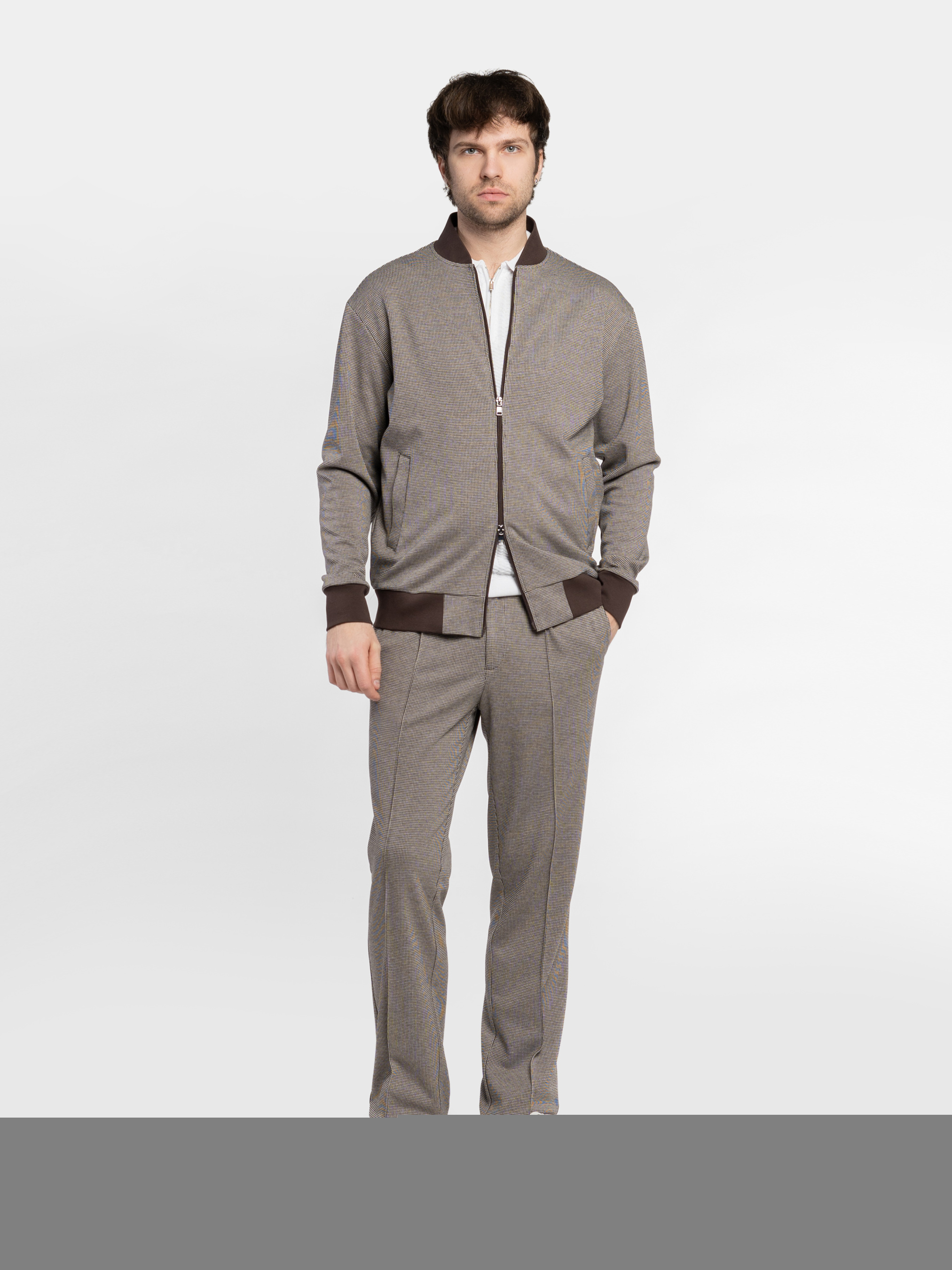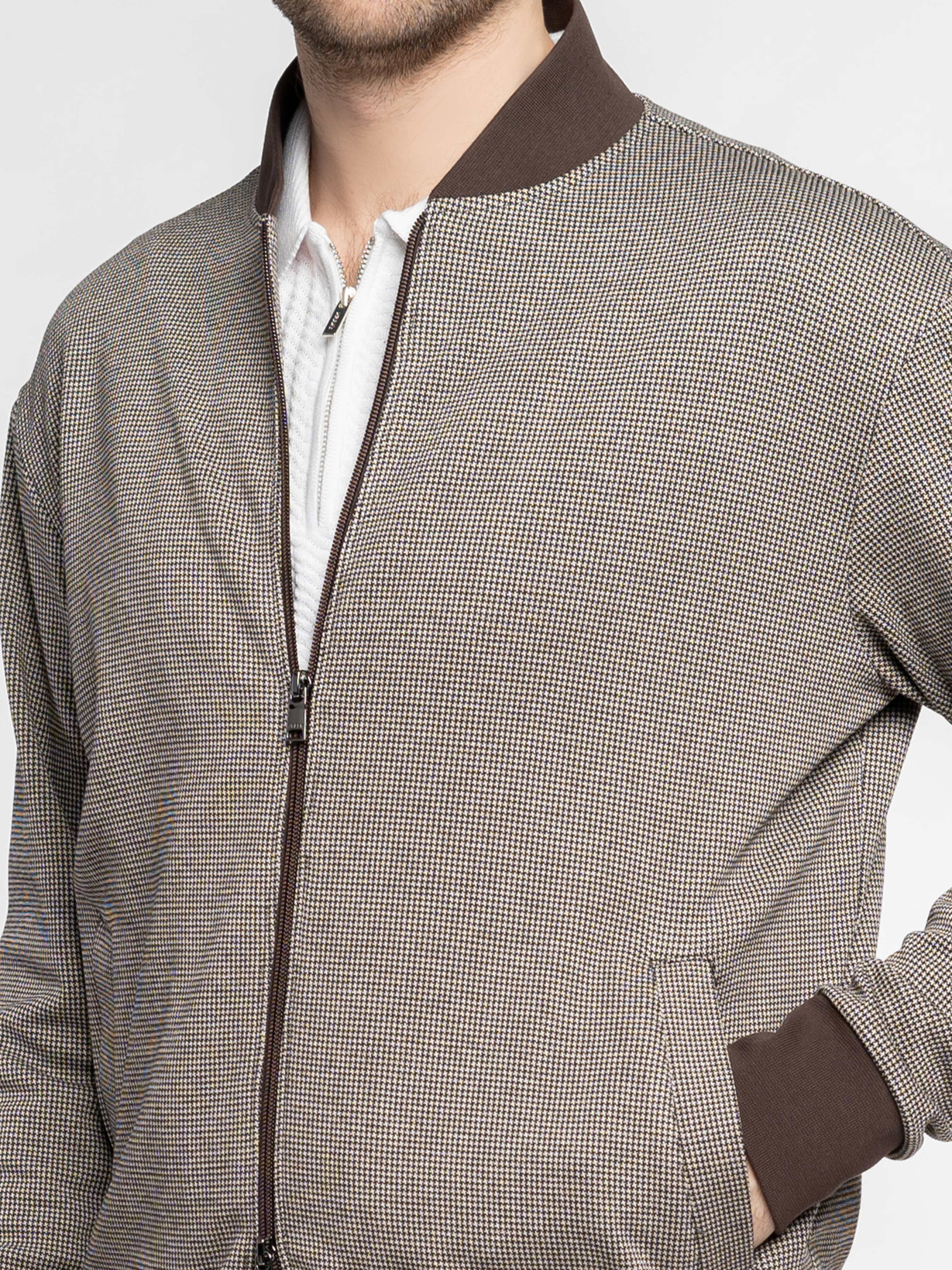 Чоловічий бежевий бомбер Arber з еластичного трикотажу на основі бавовни та віскози. М’яка, приємна на дотик тканина дихає, не мнеться, стійка до забруднень і забезпечує свободу рухів. Застібка на блискавку, дві кишені та еластичні вставки на манжетах, комірі й понизу додають комфорту й динаміки образу. Ідеально поєднується з брюками M01.07.16.611 з тієї ж тканини або джинсами для невимушеного повсякденного образу. Модель на фото у розмірі 48. Зріст: 183 см. Параметри: 94/90/100