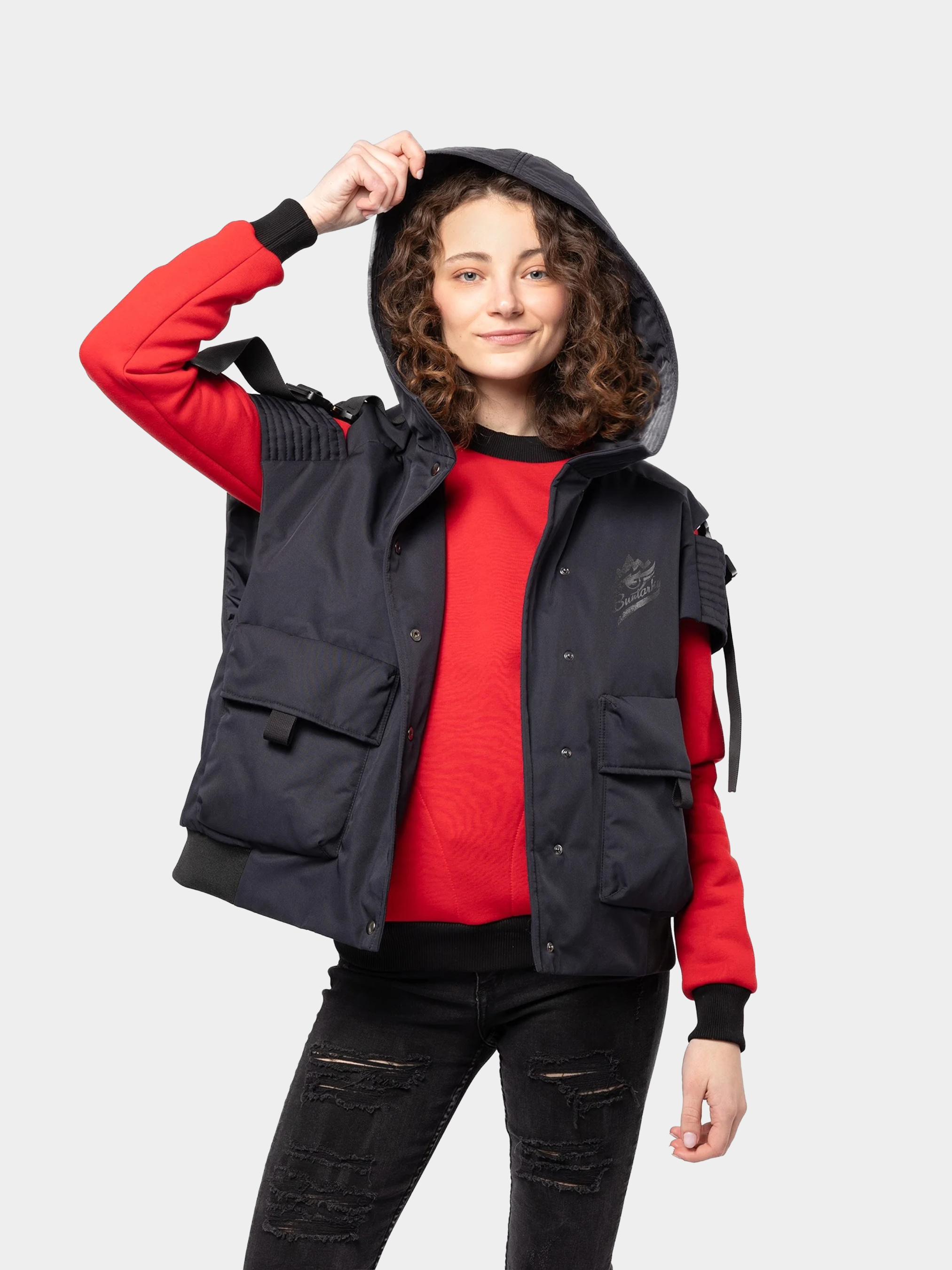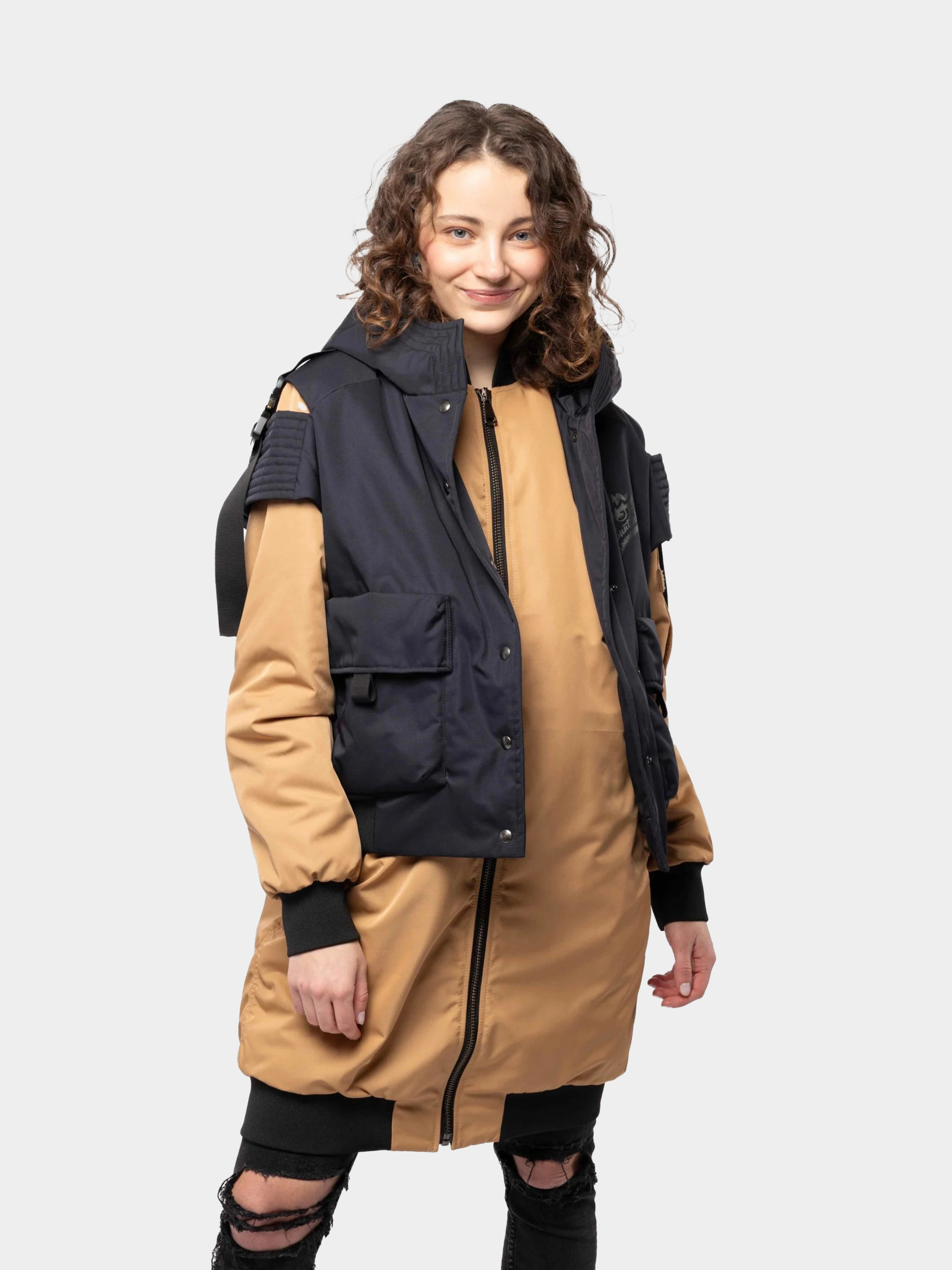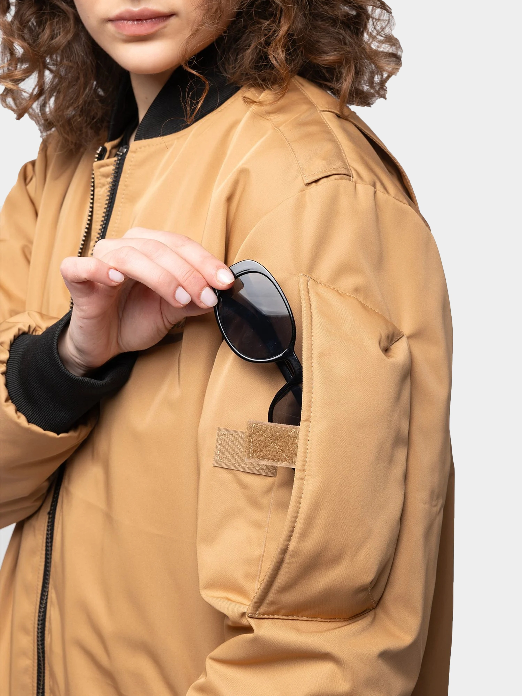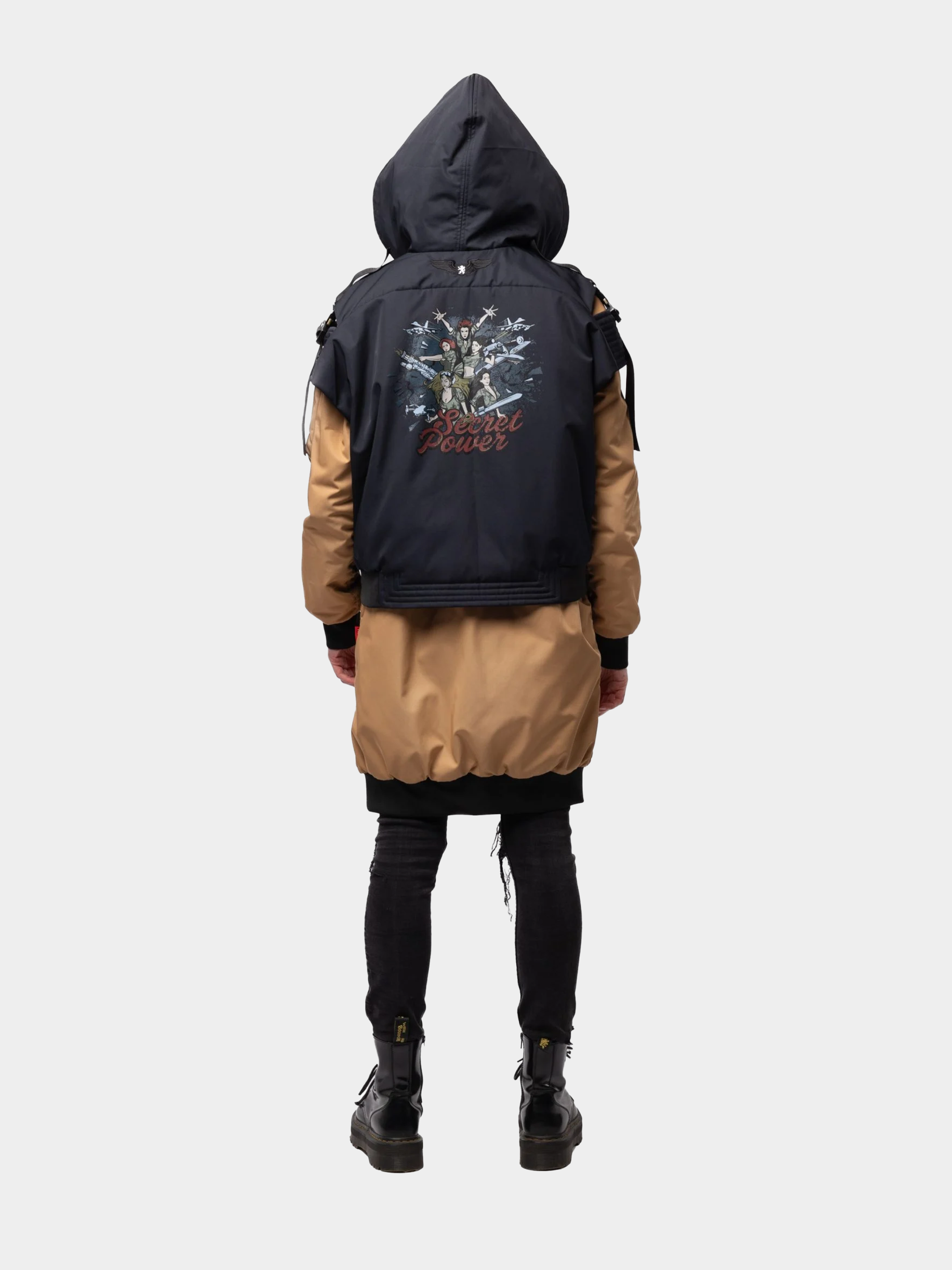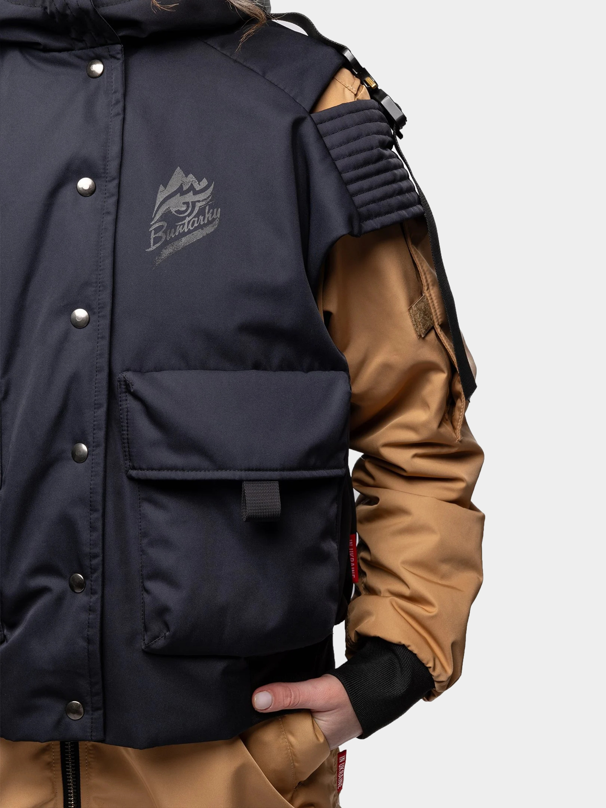 З таким набором можна вмить стати бунтаркою в квадраті, бо обидві речі як окремо, так і разом, говорять самі за себе. Камізелька та бомбер мають спеціальні кнопки, якими можуть скріплюватися докупи: а то є вже три (!) готові бунтарські образи. Наш новий подовжений жіночий бомбер має фіксуючі резинки на комірі, рукавах і внизу. На рукаві — кишенька для окулярів, і ще дві дуже місткі кишені спереду. На спині — принтований напис Secret power і наше лого з крилами. А наша камізелька — то вже чистий бунт навіть у крою! Має фастекси з чистої латуні, об’ємні кишені, та оригінальні вирізи на плечах. На спині — принт з командою озброєних бунтарок у пікселі.