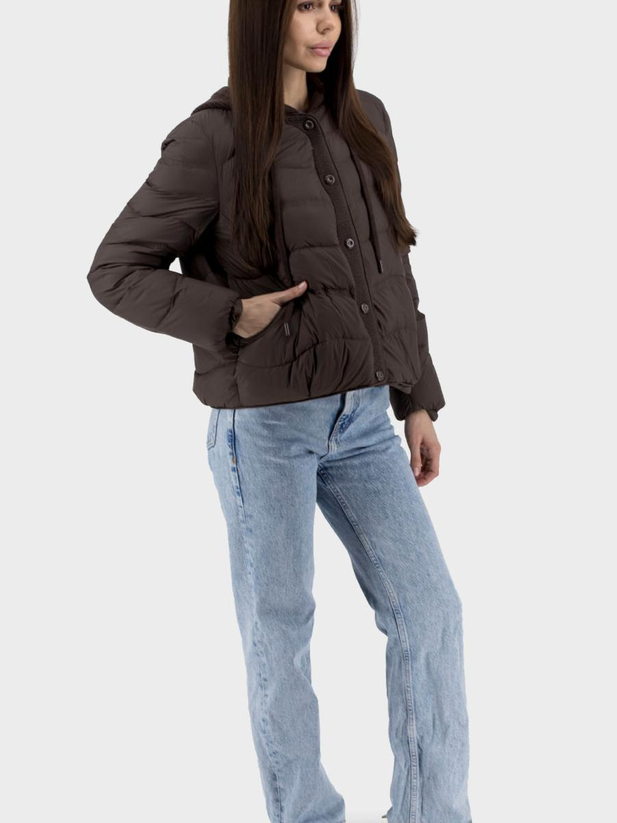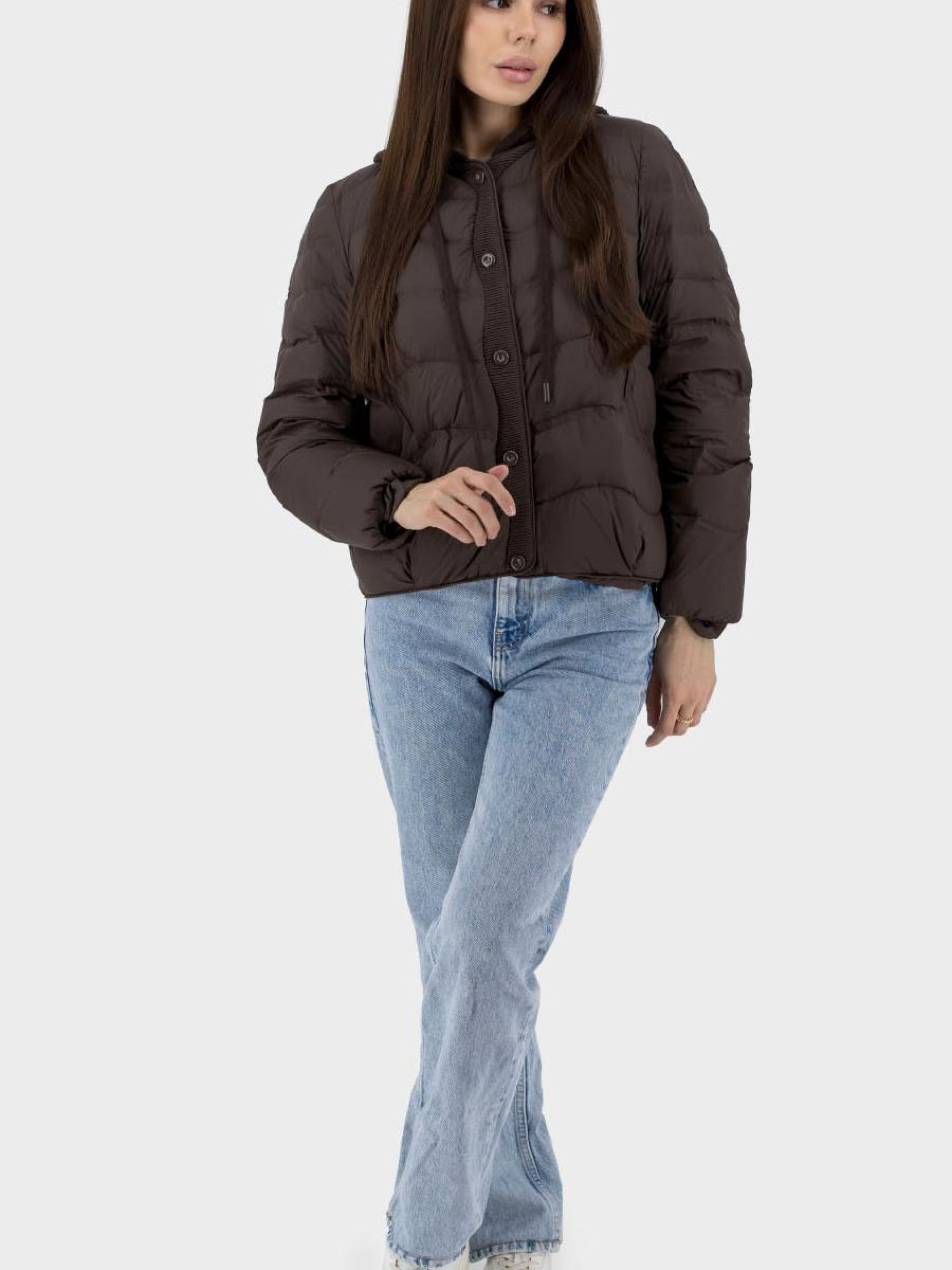 Цей жіночий пуховик — ідеальне рішення для стильного захисту від прохолодної погоди восени та весною. Модель виконана в casual стилі, забезпечуючи комфорт та елегантність завдяки своєму однотонному дизайну. Втачний довгий рукав та прямий силует додають вишуканості, а трикотажне оздоблення підкреслює естетику. Пуховик оснащений втачними кишенями для практичності, а також незнімним капюшоном для додаткового захисту від вітру. Основний матеріал виробу — комбінована стьобана тканина з потовщеною підкладкою з поліестеру, утеплена качиним пухом та пером, забезпечуючи оптимальну теплоізоляцію при мінімальній товщині. Застібка на кнопках додає зручності та стильного акценту.