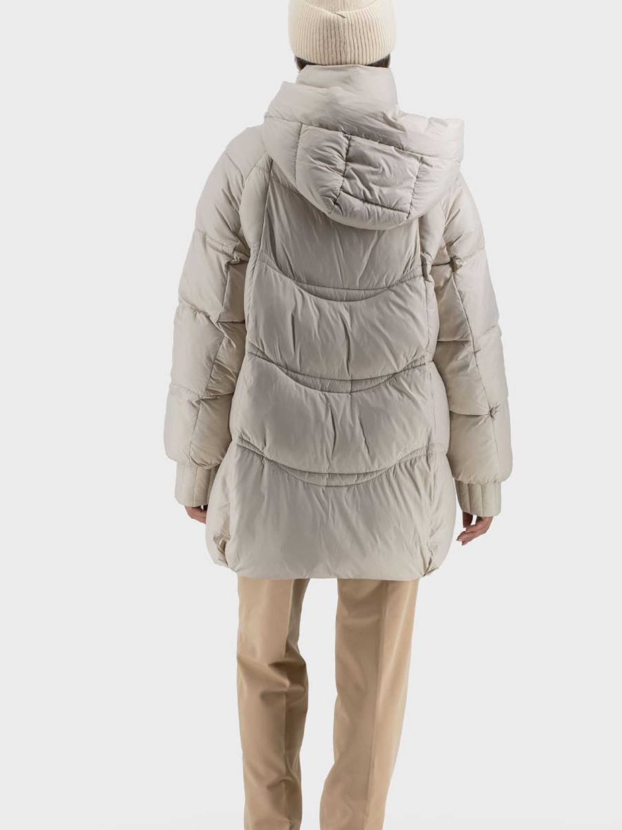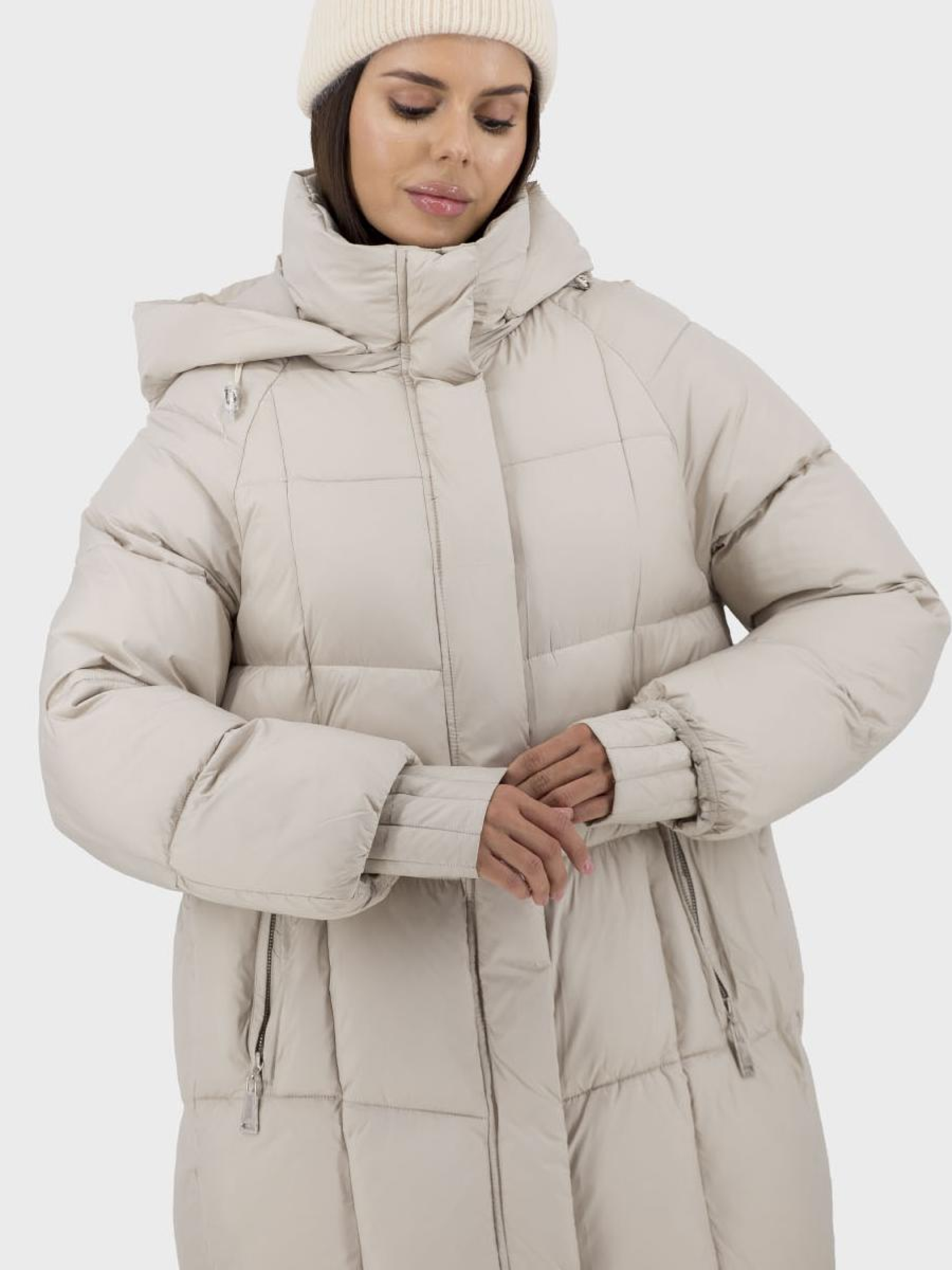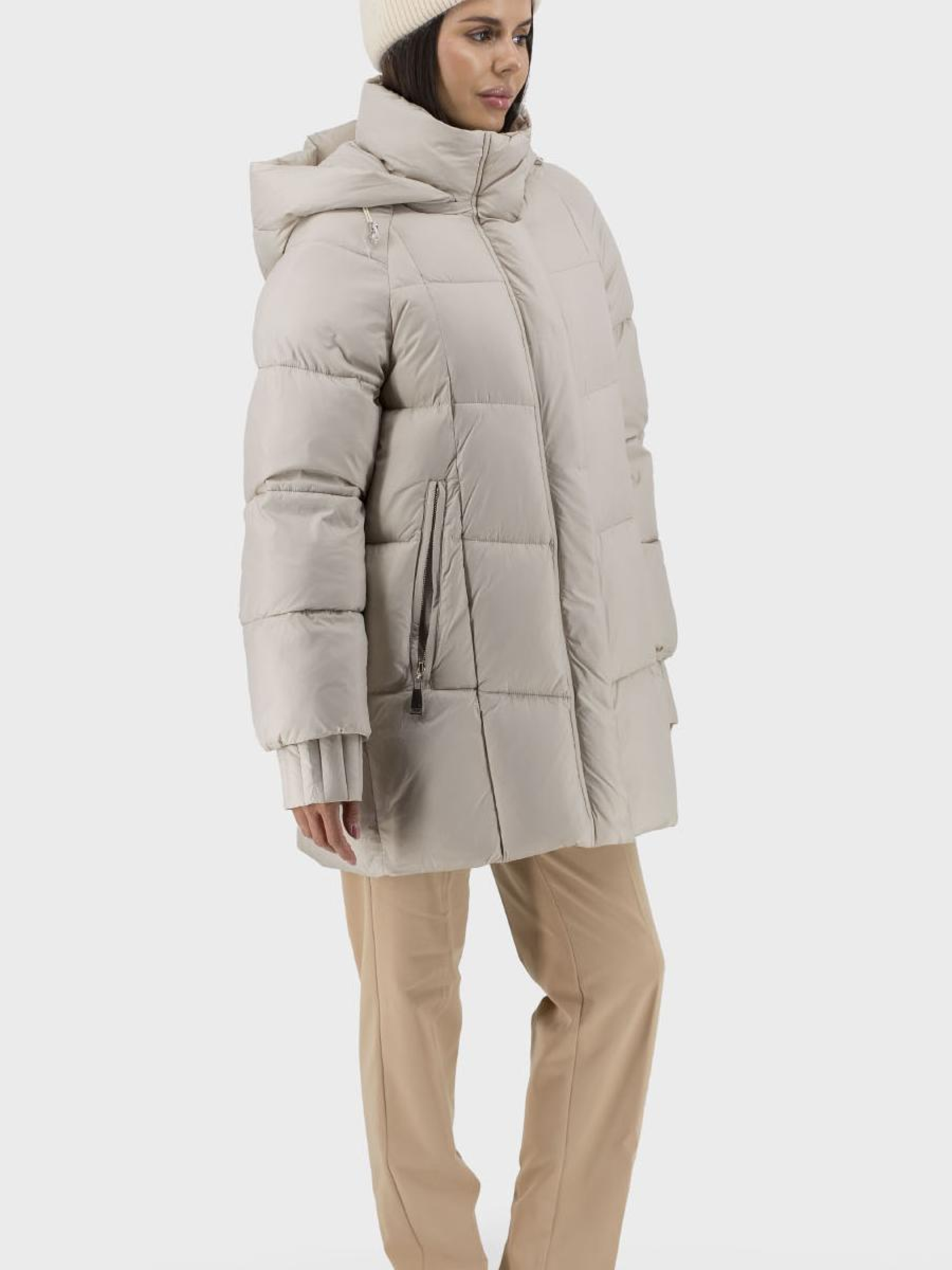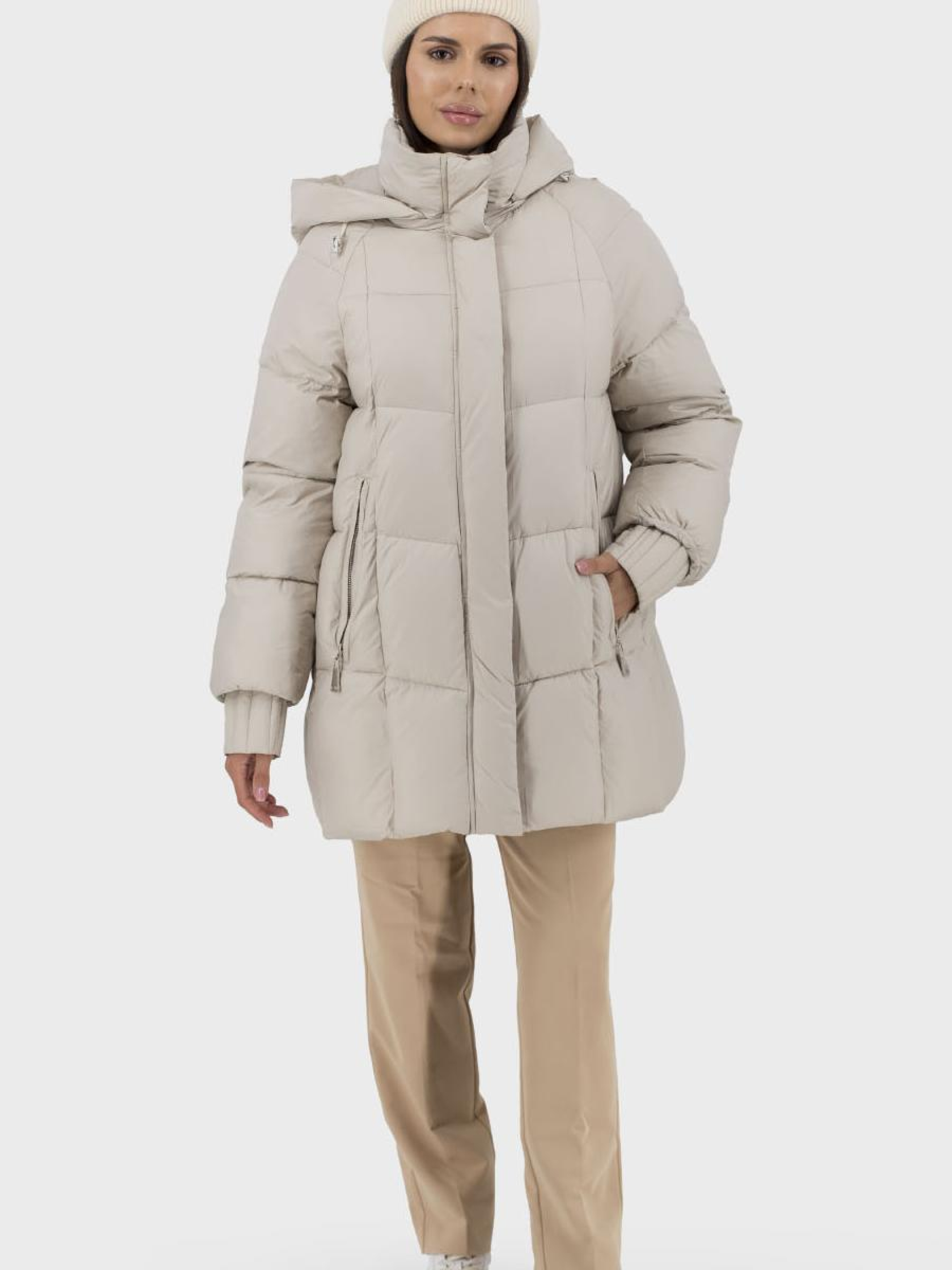 Пуховик ідеально підходить для стильних жінок, які шукають комфорт та захист у холодну зимову пору. Цей casual пуховик виготовлений із високоякісного поліестеру з утеплювачем з біопуху, що гарантує відмінне збереження тепла без додаткового обтяження. Модель без хутра пропонує елегантний однотонний дизайн, доступний у молочному та чорному кольорах, що легко поєднуються з будь-яким гардеробом. Практичний капюшон зі стійкою збереже вас від вітру та холоду, а знімний дизайн додає варіативності. Довгий реглановий рукав із манжетами надає додаткової зручності та свободи руху. Зручні втачні кишені на блискавці забезпечують збереження ваших речей. Стьобаний силует та застібки на блискавці і кнопках додають практичності та стилю, роблячи цей пуховик ідеальним вибором для зимових подорожей у місті.