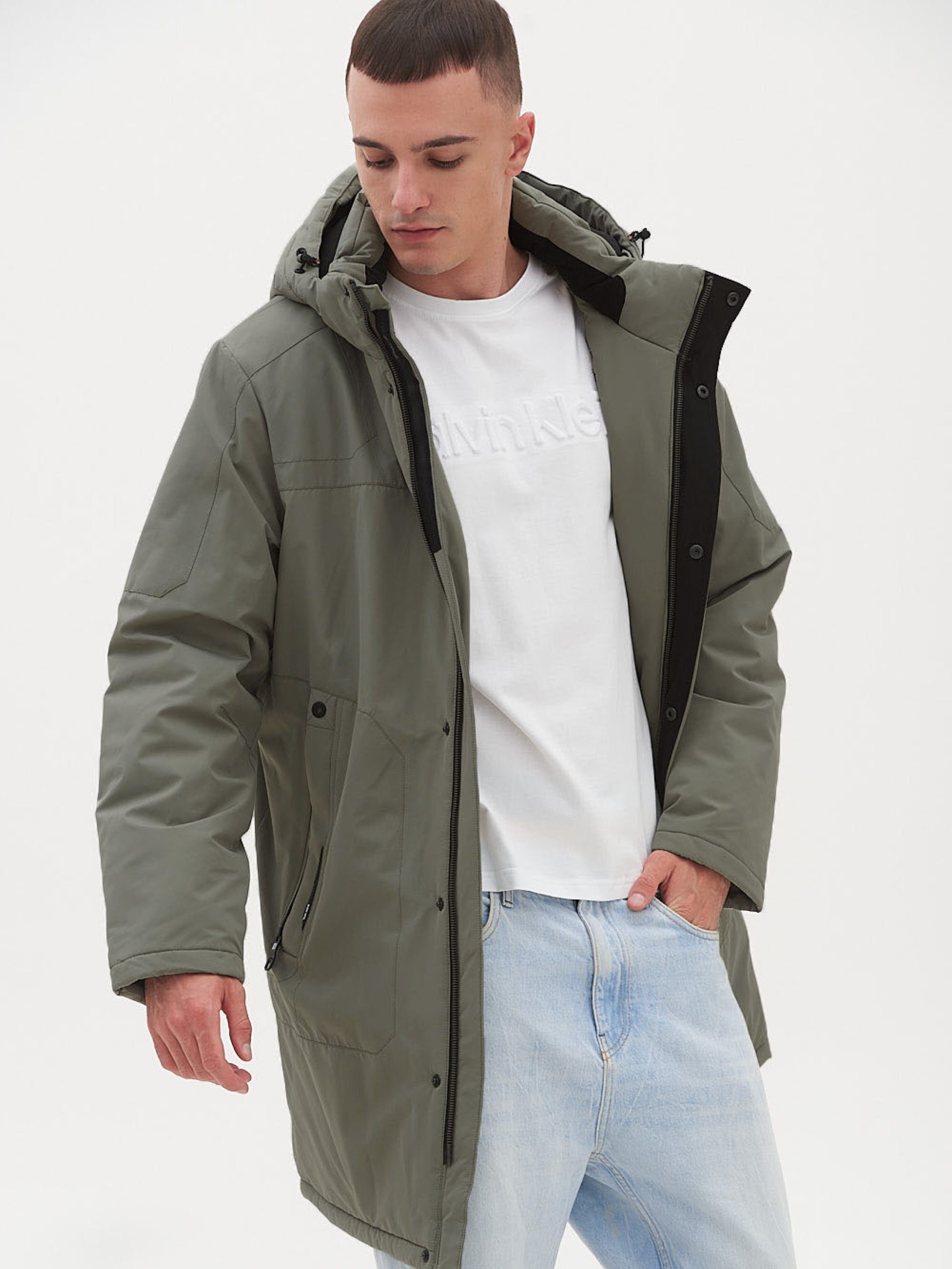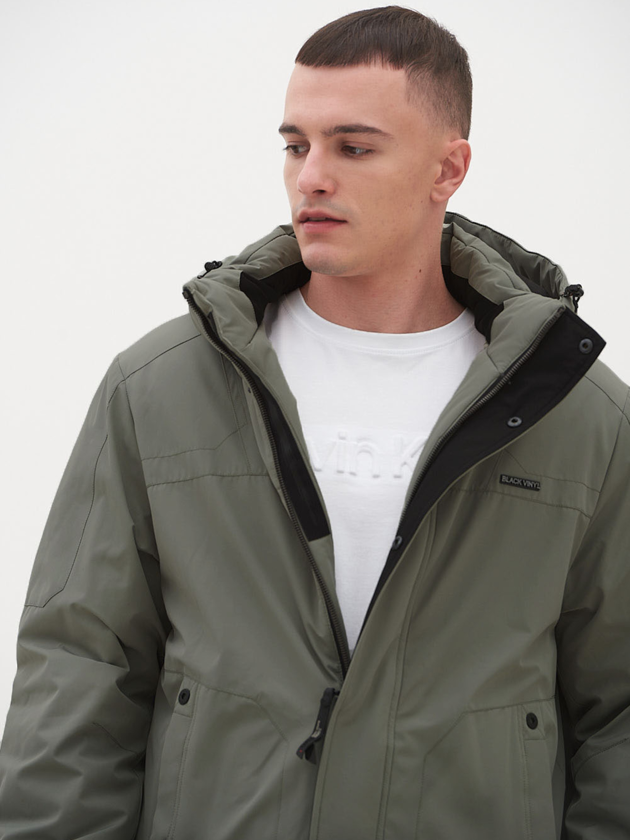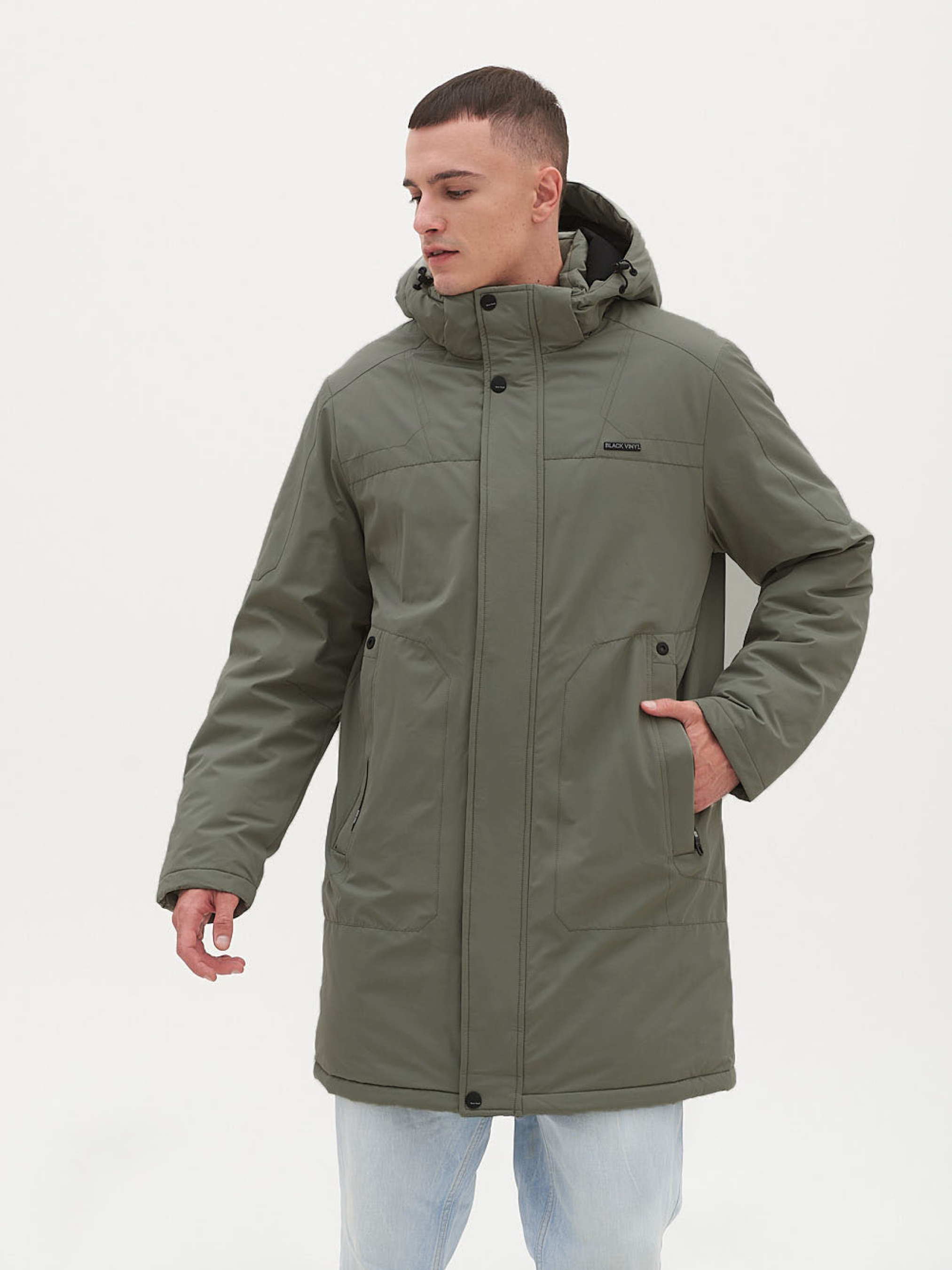 Подовжена чоловіча куртка. Свободу в русі та комфорт гарантує тканина з ефектом стрейч. Комір стійка з флісовою обробкою, знімний регульований капюшон, центральна блискавка, дві нагрудні кишені на відкритій ковзаючій блискавці, на рукаві брендований принт, дві врізні бічні кишені на кнопках, дві внутрішні кишені, одна з них з отвором для навушників, внутрішня куліска, що регулює обсяг талії. У колекції BLACK VINYL застосовані найсучасніші розробки та технології. Синтетичний утеплювач Thinsulate, мембранні тканини, які чудово захищають від вітру, не бояться води та у прямому розумінні дихають. Теплозберігаючі тканини для підкладу з власною технологією Cold Stop, Склад: Лицьовий матеріал: водовідштовхувальна тканина 82% поліестер, 18% бавовна. Підкладка: 100% поліестер. Наповнювач : Thinsulate