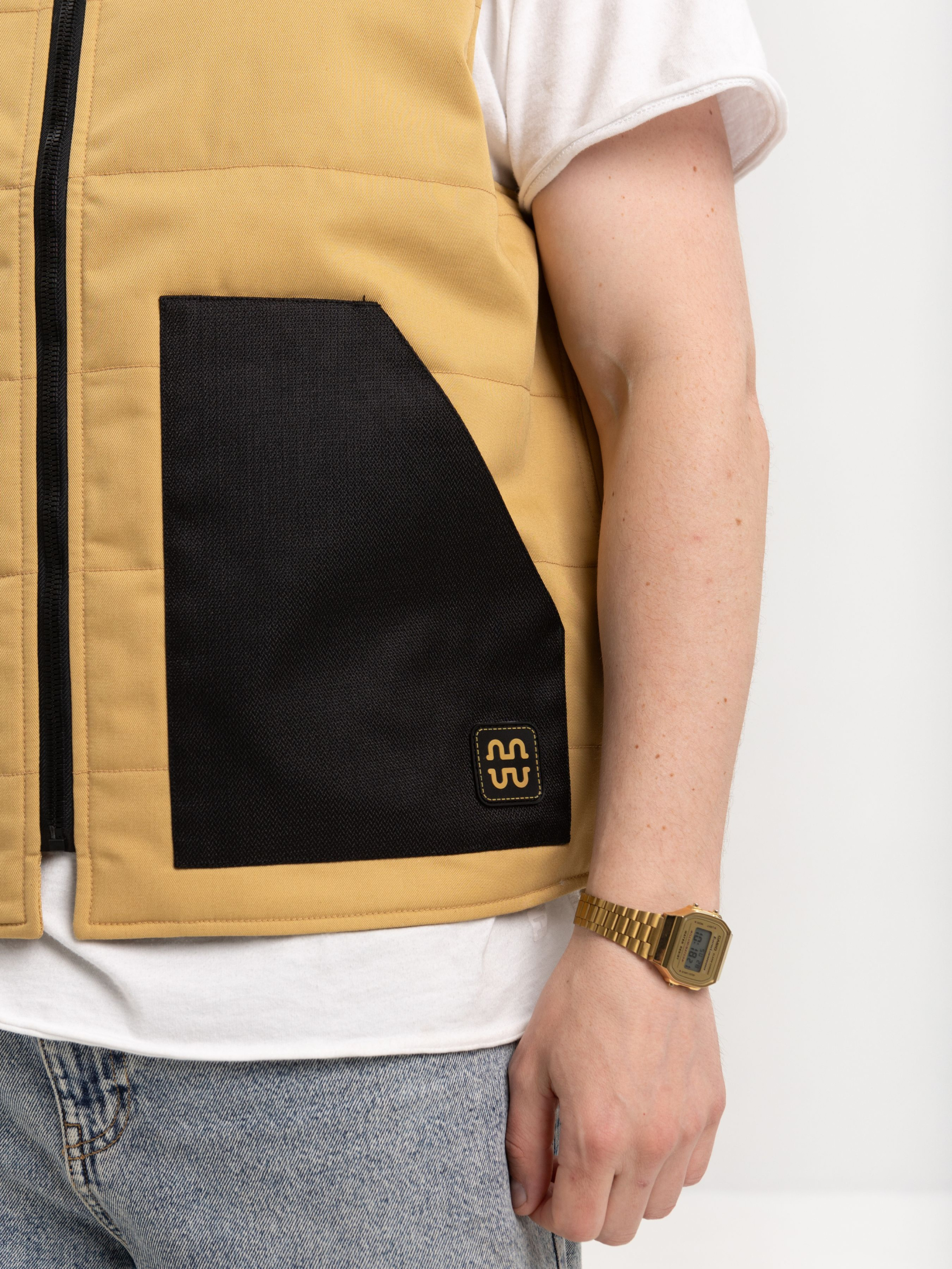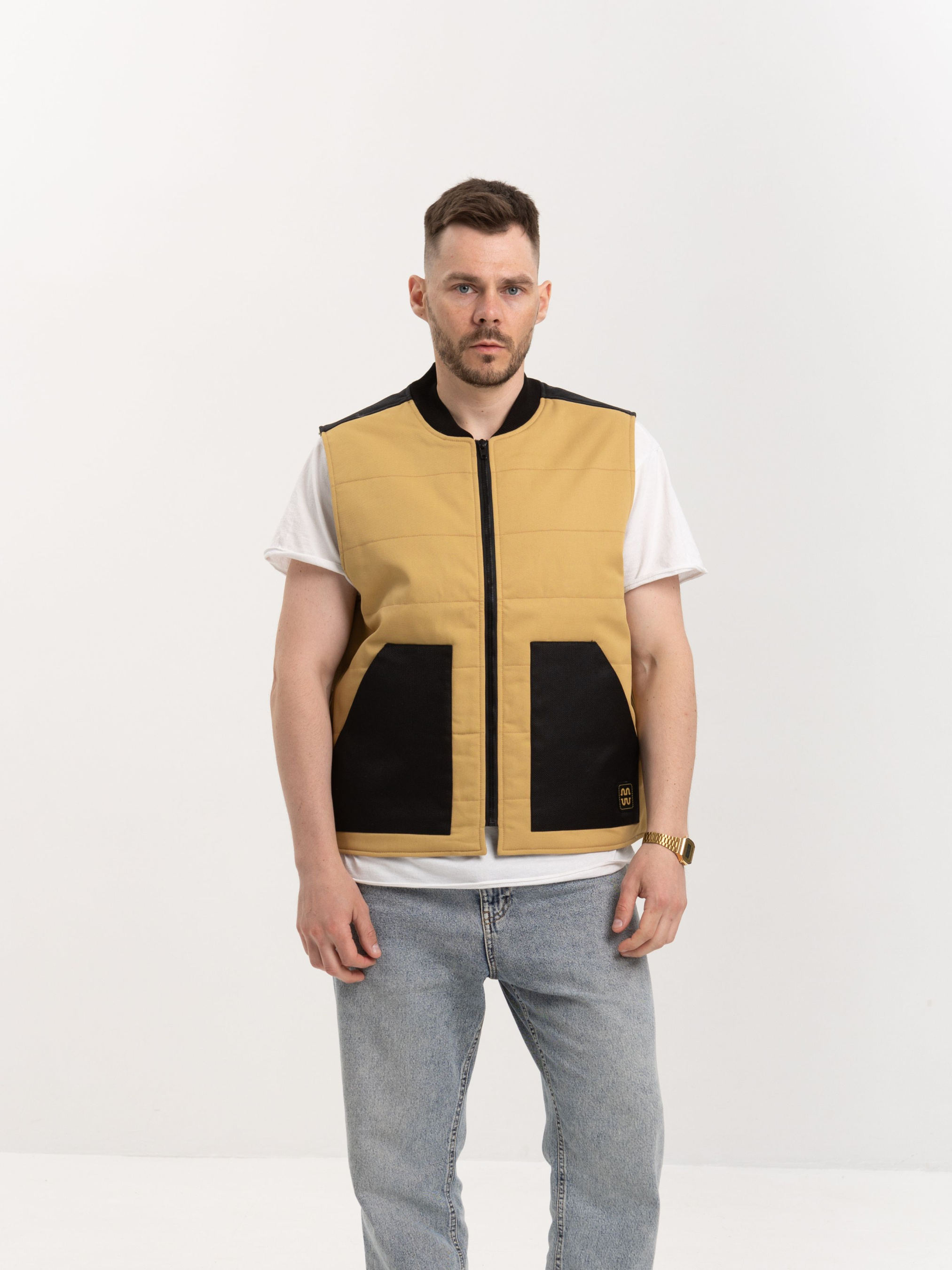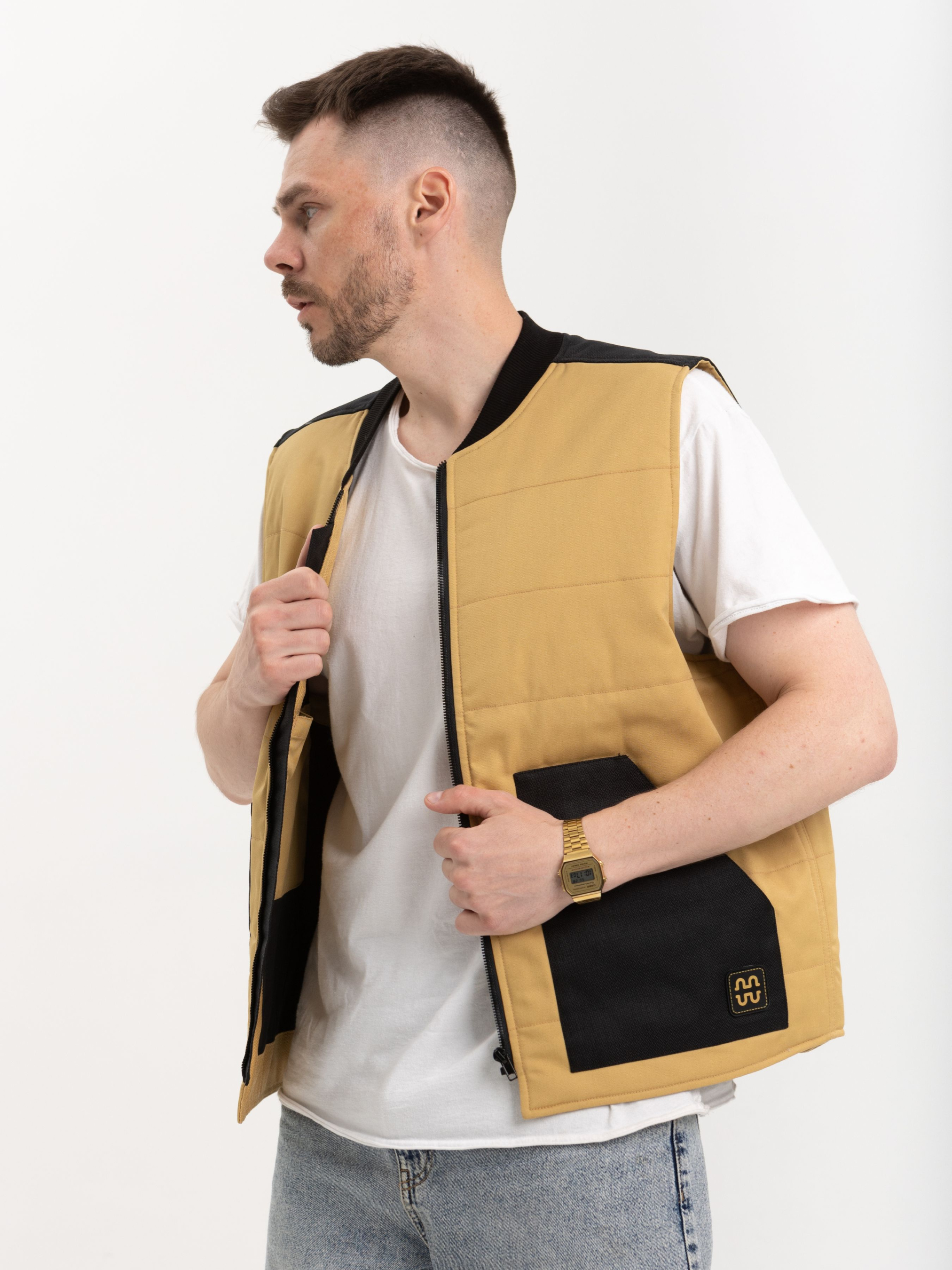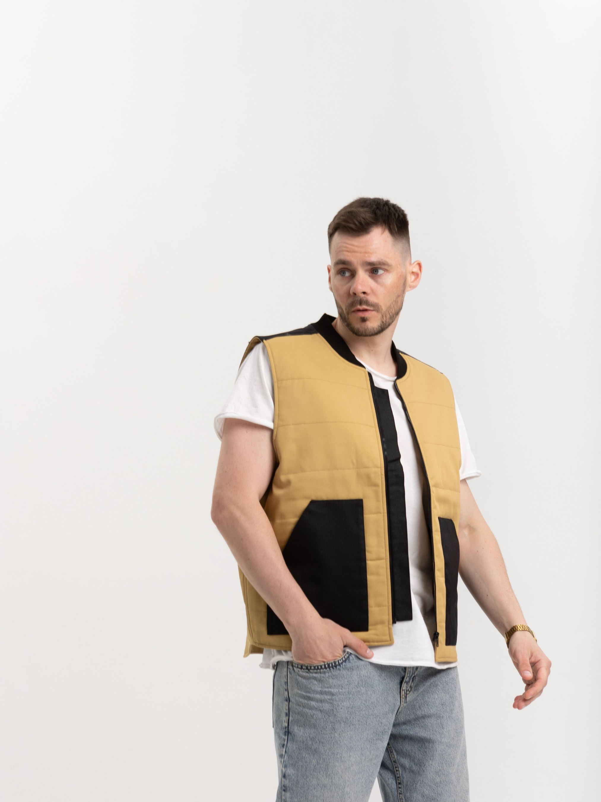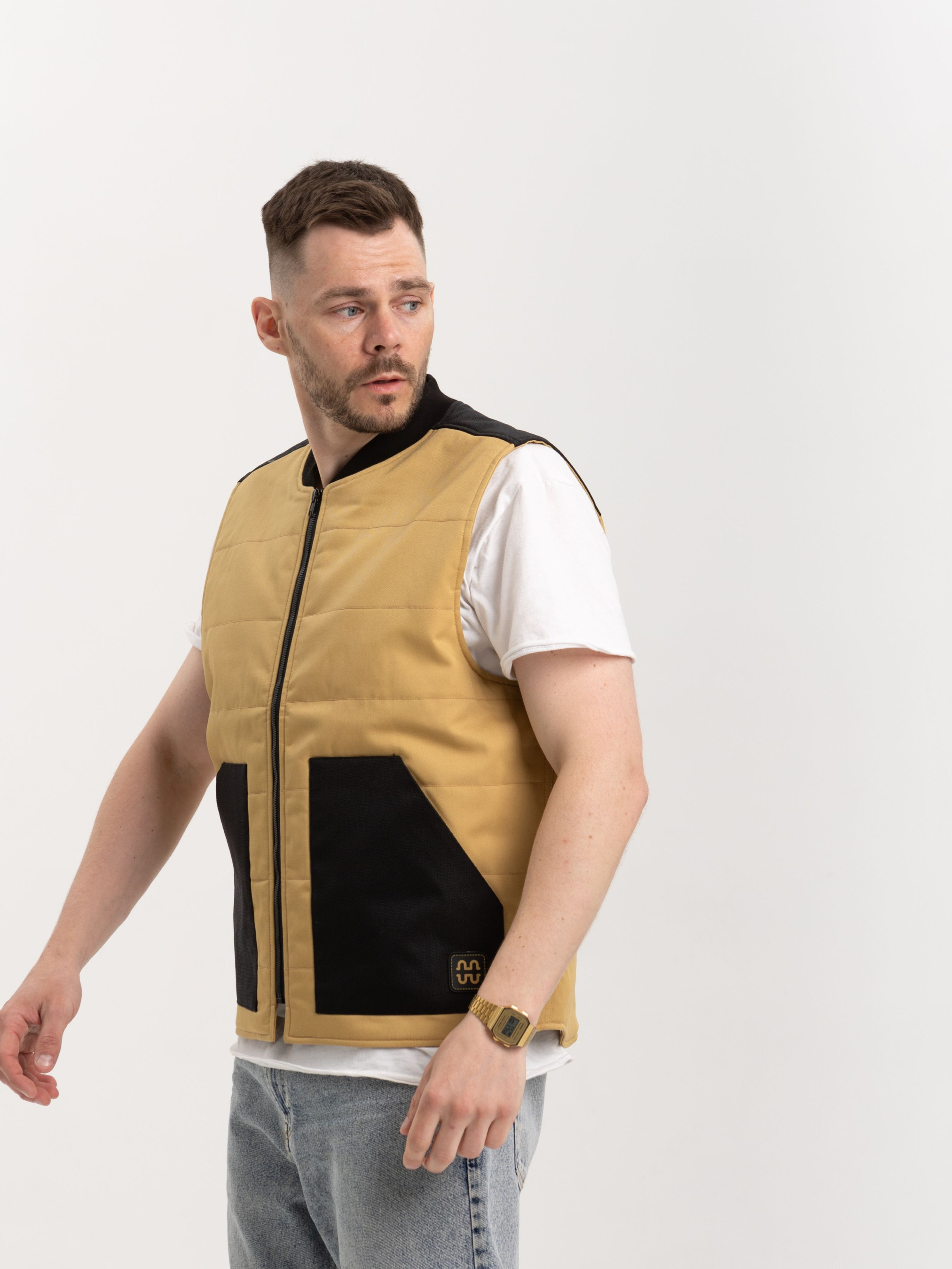 Функціональна жилетка від HAUBERT у стриманому пісочному кольорі — практичне рішення для повсякденного міського стилю. Контрастні чорні вставки з кордури на плечах і кишенях підкреслюють витриманий дизайн і забезпечують додаткову зносостійкість. Модель обладнана центральною блискавкою, двома великими зовнішніми кишенями та внутрішніми кишенями на липучках. Ідеальний варіант для прогулянок, поїздок або роботи на відкритому повітрі в прохолодну пору року.