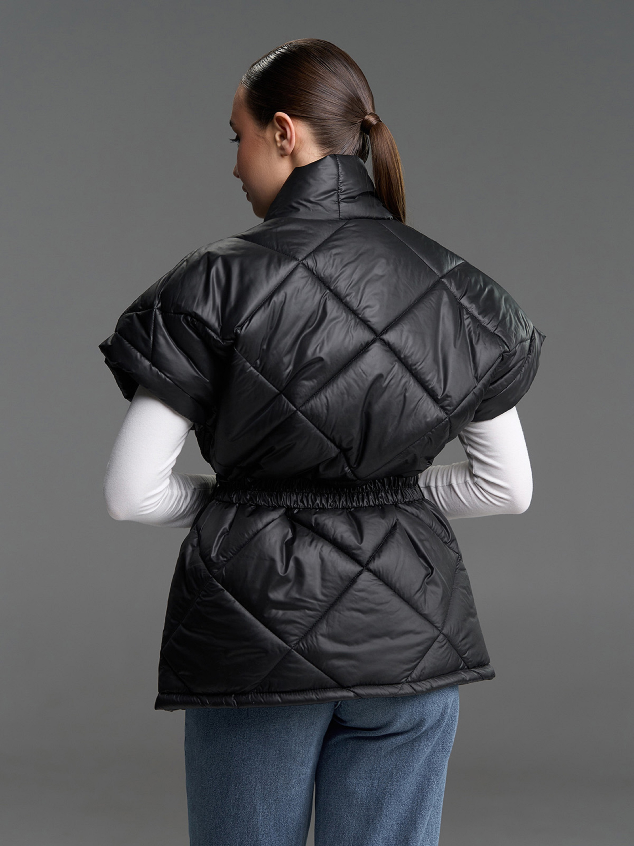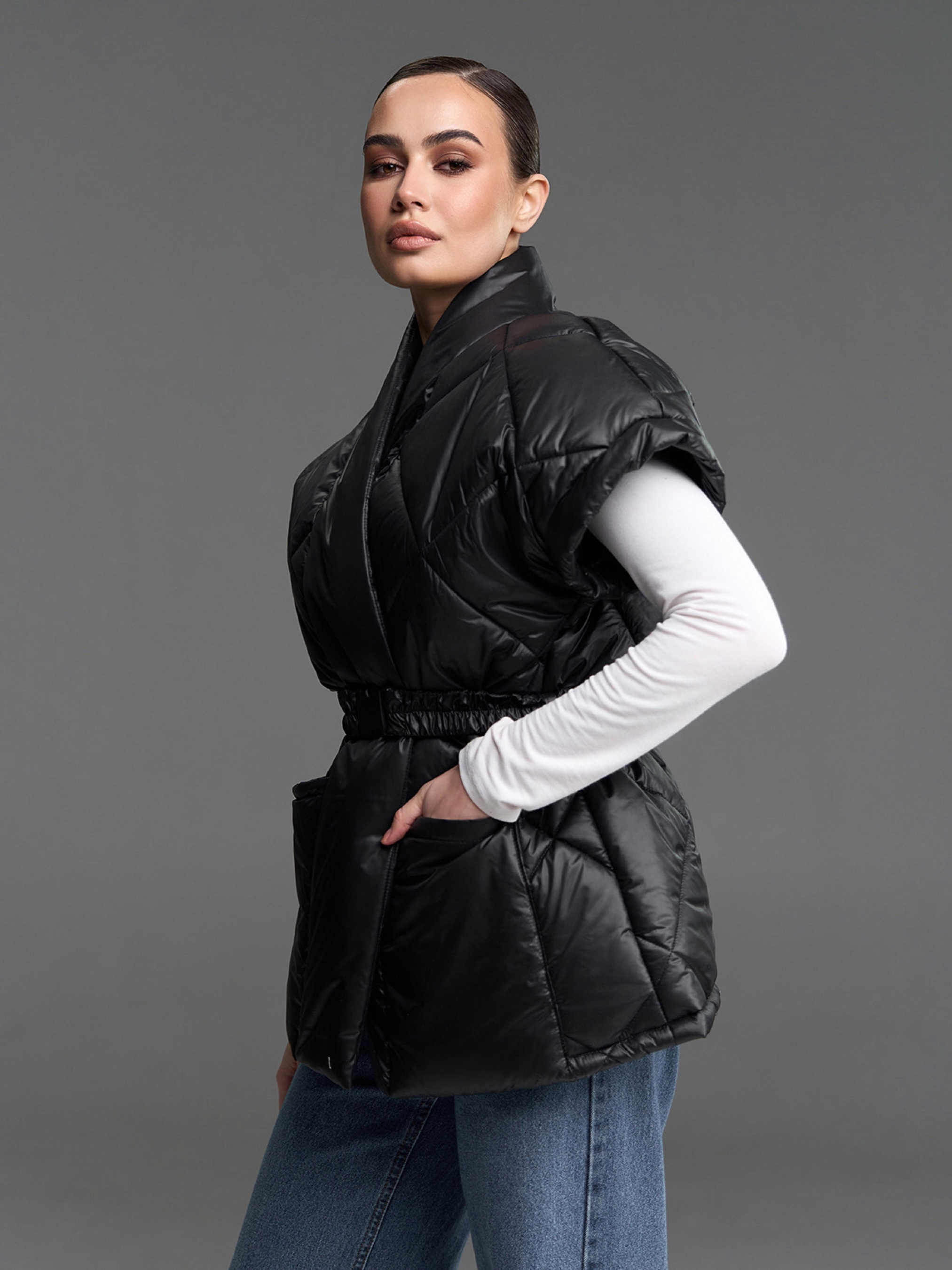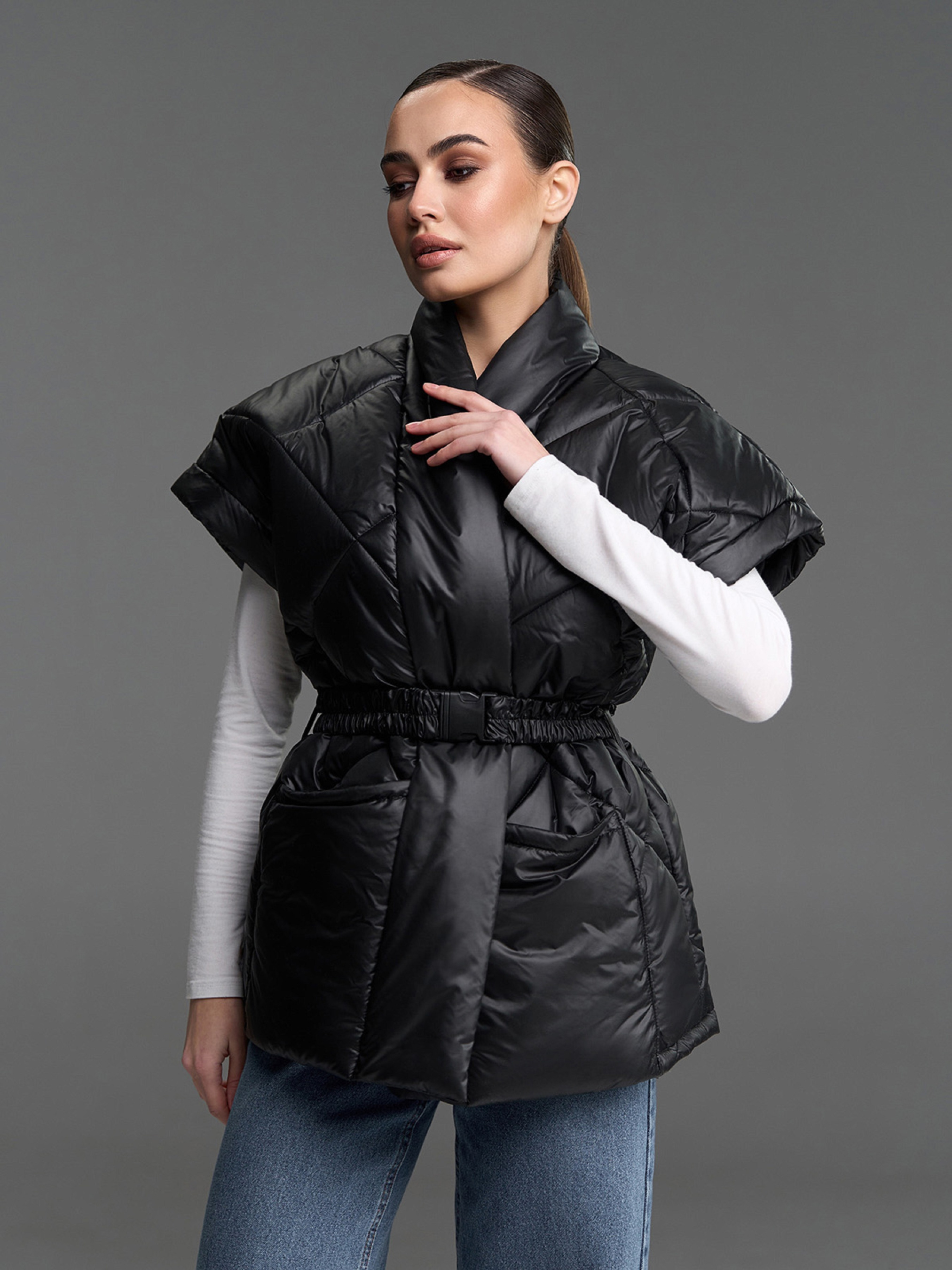 Черная жилетка кроя на запах с широкими плечами и съемным эластичным поясом с фастексом. Модель свободного удлиненного кроя с накладными карманами. Жилетка выполнена из стеганой плащевки на синтепоне. Полуобхват: Грудь: S (61), M (63), L (65), XL (67), Длина изделия - 73, Ткань: Низкой эластичности.